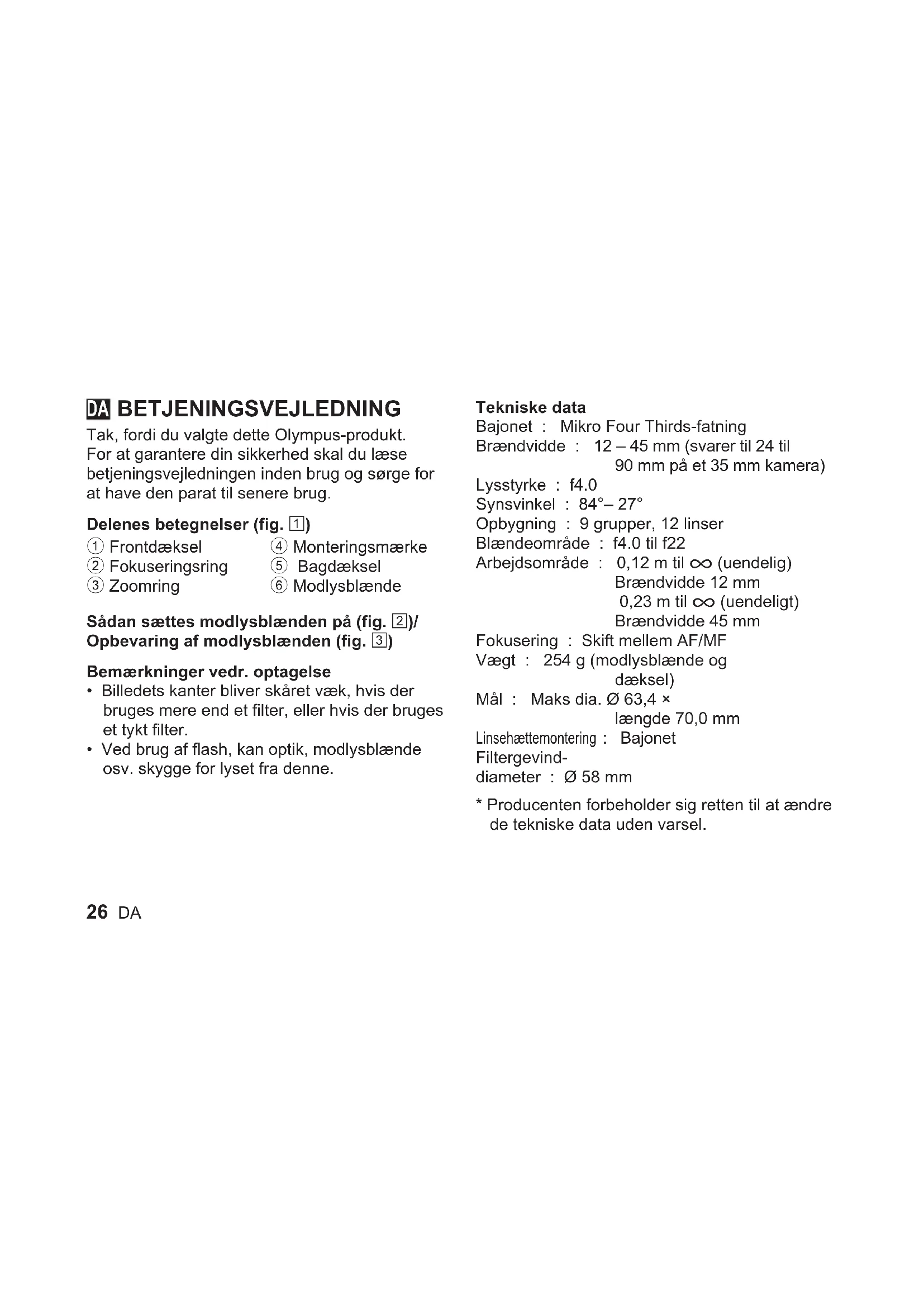 - Ved brug af flash, kan optik, modlysblænde osv. skygge for lyset fra denne. Tekniske data Bajonet : Mikro Four Thirds-fatning Brændvidde : 12 – 45 mm (svarer til 24 til 90 mm på et 35 mm kamera) Lysstyrke : f4.0 Synsvinkel : 84°– 27° Opbygning : 9 grupper, 12 linser Blændeområde : f4.0 til f22 Arbejdsområde : 0,12 m til ) (uendelig) Brændvidde 12 mm 0,23 m til ) (uendeligt) Brændvidde 45 mm Fokusering : Skift mellem AF/MF Vægt : 254 g (modlysblænde og dæksel) Mål : Maks dia. Ø 63,4 × længde 70,0 mm Linsehættemontering : Bajonet Filtergevind- diameter : Ø 58 mm