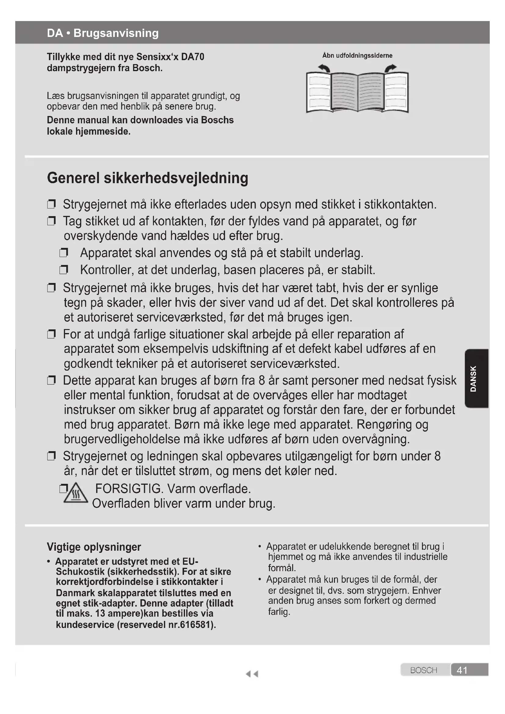 FORSIGTIG. Varm overade. Overaden bliver varm under brug. DA • Brugsanvisning Tillykke med dit nye Sensixx‘x DA70 dampstrygejern fra Bosch. Læs brugsanvisningen til apparatet grundigt, og opbevar den med henblik på senere brug. Denne manual kan downloades via Boschs lokale hjemmeside. Åbn udfoldningssiderne Vigtige oplysninger