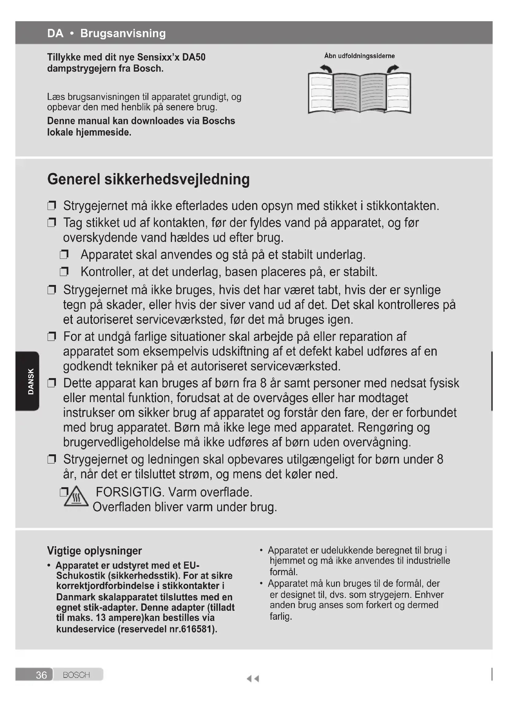FORSIGTIG. Varm overade. Overaden bliver varm under brug. DA • Brugsanvisning Tillykke med dit nye Sensixx’x DA50 dampstrygejern fra Bosch. Læs brugsanvisningen til apparatet grundigt, og opbevar den med henblik på senere brug. Denne manual kan downloades via Boschs lokale hjemmeside. Åbn udfoldningssiderne Vigtige oplysninger