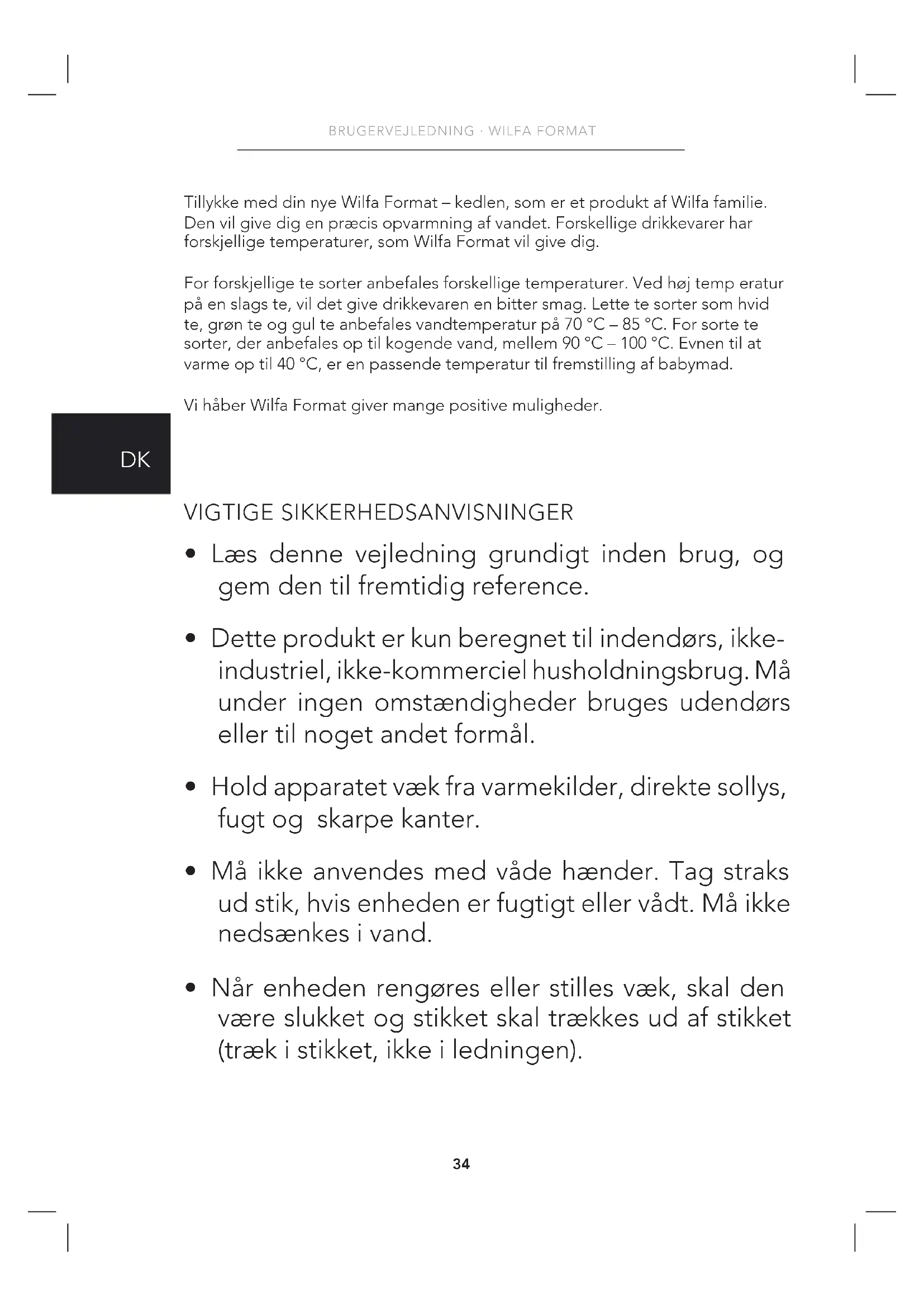 Tillykke med din nye Wilfa Format – kedlen, som er et produkt af Wilfa familie. Den vil give dig en præcis opvarmning af vandet. Forskellige drikkevarer har forskjellige temperaturer, som Wilfa Format vil give dig. For forskjellige te sorter anbefales forskellige temperaturer. Ved høj temp eratur på en slags te, vil det give drikkevaren en bitter smag. Lette te sorter som hvid te, grøn te og gul te anbefales vandtemperatur på 70 °C – 85 °C. For sorte te sorter, der anbefales op til kogende vand, mellem 90 °C – 100 °C. Evnen til at varme op til 40 °C, er en passende temperatur til fremstilling af babymad. Vi håber Wilfa Format giver mange positive muligheder. VIGTIGE SIKKERHEDSANVISNINGER