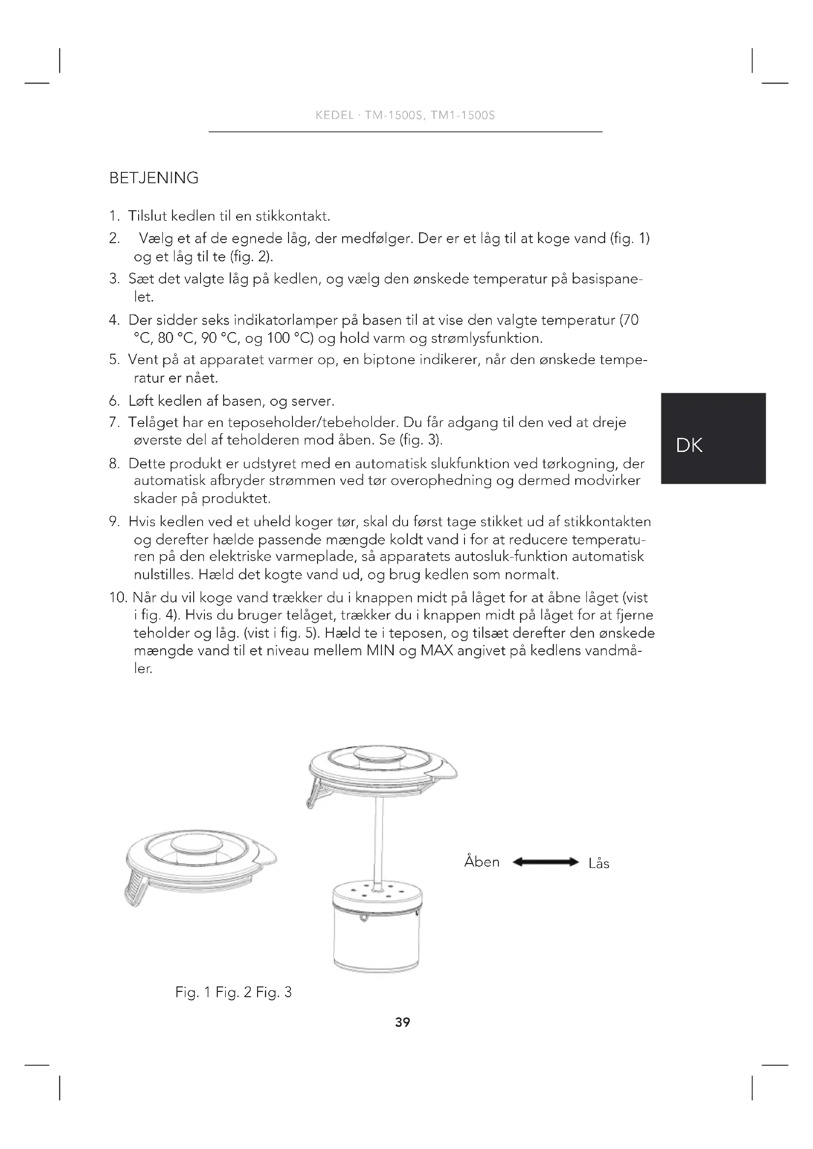 ig.4).Hvisdubrugertelåget,trækkerduiknappenmidtpålågetforatfjerne teholderoglåg.(vistig.5).Hældteiteposen,ogtilsætderefterdenønskede mængde vand til et niveau mellem MIN og MAX angivet på kedlens vandmå- ler. Lås Åben Fig. 1 Fig. 2 Fig. 340 BETJENINGSVEJLEDNING · CHA