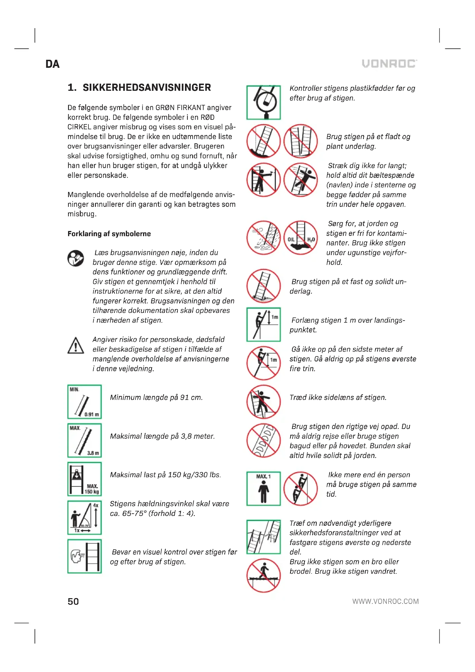 Minimum længde på 91 cm. Maksimal længde på 3,8 meter. Maksimal last på 150 kg/330 lbs. Stigens hældningsvinkel skal være ca. 65-75° (forhold 1: 4). Bevar en visuel kontrol over stigen før og efter brug af stigen. Kontroller stigens plastikfødder før og efter brug af stigen. Brug stigen på et fladt og plant underlag. Stræk dig ikke for langt; hold altid dit bæltespænde (navlen) inde i stenterne og begge fødder på samme trin under hele opgaven. Sørg for, at jorden og stigen er fri for kontami- nanter. Brug ikke stigen under ugunstige vejrfor- hold. Brug stigen på et fast og solidt un- derlag. Forlæng stigen 1 m over landings- punktet. Gå ikke op på den sidste meter af stigen. Gå aldrig op på stigens øverste fire trin. Træd ikke sidelæns af stigen. Brug stigen den rigtige vej opad. Du må aldrig rejse eller bruge stigen bagud eller på hovedet. Bunden skal altid hvile solidt på jorden. Ikke mere end én person må bruge stigen på samme tid. Træf om nødvendigt yderligere sikkerhedsforanstaltninger ved at fastgøre stigens øverste og nederste del. Brug ikke stigen som en bro eller brodel. Brug ikke stigen vandret.DA