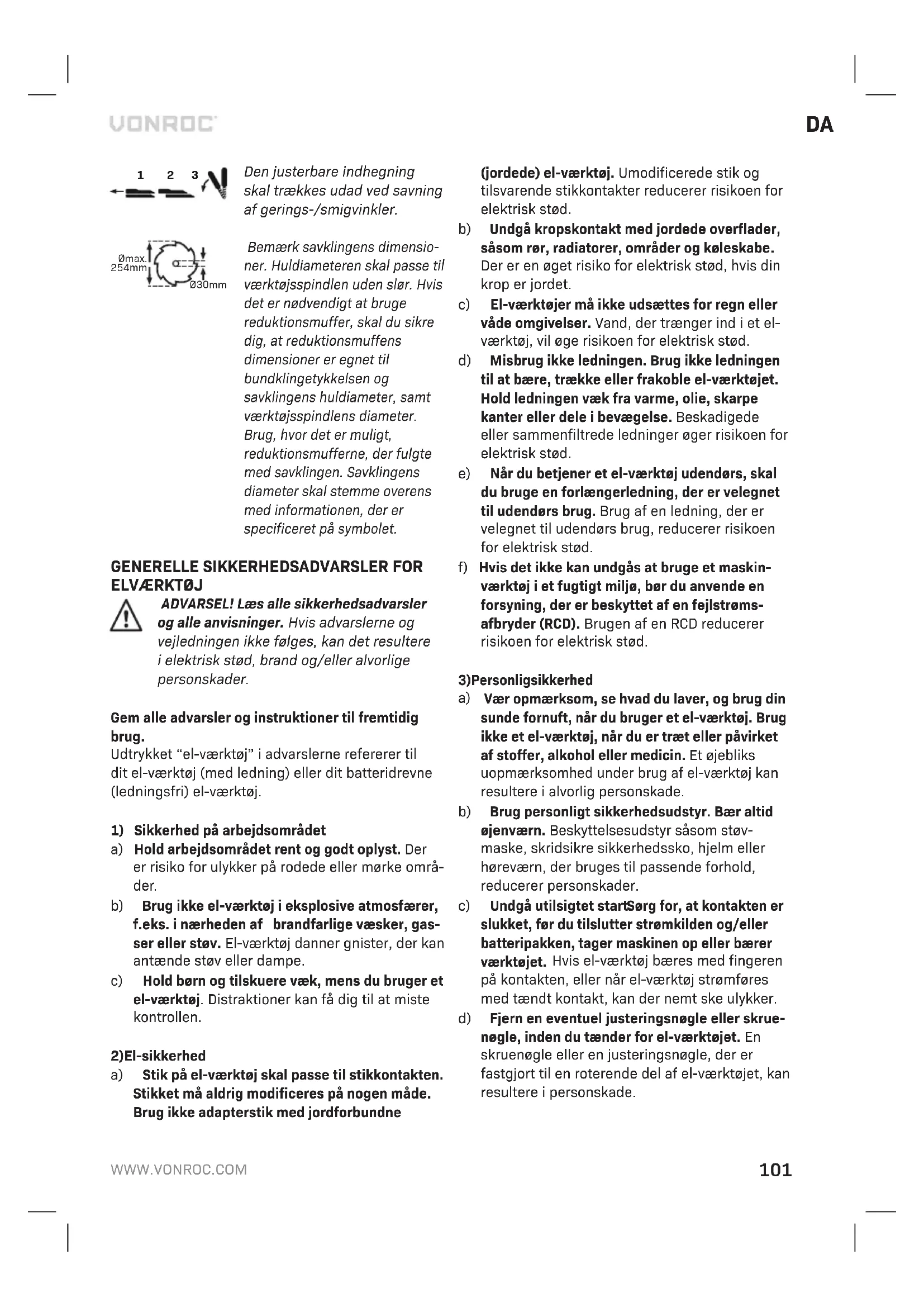 - Flyt geringssaven frem og tilbage, så olien bliver spredt over hele skinnerne. MILJØ Defekte og/eller bortskaffede elektriske og elektroniske apparater skal afleveres på en passende genbrugsstation. Kun for lande iEU Maskinværktøj må ikke bortskaffes sammen med husholdningsaffald. Ifølge EU-direktiv 2012/19/EU om affald af elektrisk og elektronisk udstyr og dets gennemførelse iden nationale lovgivning skal ma- skinværktøjer, der ikke længere anvendes, afleveres separat og bortskaffes på en miljøvenlig måde. GARANTI VONROC-produkter er udviklet til de højeste kva- litetsstandarder og er garanteret fri for defekter ibåde materialer og udførelse iden periode, der er retsligt angivet fra datoen for det originale køb. Hvis produktet skulle udvikle fejl idenne periode på grund af defekt materiale og/eller udførelse, bedes du kontakte VONROC direkte. Følgende omstændigheder er udelukket fra denne garanti: