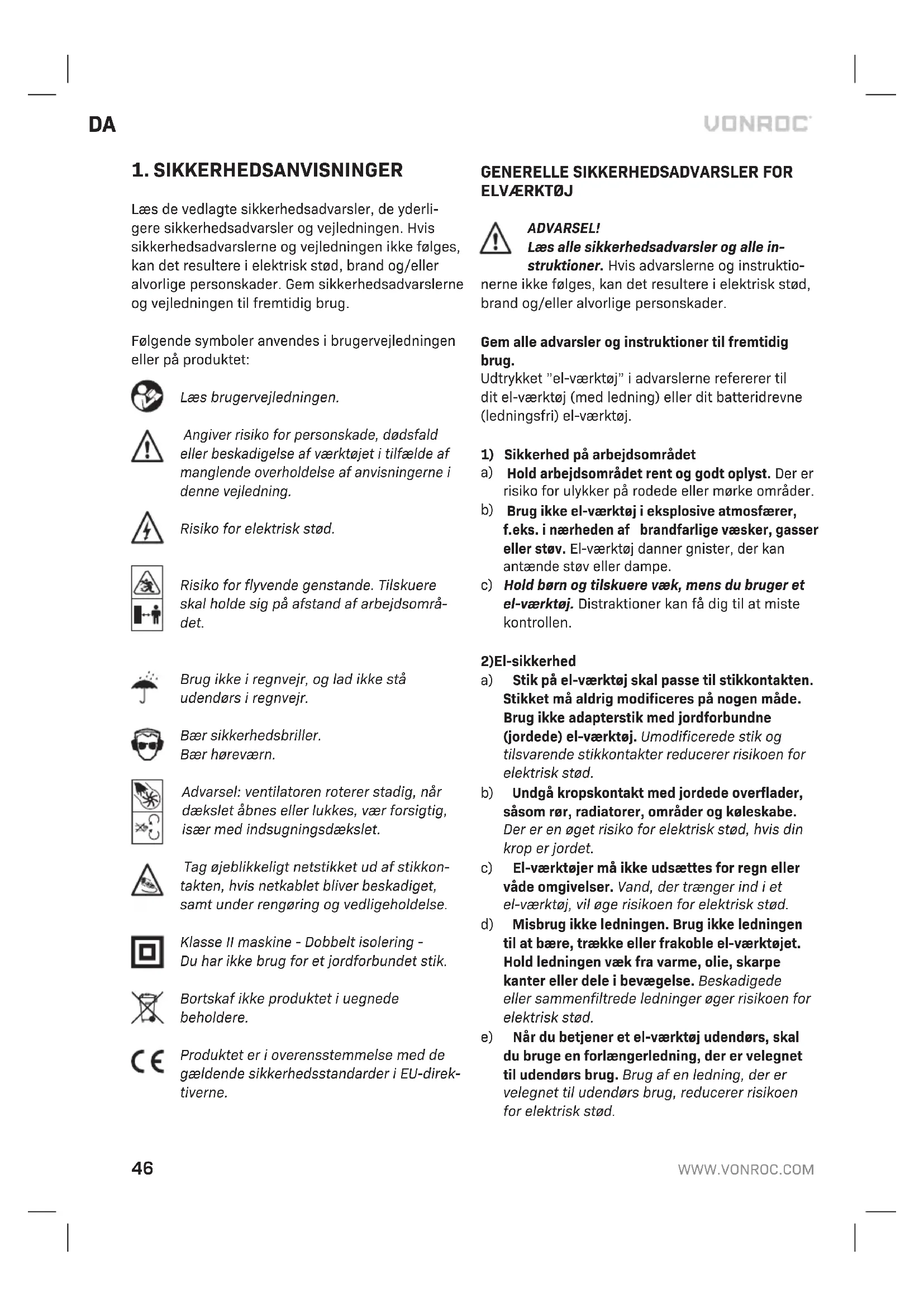 Læs de vedlagte sikkerhedsadvarsler, de yderli- gere sikkerhedsadvarsler og vejledningen. Hvis sikkerhedsadvarslerne og vejledningen ikke følges, kan det resultere i elektrisk stød, brand og/eller alvorlige personskader. Gem sikkerhedsadvarslerne og vejledningen til fremtidig brug. Følgende symboler anvendes i brugervejledningen eller på produktet: Læs brugervejledningen. Angiver risiko for personskade, dødsfald eller beskadigelse af værktøjet i tilfælde af manglende overholdelse af anvisningerne i denne vejledning. Risiko for elektrisk stød. Risiko for flyvende genstande. Tilskuere skal holde sig på afstand af arbejdsområ- det. Brug ikke i regnvejr, og lad ikke stå udendørs i regnvejr. Bær sikkerhedsbriller. Bær høreværn. Advarsel: ventilatoren roterer stadig, når dækslet åbnes eller lukkes, vær forsigtig, især med indsugningsdækslet. Tag øjeblikkeligt netstikket ud af stikkon- takten, hvis netkablet bliver beskadiget, samt under rengøring og vedligeholdelse. Klasse II maskine - Dobbelt isolering - Du har ikke brug for et jordforbundet stik. Bortskaf ikke produktet i uegnede beholdere. Produktet er i overensstemmelse med de gældende sikkerhedsstandarder i EU-direk- tiverne.