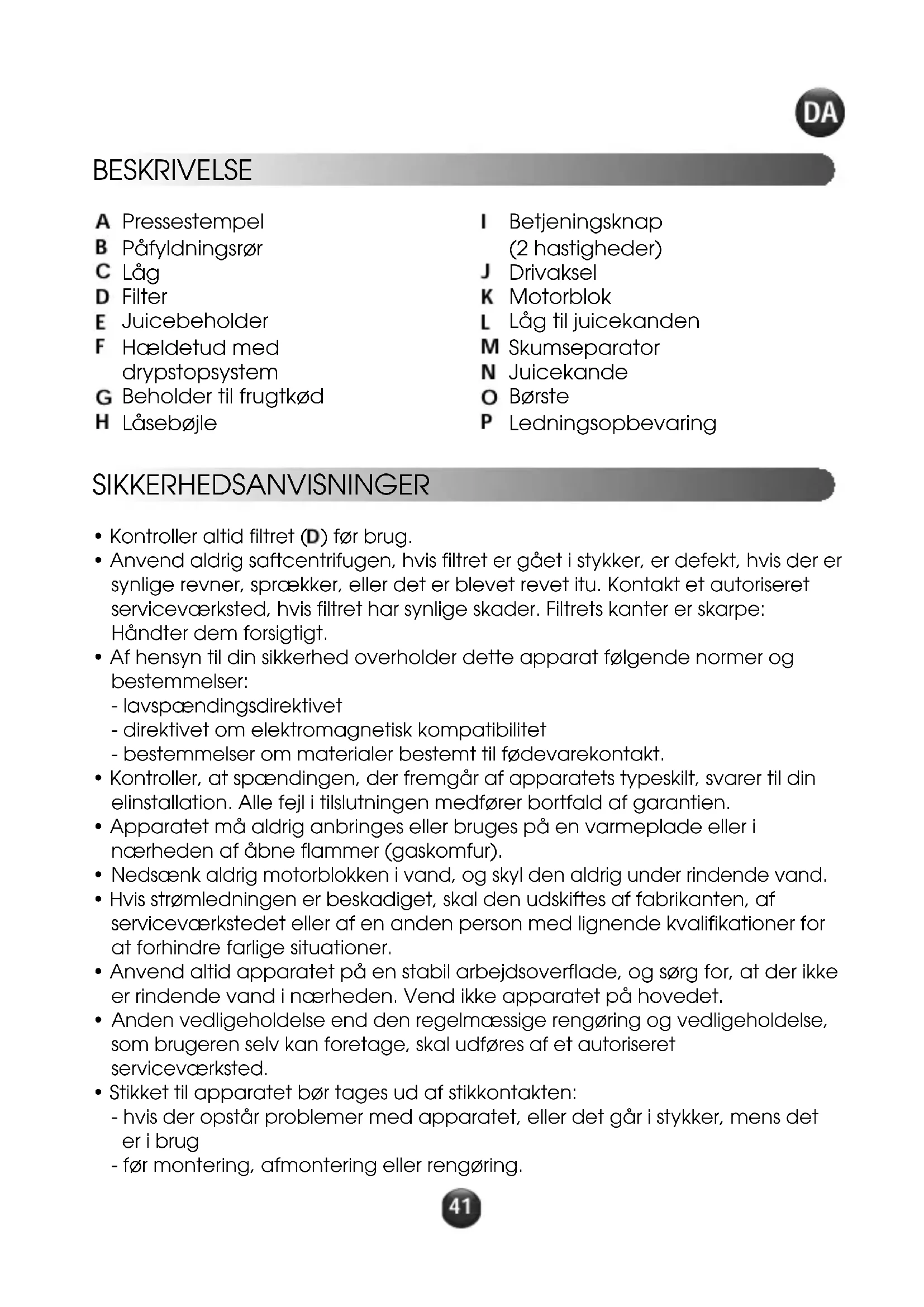 - Afbryd altid strømmen til apparatet efter brug. SIKKERHEDSSYSTEM Apparatet er forsynet med et sikkerhedssystem. Saftcentrifugen kan kun tændes, hvis låget (