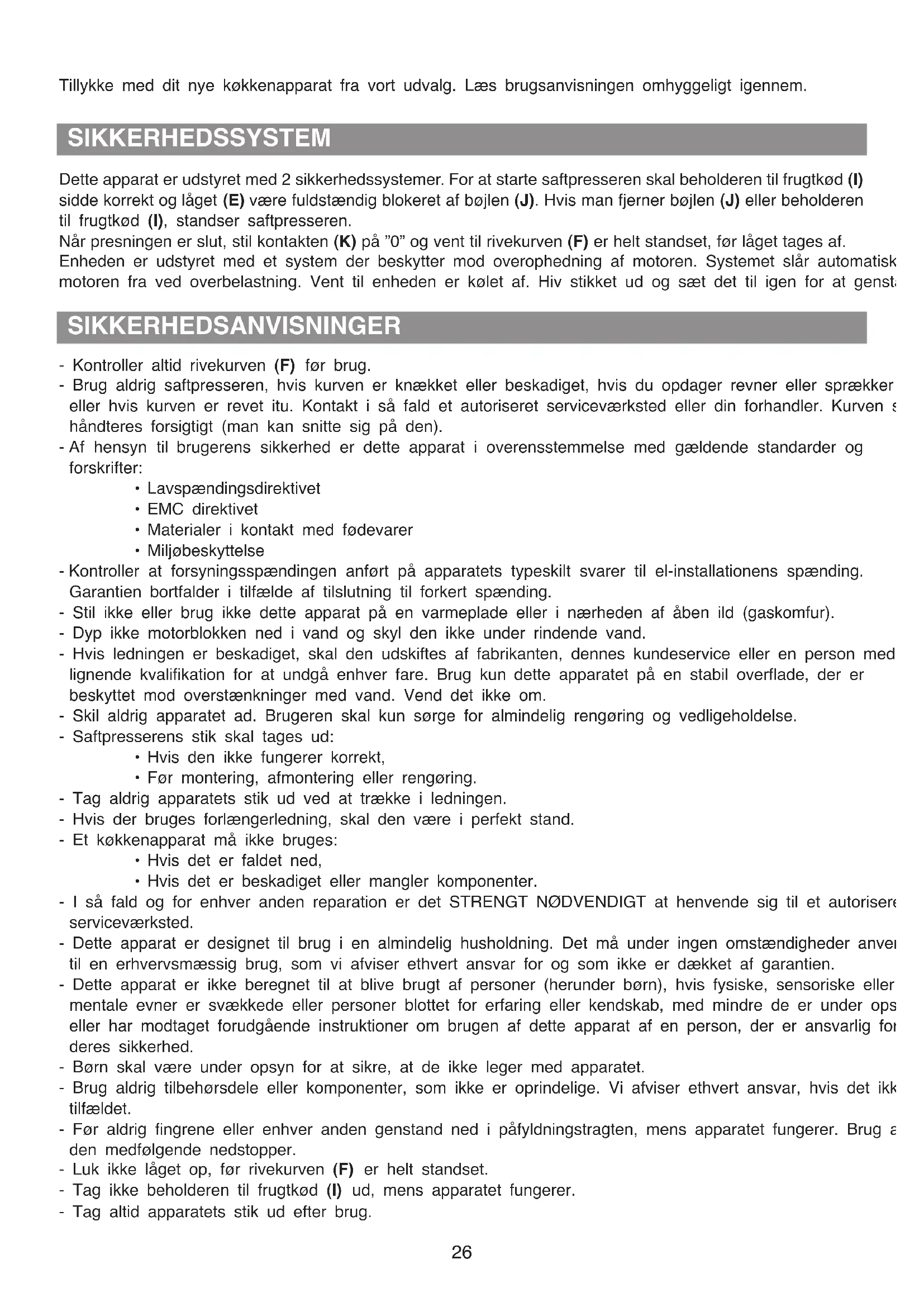 Tillykke med dit nye køkkenapparat fra vort udvalg. Læs brugsanvisningen omhyggeligt igennem. SIKKERHEDSANVISNINGER - Kontroller altid rivekurven (F) før brug. - Brug aldrig saftpresseren, hvis kurven er knækket eller beskadiget, hvis du opdager revner eller sprækker eller hvis kurven er revet itu. Kontakt i så fald et autoriseret serviceværksted eller din forhandler. Kurven skal håndteres forsigtigt (man kan snitte sig på den). - Af hensyn til brugerens sikkerhed er dette apparat i overensstemmelse med gældende standarder og forskrifter: