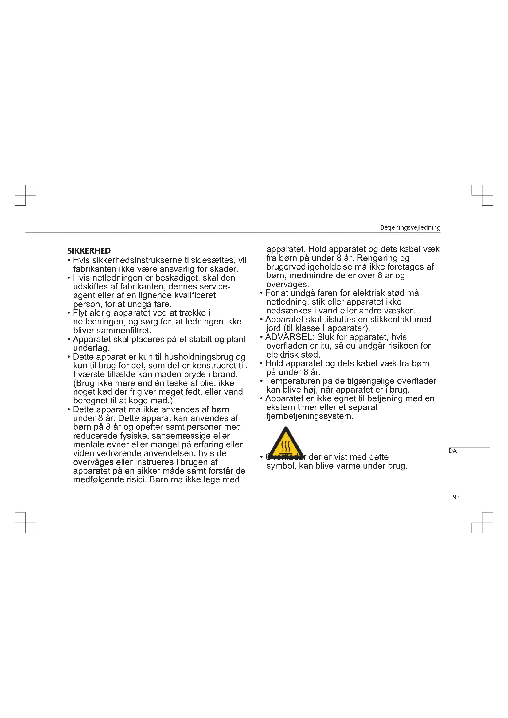 - Temperaturen på de tilgængelige overflader kan blive høj, når apparatet er i brug.