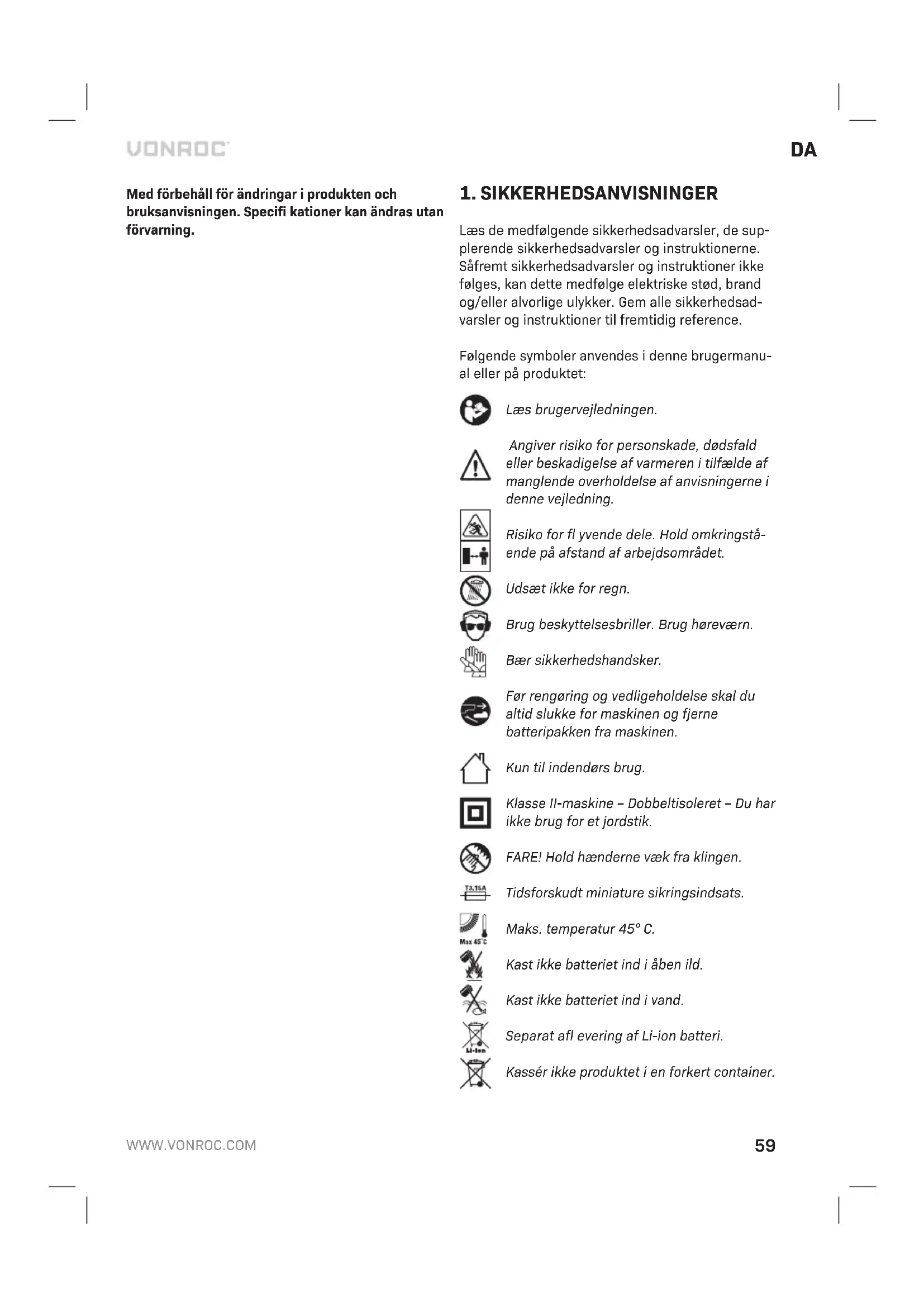 - Brug kun reservedele og tilbehør leveret af Von- roc. Hvis der bruges andet tilbehør end det, der leveres eller anbefales af Vonroc, ugyldiggøres din garanti, og det kan være farligt.