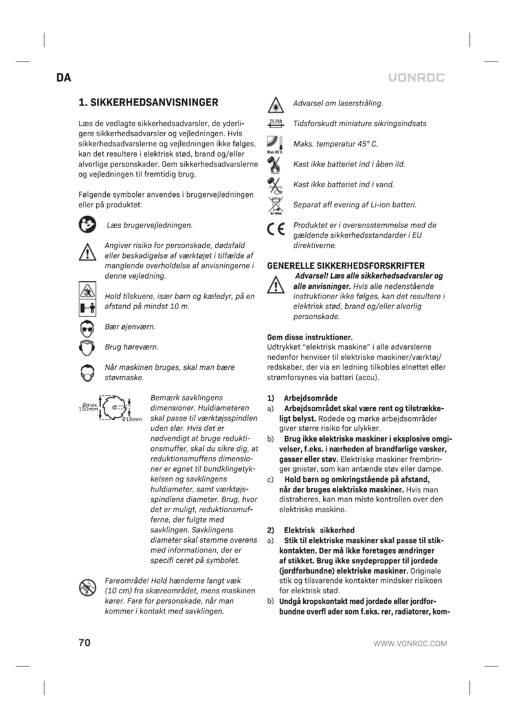 Sluk altid for maskinen inden rengøring og vedligeholdelse. Rengør maskinbeklædningerne regelmæssigt med en blød klud, helst efter hver anvendelse. Sørg for, at der ikke er støv eller snavs i ventilationsåbnin- gerne. Fjern snavs, der sidder meget godt fast, med en blød klud, der er fugtet i sæbevand. Brug ikke opløsningsmidler, som f.eks. benzin, sprit, ammoniak osv. Kemikalier som disse beskadiger de syntetiske komponenter. MILJØ Defekte og/eller bortskaffede elektriske og elektroniske apparater skal afl everes på en passende genbrugsstation. Kun for lande i EU Maskinværktøj må ikke bortskaffes sammen med husholdningsaffald. Ifølge EU-direktiv 2012/19/ EU om affald af elektrisk og elektronisk udstyr og dets gennemførelse i den nationale lovgivning skal maskinværktøjer, der ikke længere anvendes, afl everes separat og bortskaffes på en miljøvenlig måde. GARANTIVILKAR VONROC produkter er udviklet efter de hojeste kvalitetsstandarder og er garanteret fri for mangler i savel materialer som udforelse i den lovpligtige periode, der starter fra datoen for det oprindelige kob. Skulle produktet udvikle nogen fejl i lobet af denne periode pa grund af defekte materialer og/ eller fabrikationsfejl, sa kontakt VONROC direkte. De folgende forhold er udelukket fra denne garanti: