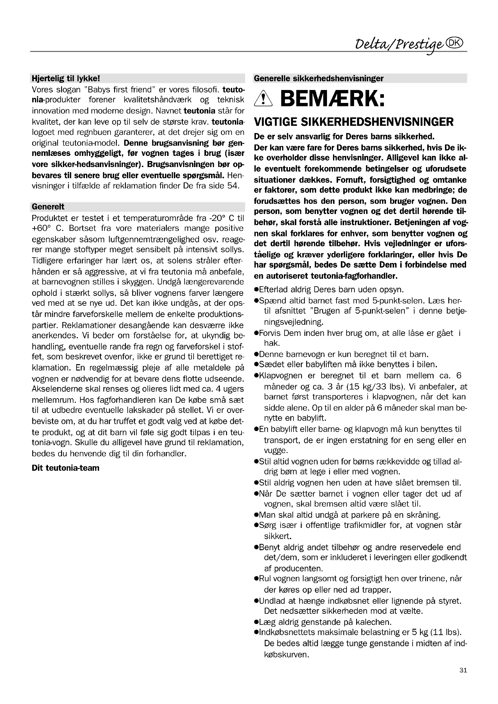 Generelt Produktet er testet i et temperaturområde fra -20° C til +60° C. Bortset fra vore materialers mange positive egenskaber såsom luftgennemtrængelighed osv. reage- rer mange stoftyper meget sensibelt på intensivt sollys. Tidligere erfaringer har lært os, at solens stråler efter- hånden er så aggressive, at vi fra teutonia må anbefale, at barnevognen stilles i skyggen. Undgå længerevarende ophold i stærkt sollys, så bliver vognens farver længere ved med at se nye ud. Det kan ikke undgås, at der ops- tår mindre farveforskelle mellem de enkelte produktions- partier. Reklamationer desangående kan desværre ikke anerkendes. Vi beder om forståelse for, at ukyndig be- handling, eventuelle rande fra regn og farveforskel i stof- fet, som beskrevet ovenfor, ikke er grund til berettiget re- klamation. En regelmæssig pleje af alle metaldele på vognen er nødvendig for at bevare dens flotte udseende. Akselenderne skal renses og olieres lidt med ca. 4 ugers mellemrum. Hos fagforhandleren kan De købe små sæt til at udbedre eventuelle lakskader på stellet. Vi er over- beviste om, at du har truffet et godt valg ved at købe det- te produkt, og at dit barn vil føle sig godt tilpas i en teu- tonia-vogn. Skulle du alligevel have grund til reklamation, bedes du henvende dig til din forhandler. Dit teutonia-team Generelle sikkerhedshenvisninger N BEMÆRK: VIGTIGE SIKKERHEDSHENVISNINGER De er selv ansvarlig for Deres barns sikkerhed. Der kan være fare for Deres barns sikkerhed, hvis De ik- ke overholder disse henvisninger. Alligevel kan ikke al- le eventuelt forekommende betingelser og uforudsete situationer dækkes. Fornuft, forsigtighed og omtanke er faktorer, som dette produkt ikke kan medbringe; de forudsættes hos den person, som bruger vognen. Den person, som benytter vognen og det dertil hørende til- behør, skal forstå alle instruktioner. Betjeningen af vog- nen skal forklares for enhver, som benytter vognen og det dertil hørende tilbehør. Hvis vejledninger er ufors- tåelige og kræver yderligere forklaringer, eller hvis De har spørgsmål, bedes De sætte Dem i forbindelse med en autoriseret teutonia-fagforhandler. ● Efterlad aldrig Deres barn uden opsyn. ● Spænd altid barnet fast med 5-punkt-selen. Læs her- til afsnittet ”Brugen af 5-punkt-selen” i denne betje- ningsvejledning. ● Forvis Dem inden hver brug om, at alle låse er gået i hak. ● Denne barnevogn er kun beregnet til et barn. ● Sædet eller babyliften må ikke benyttes i bilen. ● Klapvognen er beregnet til et barn mellem ca. 6 måneder og ca. 3 år (15 kg/33 lbs). Vi anbefaler, at barnet først transporteres i klapvognen, når det kan sidde alene. Op til en alder på 6 måneder skal man be- nytte en babylift. ● En babylift eller barne- og klapvogn må kun benyttes til transport, de er ingen erstatning for en seng eller en vugge. ● Stil altid vognen uden for børns rækkevidde og tillad al- drig børn at lege i eller med vognen. ● Stil aldrig vognen hen uden at have slået bremsen til. ● Når De sætter barnet i vognen eller tager det ud af vognen, skal bremsen altid være slået til. ● Man skal altid undgå at parkere på en skråning. ● Sørg især i offentlige trafikmidler for, at vognen står sikkert. ● Benyt aldrig andet tilbehør og andre reservedele end det/dem, som er inkluderet i leveringen eller godkendt af producenten. ● Rul vognen langsomt og forsigtigt hen over trinene, når der køres op eller ned ad trapper. ● Undlad at hænge indkøbsnet eller lignende på styret. Det nedsætter sikkerheden mod at vælte. ● Læg aldrig genstande på kalechen. ● Indkøbsnettets maksimale belastning er 5 kg (11 lbs). De bedes altid lægge tunge genstande i midten af ind- købskurven. 310 Delta/Prestige ● Vi gør opmærksom på, at burgen af en barnevogn el- ler klapvogn, som ligger udenfor den typiske brug, kan være farlig. Dette produkt egner sig ikke til jogging, væddeløb, skating o.lign. ● Når stellet klappes op eller i, skal De sørge for, at De selv eller andre ikke kommer i klemme. ● Når vognen bæres hen over hindringer (f.eks. trapper), skal man sørge for, at ingen af låsene bliver låst op. ● Ved indstillinger skal De sørge for, at Deres barn ikke befinder sig inden for rækkevidde af de bevægelige de- le. ● En for tung pålæsning, ukorrekt sammenklapning eller brug af ikke-godkendt tilbehør kan beskadige eller øde- lægge vognen. Henstilling af en vogn med luftfyldte dæk BEMÆRK: Dækkene kan under visse omstændigheder medføre en misfarvning af gulvbelægningen. Sådanne reklamationer eller regreskrav bliver ikke aner- kendt. Rengøring af stofdele Ved mindre pletter rengøres det pågældende område forsigtigt med en fugtig klud og rent vand. Gnid ikke for hårdt (dette gælder især for mørke stoffer). Alle aftageli- ge stofdele kan normalt vaskes i vaskemaskinen med et finvaskemiddel (uden optisk hvidt) ved 30 °C (skånevask). Tjek med den specielle plejeanvisning på stofdelen. Aftagning af sædebetrækket med faldsikring Under armlænene er der ved hjælp af en velcrolukning an- bragt sideskærme, som kan tages af for at opnå en bedre udluftning. Sædebetrækket med faldsikring kan ved al- mindelig tilsmudsning tørres af med en fugtig klud. Såfremt det er nødvendigt, f.eks. at vaske det, kan det dog tages af sædeindsatsen. Knap trykknapperne op og træk metalbøjlens indstiksdele ud af armlænene (kara- binlukning). Træk så metalbøjlen ud af stofbetrækket. Sørg for at indstiksdelenes anslag er placeret rigtigt ved monteringen. Regnslag I regnvejr skal regnslaget spændes hen over hele vognen i god tid, inden regnen bliver for kraftig. VIGTIGT: Regns- laget er ikke legetøj! Barnet må aldrig være uden opsyn. For at opnå den bedst mulige ventilation inde i vognen anbefaler vi, at regnslaget kun er spændt over vognen, mens det regner. Aftagning af kalechens betræk Før vask skal begge kalechebøj- ler fjernes fra