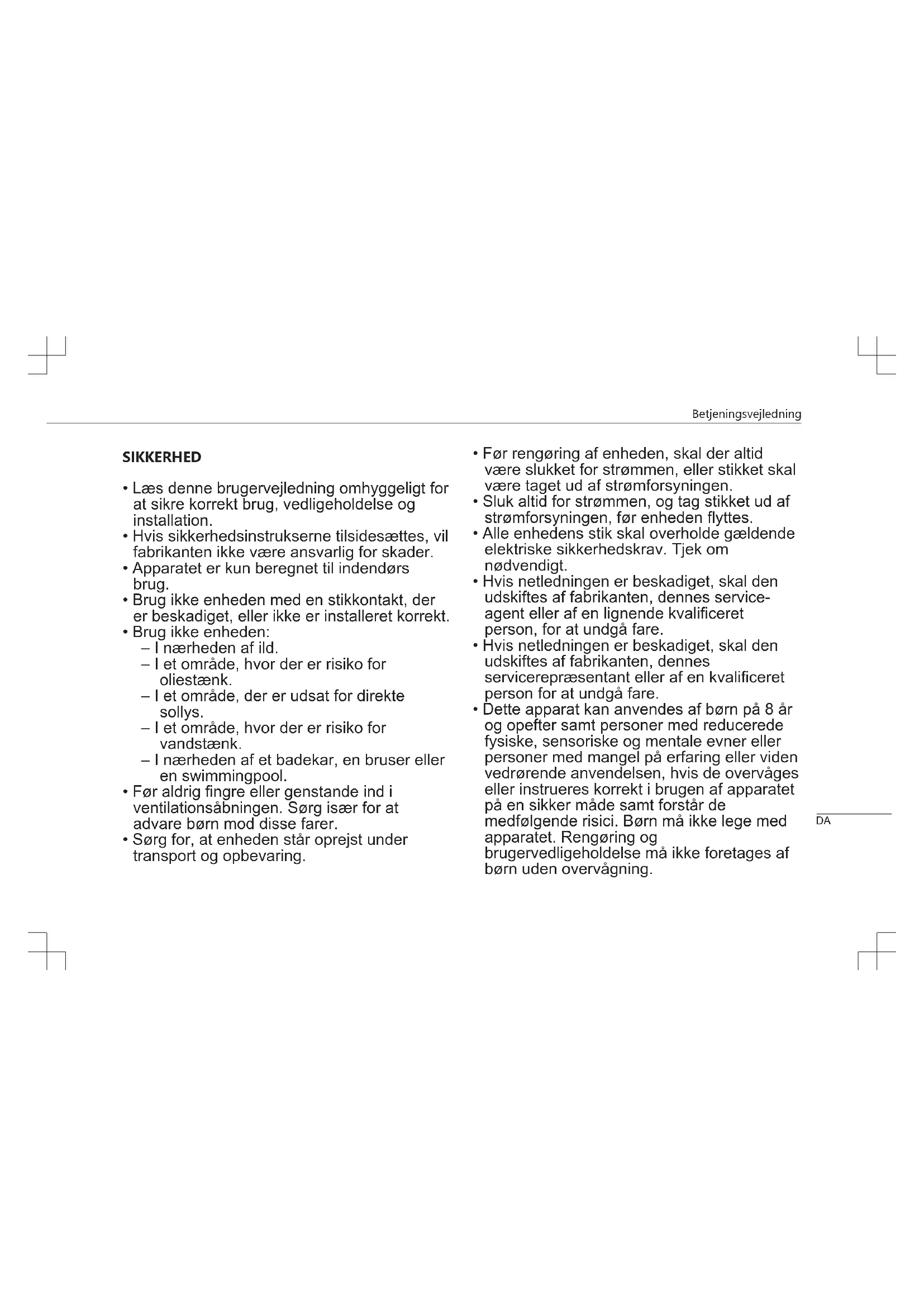 - Dette apparat kan anvendes af børn på 8 år og opefter samt personer med reducerede fysiske, sensoriske og mentale evner eller personer med mangel på erfaring eller viden vedrørende anvendelsen, hvis de overvåges eller instrueres korrekt i brugen af apparatet på en sikker måde samt forstår de medfølgende risici. Børn må ikke lege med apparatet. Rengøring og brugervedligeholdelse må ikke foretages af børn uden overvågning. DABetjeningsvejledning