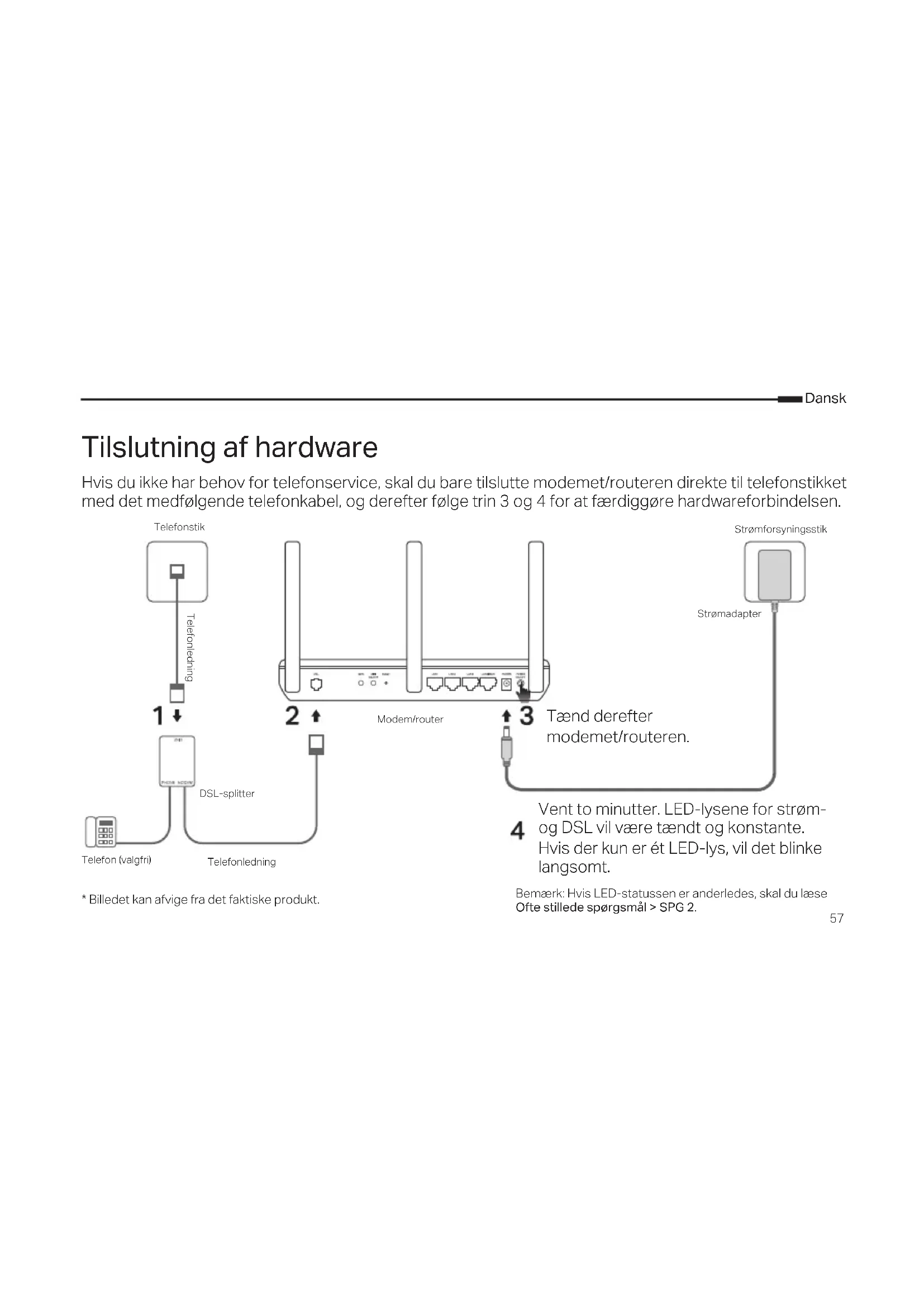 - Billedet kan afvige fra det faktiske produkt. Bemærk: Hvis LED-statussen er anderledes, skal du læse Ofte stillede spørgsmål > SPG 2. Vent to minutter. LED-lysene for strøm- og DSL vil være tændt og konstante. Hvis der kun er ét LED-lys, vil det blinke langsomt. Telefonstik Telefonledning Modem/router Tænd derefter modemet/routeren. Strømforsyningsstik DSL-splitter Telefon (valgfri) Telefonledning StrømadapterDansk
