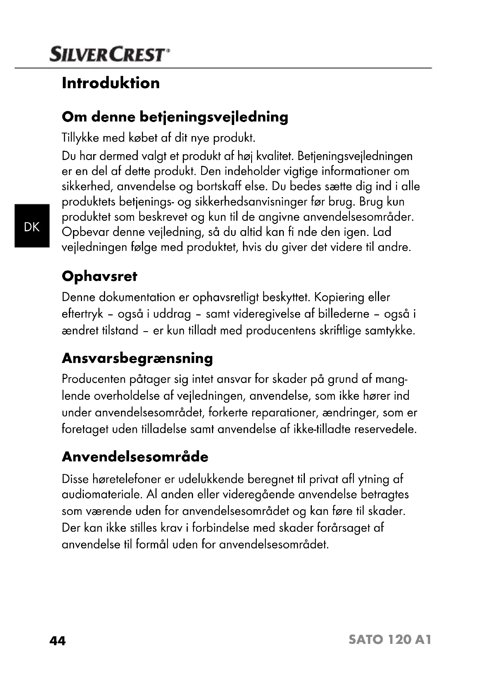 SATO 120 A1 Introduktion Om denne betjeningsvejledning Tillykke med købet af dit nye produkt. Du har dermed valgt et produkt af høj kvalitet. Betjeningsvejledningen er en del af dette produkt. Den indeholder vigtige informationer om sikkerhed, anvendelse og bortskaff else. Du bedes sætte dig ind i alle produktets betjenings- og sikkerhedsanvisninger før brug. Brug kun produktet som beskrevet og kun til de angivne anvendelsesområder. Opbevar denne vejledning, så du altid kan fi nde den igen. Lad vejledningen følge med produktet, hvis du giver det videre til andre. Ophavsret Denne dokumentation er ophavsretligt beskyttet. Kopiering eller eftertryk – også i uddrag – samt videregivelse af billederne – også i ændret tilstand – er kun tilladt med producentens skriftlige samtykke. Ansvarsbegrænsning Producenten påtager sig intet ansvar for skader på grund af mang- lende overholdelse af vejledningen, anvendelse, som ikke hører ind under anvendelsesområdet, forkerte reparationer, ændringer, som er foretaget uden tilladelse samt anvendelse af ikke-tilladte reservedele. Anvendelsesområde Disse høretelefoner er udelukkende beregnet til privat afl ytning af audiomateriale. Al anden eller videregående anvendelse betragtes som værende uden for anvendelsesområdet og kan føre til skader. Der kan ikke stilles krav i forbindelse med skader forårsaget af anvendelse til formål uden for anvendelsesområdet. IB_42782_SATO120A1_LB3.indb 44IB_42782_SATO120A1_LB3.indb 44 09.10.13 11:1709.10.13 11:1745 SATO 120 A1