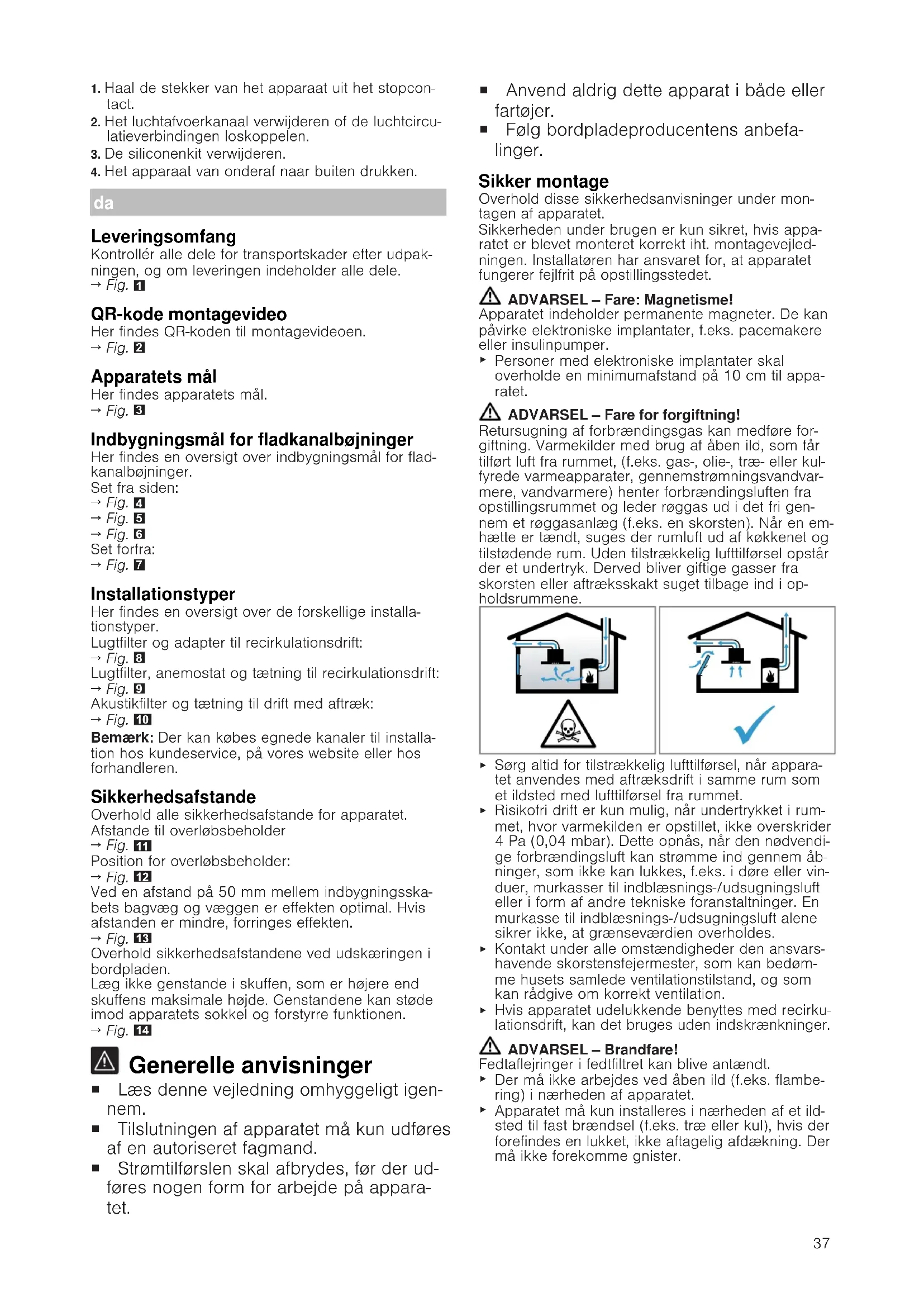 Personer med elektroniske implantater skal overholde en minimumafstand på 10cm til appa- ratet. ADVARSEL‒Fare for forgiftning! Retursugning af forbrændingsgas kan medføre for- giftning. Varmekilder med brug af åben ild, som får tilført luft fra rummet, (f.eks. gas-, olie-, træ- eller kul- fyrede varmeapparater, gennemstrømningsvandvar- mere, vandvarmere) henter forbrændingsluften fra opstillingsrummet og leder røggas ud i det fri gen- nem et røggasanlæg (f.eks. en skorsten). Når en em- hætte er tændt, suges der rumluft ud af køkkenet og tilstødende rum. Uden tilstrækkelig lufttilførsel opstår der et undertryk. Derved bliver giftige gasser fra skorsten eller aftræksskakt suget tilbage ind i op- holdsrummene.