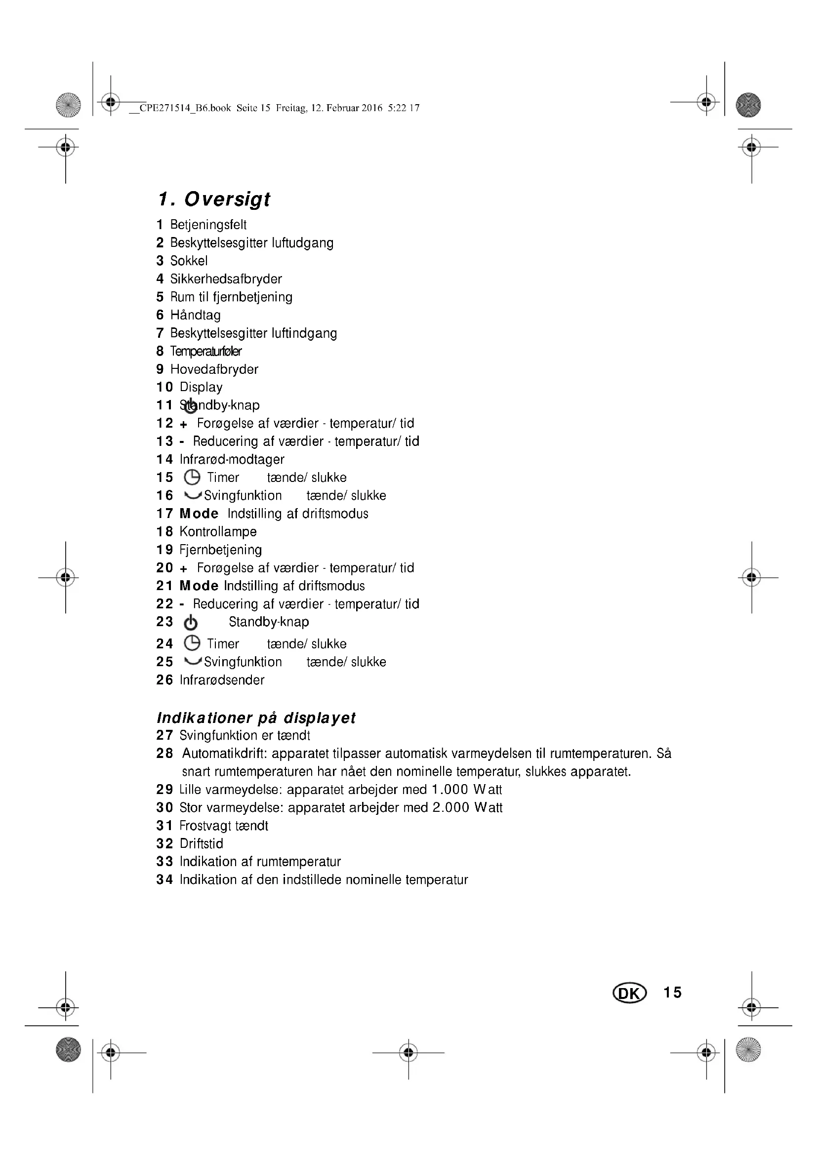 23 Standby-knap 24 Timer tænde/slukke 25 Svingfunktion tænde/slukke 26 Infrarødsender Indikationer på displayet 27 Svingfunktion er tændt 28 Automatikdrift: apparatet tilpasser automatisk varmeydelsen til rumtemperaturen. Så snart rumtemperaturen har nået den nominelle temperatur, slukkes apparatet. 29 Lille varmeydelse: apparatet arbejder med 1.000 Watt 30 Stor varmeydelse: apparatet arbejder med 2.000 Watt 31 Frostvagt tændt 32 Driftstid 33 Indikation af rumtemperatur 34 Indikation af den indstillede nominelle temperatur