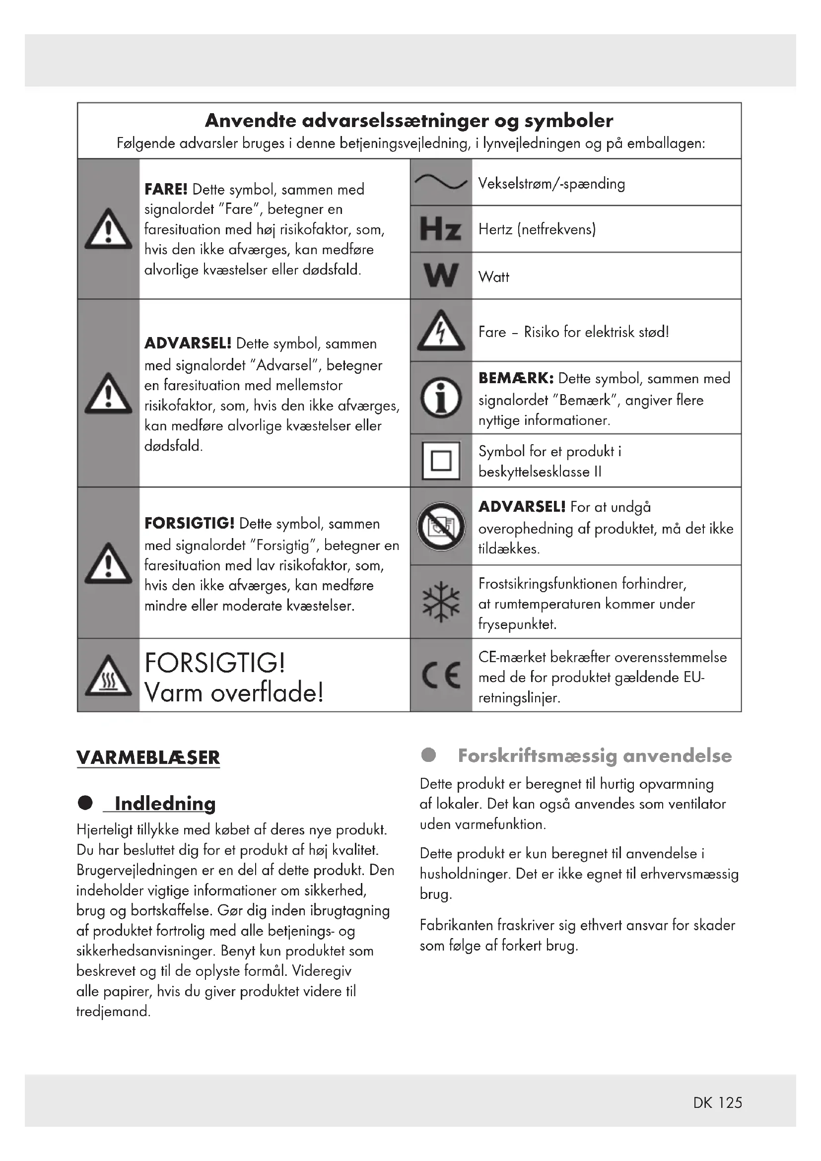 Anvendte advarselssætninger og symboler Følgende advarsler bruges i denne betjeningsvejledning, i lynvejledningen og på emballagen: FARE! Dette symbol, sammen med signalordet ”Fare”, betegner en faresituation med høj risikofaktor, som, hvis den ikke afværges, kan medføre alvorlige kvæstelser eller dødsfald. Vekselstrøm/-spænding Hertz (netfrekvens) Watt ADVARSEL! Dette symbol, sammen med signalordet ”Advarsel”, betegner en faresituation med mellemstor risikofaktor, som, hvis den ikke afværges, kan medføre alvorlige kvæstelser eller dødsfald. Fare– Risiko for elektrisk stød! BEMÆRK: Dette symbol, sammen med signalordet ”Bemærk”, angiver flere nyttige informationer. Symbol for et produkt i beskyttelsesklasse II FORSIGTIG! Dette symbol, sammen med signalordet ”Forsigtig”, betegner en faresituation med lav risikofaktor, som, hvis den ikke afværges, kan medføre mindre eller moderate kvæstelser. ADVARSEL! For at undgå overophedning af produktet, må det ikke tildækkes. Frostsikringsfunktionen forhindrer, at rumtemperaturen kommer under frysepunktet. FORSIGTIG! Varm overflade! CE-mærket bekræfter overensstemmelse med de for produktet gældende EU- retningslinjer. VARMEBLÆSER Indledning Hjerteligt tillykke med købet af deres nye produkt. Du har besluttet dig for et produkt af høj kvalitet. Brugervejledningen er en del af dette produkt. Den indeholder vigtige informationer om sikkerhed, brug og bortskaffelse. Gør dig inden ibrugtagning af produktet fortrolig med alle betjenings- og sikkerhedsanvisninger. Benyt kun produktet som beskrevet og til de oplyste formål. Videregiv alle papirer, hvis du giver produktet videre til tredjemand. Forskriftsmæssig anvendelse Dette produkt er beregnet til hurtig opvarmning af lokaler. Det kan også anvendes som ventilator uden varmefunktion. Dette produkt er kun beregnet til anvendelse i husholdninger. Det er ikke egnet til erhvervsmæssig brug. Fabrikanten fraskriver sig ethvert ansvar for skader som følge af forkert brug.126