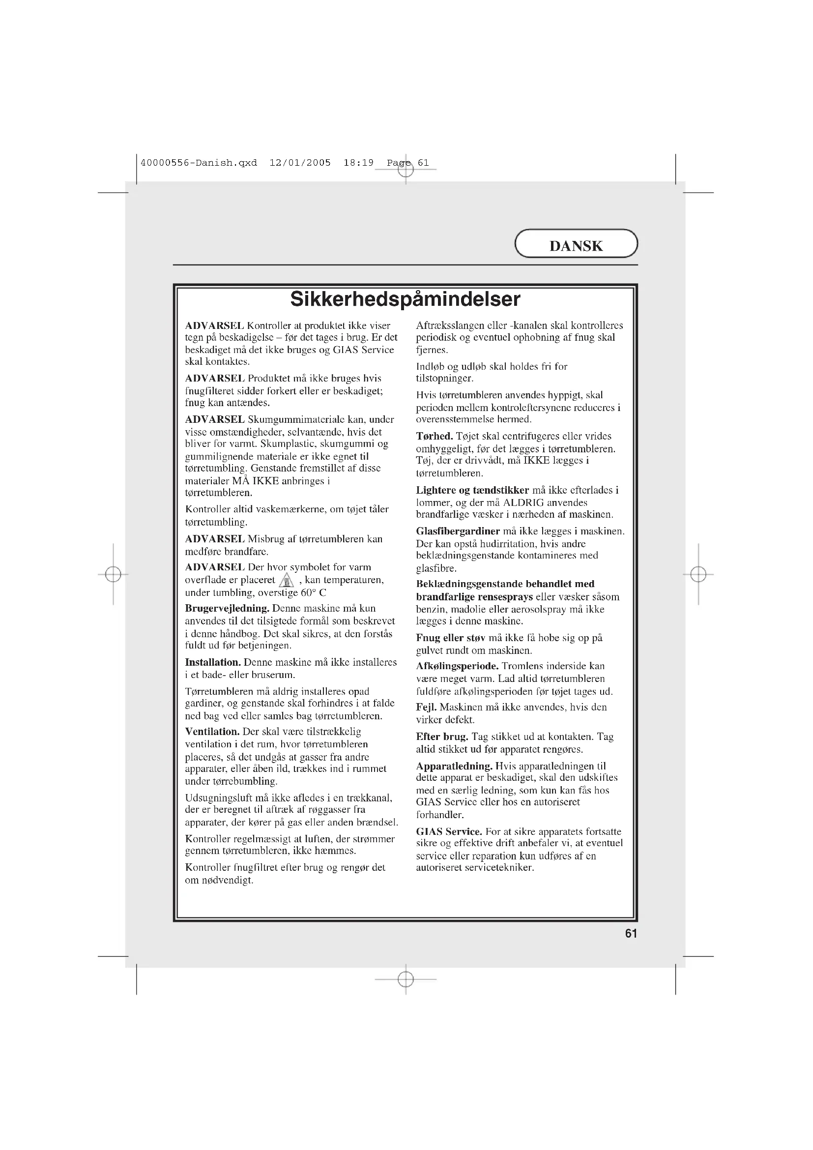 Sikkerhedspåmindelser ADVARSEL Kontroller at produktet ikke viser tegn på beskadigelse – før det tages i brug. Er det beskadiget må det ikke bruges og GIAS Service skal kontaktes. ADVARSEL Produktet må ikke bruges hvis fnugfilteret sidder forkert eller er beskadiget; fnug kan antændes. ADVARSEL Skumgummimateriale kan, under visse omstændigheder, selvantænde, hvis det bliver for varmt. Skumplastic, skumgummi og gummilignende materiale er ikke egnet til tørretumbling. Genstande fremstillet af disse materialer MÅ IKKE anbringes i tørretumbleren. Kontroller altid vaskemærkerne, om tøjet tåler tørretumbling. ADVARSEL Misbrug af tørretumbleren kan medføre brandfare. ADVARSEL Der hvor symbolet for varm overflade er placeret , kan temperaturen, under tumbling, overstige 60° C Brugervejledning. Denne maskine må kun anvendes til det tilsigtede formål som beskrevet i denne håndbog. Det skal sikres, at den forstås fuldt ud før betjeningen. Installation. Denne maskine må ikke installeres i et bade- eller bruserum. Tørretumbleren må aldrig installeres opad gardiner, og genstande skal forhindres i at falde ned bag ved eller samles bag tørretumbleren. Ventilation. Der skal være tilstrækkelig ventilation i det rum, hvor tørretumbleren placeres, så det undgås at gasser fra andre apparater, eller åben ild, trækkes ind i rummet under tørrebumbling. Udsugningsluft må ikke afledes i en trækkanal, der er beregnet til aftræk af røggasser fra apparater, der kører på gas eller anden brændsel. Kontroller regelmæssigt at luften, der strømmer gennem tørretumbleren, ikke hæmmes. Kontroller fnugfiltret efter brug og rengør det om nødvendigt. Aftræksslangen eller -kanalen skal kontrolleres periodisk og eventuel ophobning af fnug skal fjernes. Indløb og udløb skal holdes fri for tilstopninger. Hvis tørretumbleren anvendes hyppigt, skal perioden mellem kontroleftersynene reduceres i overensstemmelse hermed. Tørhed. Tøjet skal centrifugeres eller vrides omhyggeligt, før det lægges i tørretumbleren. Tøj, der er drivvådt, må IKKE lægges i tørretumbleren. Lightere og tændstikker må ikke efterlades i lommer, og der må ALDRIG anvendes brandfarlige væsker i nærheden af maskinen. Glasfibergardiner må ikke lægges i maskinen. Der kan opstå hudirritation, hvis andre beklædningsgenstande kontamineres med glasfibre. Beklædningsgenstande behandlet med brandfarlige rensesprays eller væsker såsom benzin, madolie eller aerosolspray må ikke lægges i denne maskine. Fnug eller støv må ikke få hobe sig op på gulvet rundt om maskinen. Afkølingsperiode. Tromlens inderside kan være meget varm. Lad altid tørretumbleren fuldføre afkølingsperioden før tøjet tages ud. Fejl. Maskinen må ikke anvendes, hvis den virker defekt. Efter brug. Tag stikket ud at kontakten. Tag altid stikket ud før apparatet rengøres. Apparatledning. Hvis apparatledningen til dette apparat er beskadiget, skal den udskiftes med en særlig ledning, som kun kan fås hos GIAS Service eller hos en autoriseret forhandler. GIAS Service. For at sikre apparatets fortsatte sikre og effektive drift anbefaler vi, at eventuel service eller reparation kun udføres af en autoriseret servicetekniker. 40000556-Danish.qxd 12/01/2005 18:19 Page 61Sikkerhedspåmindelser 61 Elektriske krav 62 Installationskrav 63 Forberedelse af ilægning af tøj 63 Klargøring af tøj 63 Maksimal tørrevægt 63 Sortering af tøj til ilægning 63-64 Må ikke tørres i tørretumbler 64 Energibesparelse 64 Åbning af døren 64 Filter 64 Vandbeholder 65 Kondensator 65 Tørrevejledning 66 Betjeningsknapper & indikatorer 67 Betjening 68-69 Rengøring af tørretumbleren 70 Teknisk specifikation 70 Europæisk direktiv 2002/96/EC 70 Fejlfinding 71 Før tørretumbleren anvendes første gang: ● læs venligst denne instruktionsbog grundigt. ● fjern alle genstande som er pakket inde i tromlen. ● aftør tromlens inderside og dør med en fugtig klud for at fjerne eventuelt støv, som har sat sig under transporten. VIGTIGT: Denne tørretumbler må kun anvendes til tørring af tekstiler og beklædningsgenstande i en husholdning, hvor der har været anvendt vand til vasken. De MÅ IKKE tørretumble tørt stof behandlet med kemiske rensevæsker. Elektriske krav Apparatet er udstyret med et påvulkaniseret stik, hvori der ikke kan trækkes nye ledninger. Stikket skal være tilgængeligt til afbrydelse efter, at apparatet er blevet installeret. VIGTIGT: Ledningerne i netledningen er farvede i overensstemmelse med følgende kode: Blå - NEUTRAL Brun - STRØMFØRENDE Grøn-og-gul - JORDLEDNING Hvis apparatledningen til dette apparat er beskadiget, skal den udskiftes med en særlig ledning, som kun kan fås hos GIAS Service eller hos en autoriseret forhandler.