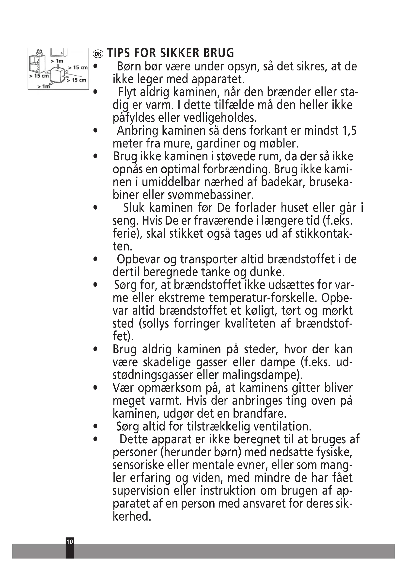 ). Du må ikke foretage ændringer af sikker- hedssystemet, da garantien for, at luftmåleren fungerer korrekt, derved bortfal- der. Kontakt forhandleren, hvis du har spørgsmål. Produktet må ikke anvendes som en primær opvarmningsanordning. Særlige oplysninger for brugere i Frankrig: Kaminen er fremstillet til kun at blive brugt med brændstof, der er beregnet til flytbare kaminer, som fyrer med flyden- de brændstof, i henhold til de franske dekreter af 18-07-2002 og 25-06-2010. Det er forbudt at bruge andre former for brændstof. Kontakt din forhandler, eller find adresser på forhandlere på vores websted. Denne flytbare kamin, der fyrer med flydende brændstof, er beregnet til brug som en ekstra varmekilde og ikke som en konstant varmekilde. Særlige oplysninger for brugere i Storbritannien: Brug kun Klasse C1 petroleum i henhold til BS2869 Del 2 eller lignende. Brugeren skal overholde følgende anvisninger om korrekt brug: UNDLAD AT - bruge den flytbare kamin, der fyrer med flydende brændstof, i campingvogne, både og førerhuse. - bruge den flytbare kamin, der fyrer med flydende brændstof, i lokaler med util- strækkelig ventilation (se minimummålene for det lokale, der skal opvarmes i skemaet med specifikationer) samt lokaler, der ligger under jordhøjde og/eller i en højde på over 1.000 meter - ændre kaminens sikkerhedsfunktioner. Anvendelse af denne type opvarmning på offentlige steder kræver forudgående til- ladelse fra myndighederne. Indhent korrekte oplysninger, før kaminen tages i brug.