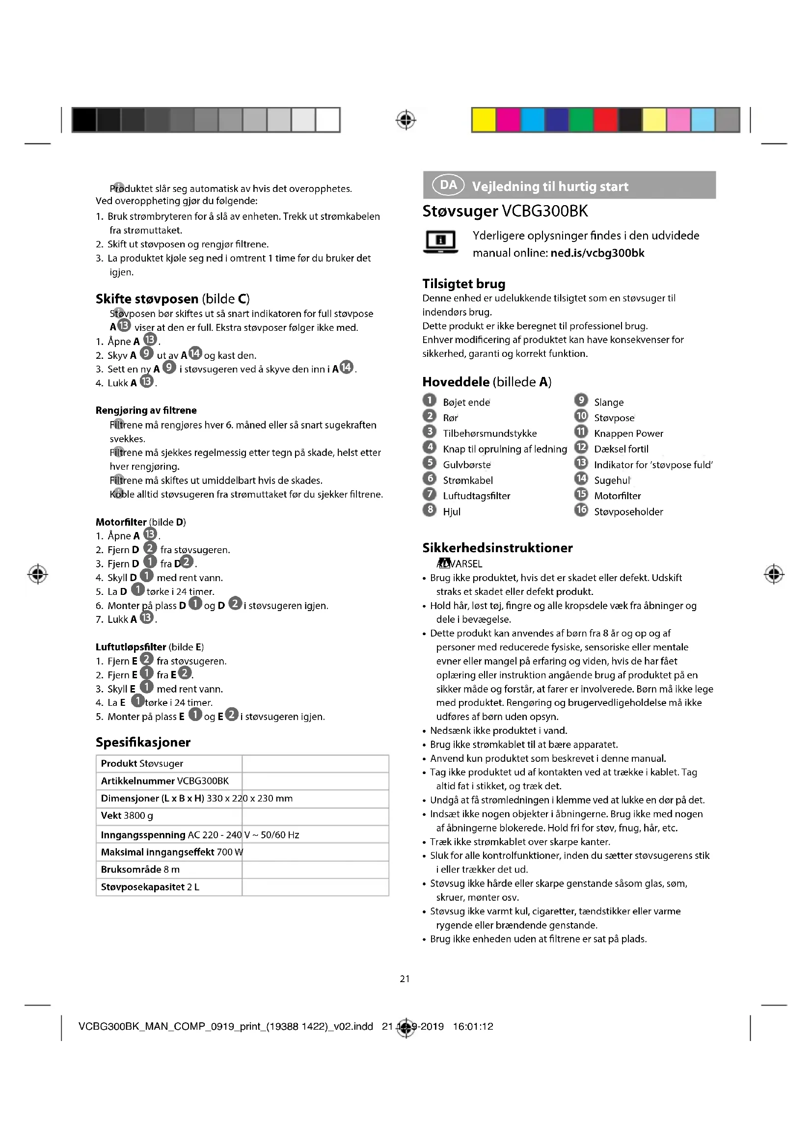 Vejledning til hurtig start Støvsuger VCBG300BK Yderligere oplysninger ndes i den udvidede manual online: ned.is/vcbg300bk Tilsigtet brug Denne enhed er udelukkende tilsigtet som en støvsuger til indendørs brug.Dette produkt er ikke beregnet til professionel brug.Enhver modicering af produktet kan have konsekvenser for sikkerhed, garanti og korrekt funktion. Hoveddele (billede A)