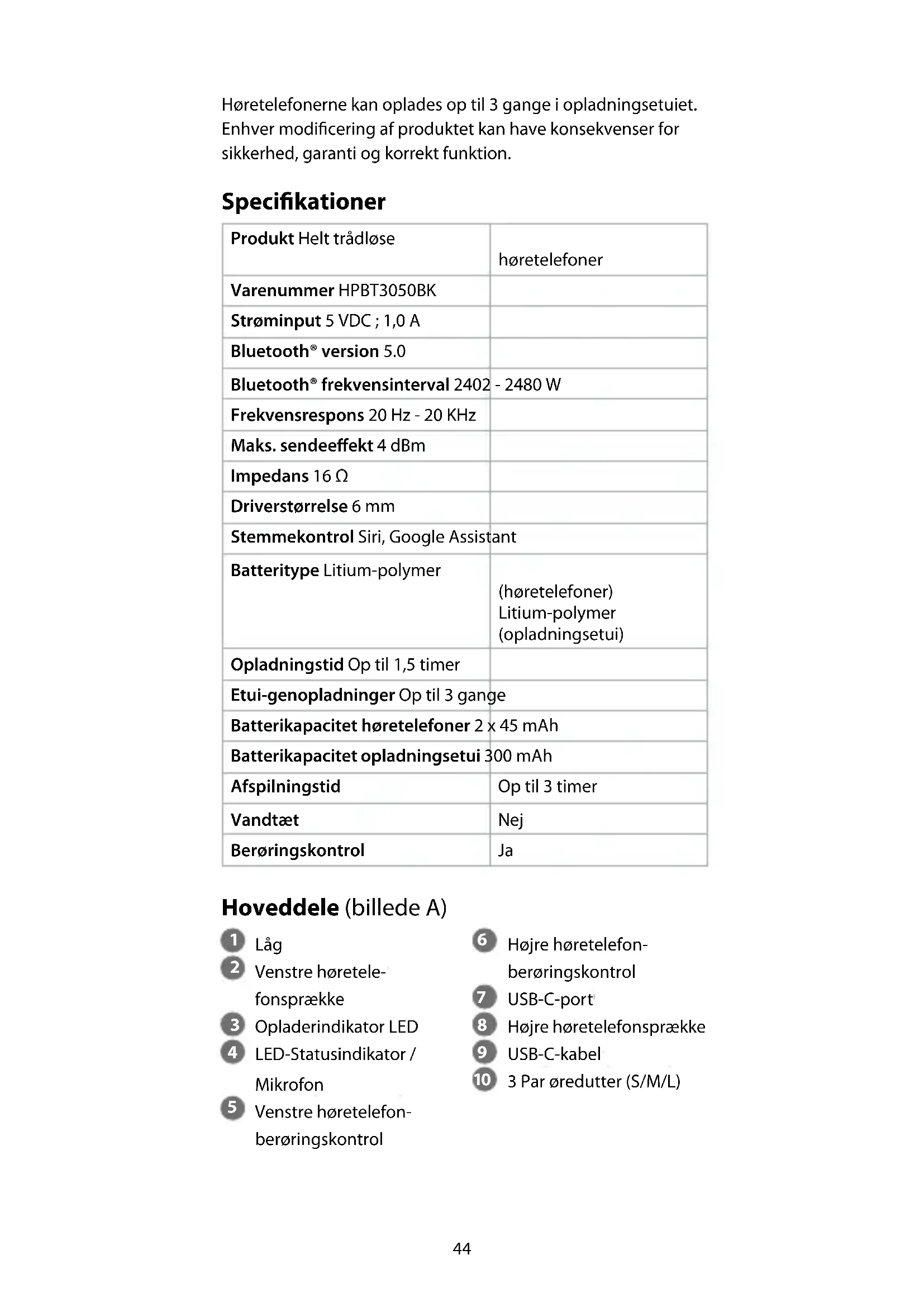 3 Par øredutter (S/M/L)45 Sikkerhedsinstruktioner
