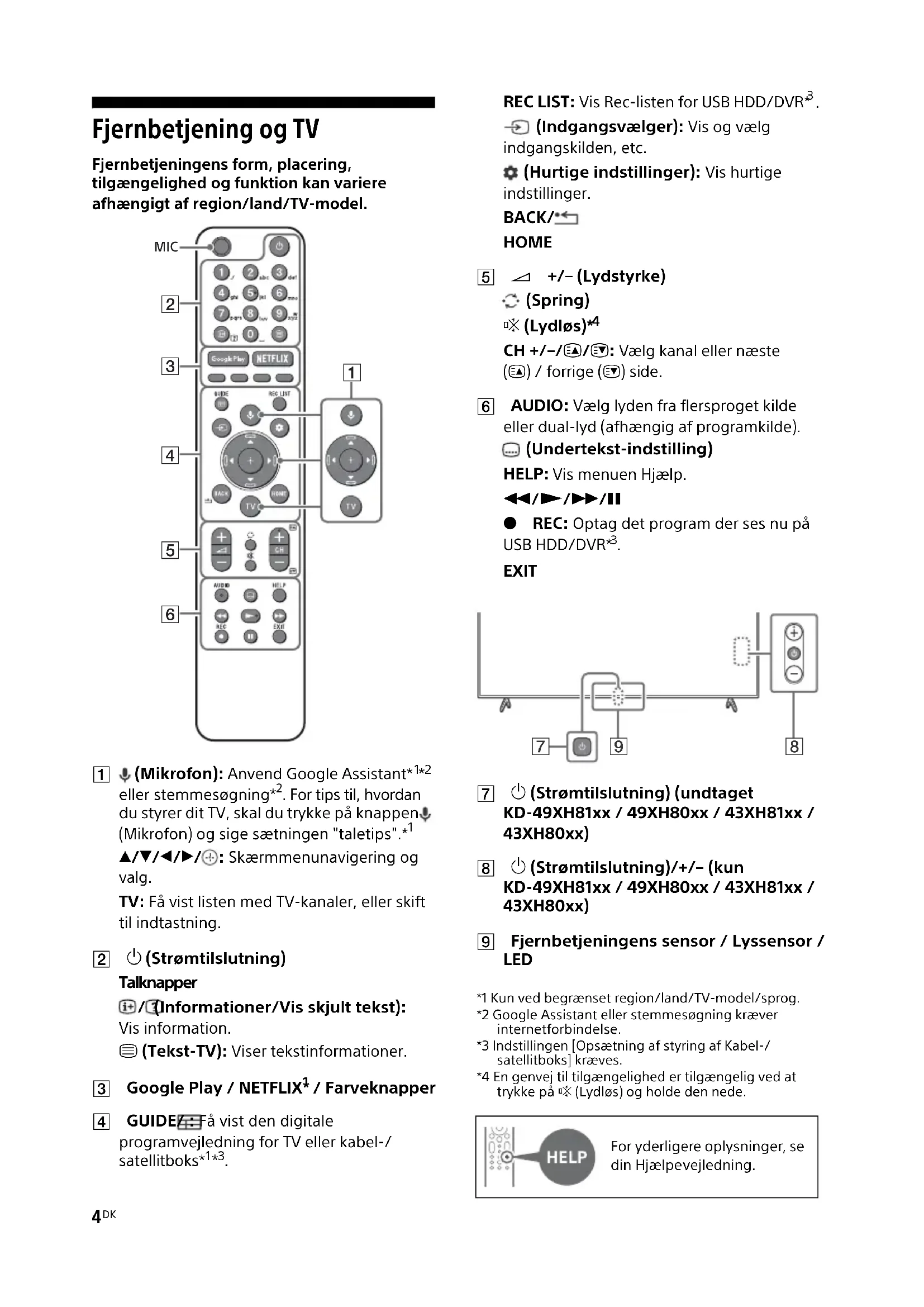 EXIT (Strømtilslutning) (undtaget KD-49XH81xx / 49XH80xx / 43XH81xx / 43XH80xx) (Strømtilslutning)/+/– (kun KD-49XH81xx / 49XH80xx / 43XH81xx / 43XH80xx) Fjernbetjeningens sensor / Lyssensor / LED *1 Kun ved begrænset region/land/TV-model/sprog.*2 Google Assistant eller stemmesøgning kræver internetforbindelse.*3 Indstillingen [Opsætning af styring af Kabel-/satellitboks] kræves.*4 En genvej til tilgængelighed er tilgængelig ved at trykke på (Lydløs) og holde den nede.