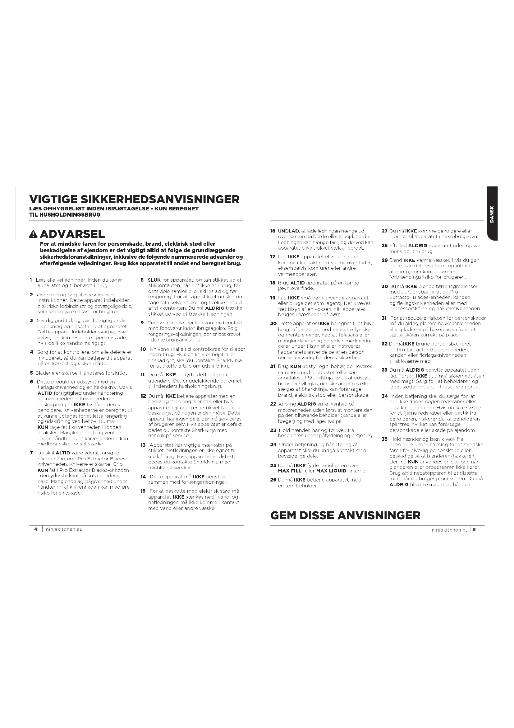 ninjakitchen.euGEM DISSE ANVISNINGER VIGTIGE SIKKERHEDSANVISNINGER LÆS OMHYGGELIGT INDEN IBRUGTAGELSE • KUN BEREGNET TILHUSHOLDNINGSBRUG 1 Læs alle vejledninger, inden du tager apparatet og tilbehøret i brug 2 Overhold og følg alle advarsler og instruktioner Dette apparat indeholder elektriske forbindelser og bevægelige dele, som kan udgøre en fare for brugeren 3 Giv dig god tid, og vær forsigtig under udpakning og opsætning af apparatet Dette apparat indeholder skarpe, løse knive, der kan resultere i personskade, hvis de ikke håndteres rigtigt 4 Sørg for at kontrollere, om alle delene er inkluderet, så du kan betjene dit apparat på en korrekt og sikker måde 5 Bladene er skarpe Håndteres forsigtigt 6 Dette produkt er udstyret med en flerlagsknivenhed og en hakkekniv Udvis ALTID forsigtighed under håndtering af knivenhederne Knivenhederne er skarpe og er IKKE fastlåst i deres beholdere Knivenhederne er beregnet til at kunne udtages for at lette rengøring og udskiftning ved behov Du må KUN tage fat i knivenheden i toppen af akslen Manglende agtpågivenhed under håndtering af knivenhederne kan medføre risiko for snitskader 7 Du skal ALTID være yderst forsigtig, når du håndterer Pro Extractor Blades- knivenheden Knivene er skarpe Grib KUN fat i Pro Extractor Blades-enheden i den yderste kant på knivenhedens base Manglende agtpågivenhed under håndtering af knivenheden kan medføre risiko for snitskader 8 SLUK for apparatet, og tag stikket ud af stikkontakten, når det ikke er i brug, før dets dele samles eller skilles ad og før rengøring For at tage stikket ud skal du tage fat i selve stikket og trække det ud af stikkontakten Du må ALDRIG trække stikket ud ved at trække i ledningen 9 Rengør alle dele, der kan komme i kontakt med fødevarer inden ibrugtagelse Følg rengøringsvejledningen, der er beskrevet idenne brugsanvisning 10 Knivene skal altid kontrolleres for skader inden brug Hvis en kniv er bøjet eller beskadiget, skal du kontakte SharkNinja for at træe aftale om udskiftning 11 Du må IKKE benytte dette apparat udendørs Det er udelukkende beregnet til indendørs husholdningsbrug 12 Du må IKKE betjene apparater med en beskadiget ledning eller stik, eller hvis apparatet fejlfungerer, er blevet tabt eller beskadiget på nogen anden måde Dette apparat har ingen dele, der må serviceres af brugeren selv Hvis apparatet er defekt, bedes du kontakte SharkNinja med henblik på service 13 Apparatet har vigtige mærkater på stikket Netledningen er ikke egnet til udskiftning Hvis apparatet er defekt, bedes du kontakte SharkNinja med henblik på service 14 Dette apparat må IKKE benyttes sammen med forlængerledninger 15 For at beskytte mod elektrisk stød må apparatet IKKE sænkes ned i vand, og netledningen må ikke komme i kontakt med vand eller andre væsker 16 UNDLAD, at lade ledningen hænge ud over kanten på borde eller arbejdsborde Ledningen kan hænge fast, og derved kan apparatet blive trukket væk af bordet 17 Lad IKKE apparatet eller ledningen komme i kontakt med varme overflader, eksempelvis komfurer eller andre varmeapparater 18 Brug ALTID apparatet på en tør og jævnoverflade 19 Lad IKKE små børn anvende apparatet eller bruge det som legetøj Der kræves tæt tilsyn af en voksen, når apparatet bruges i nærheden af børn 20 Dette apparat er IKKE beregnet til at blive brugt af personer med nedsatte fysiske og mentale evner, nedsat følesans eller manglende erfaring og viden, medmindre de er under tilsyn af eller instrueres iapparatets anvendelse af en person, der er ansvarlig for deres sikkerhed 21 Brug KUN udstyr og tilbehør, der leveres sammen med produktet, eller som anbefales af SharkNinja Brug af udstyr, herunder sylteglas, der ikke anbefales eller sælges af SharkNinja, kan forårsage brand, elektrisk stød eller personskade 22 Anbring ALDRIG en knivenhed på motorenheden uden først at montere den på den tilhørende beholder (kande eller bæger) og med låget sat på 23 Hold hænder, hår og tøj væk fra beholderen under påfyldning og betjening 24 Under betjening og håndtering af apparatet skal du undgå kontakt med bevægelige dele 25 Du må IKKE fylde beholderen over MAXFILL- eller MAX LIQUID-linjerne 26 Du må IKKE betjene apparatet med entom beholder 27 Du må IKKE komme beholdere eller tilbehør til apparatet i mikrobølgeovn 28 Efterlad ALDRIG apparatet uden opsyn, mens det er i brug 29 Blend IKKE varme væsker Hvis du gør dette, kan det resultere i ophobning af damp, som kan udgøre en forbrændingsrisiko for brugeren 30 Du må IKKE blende tørre ingredienser med portionsbægeret og Pro Extractor Blades-enheden, kanden og flerlagsknivenheden eller med processorskålen og hakkeknivenheden 31 For at reducere risikoen for personskader må du aldrig placere hakkeknivenheden eller pladerne på basen uden først at sætte skålen korrekt på plads 32 Du må IKKE bruge portionsbægeret og Pro Extractor Blades-enheden, kanden eller flerlagsknivenheden tilatkværnemed 33 Du må ALDRIG benytte apparatet uden låg Forsøg IKKE at omgå sikkerhedslåsen med magt Sørg for, at beholderen og låget sidder ordentligt fast inden brug 34 Inden betjening skal du sørge for, at der ikke findes nogen redskaber eller bestik i beholderen Hvis du ikke sørger for at fjerne redskaber eller bestik fra beholderen, risikerer du, at beholderen splintres, hvilket kan forårsage personskade eller skade på ejendom 35 Hold hænder og bestik væk fra beholdere under hakning for at mindske faren for alvorlig personskade eller beskadigelse af blenderen/hakkeren Der må KUN anvendes en skraber, når blenderen eller processoren ikke kører Brug altid nedstopperen til at tilsætte mad, når du bruger processoren Du må ALDRIG tilsætte mad med hånden ADVARSEL For at mindske faren for personskade, brand, elektrisk stød eller beskadigelse af ejendom er det vigtigt altid at følge de grundlæggende sikkerhedsforanstaltninger, inklusive de følgende num