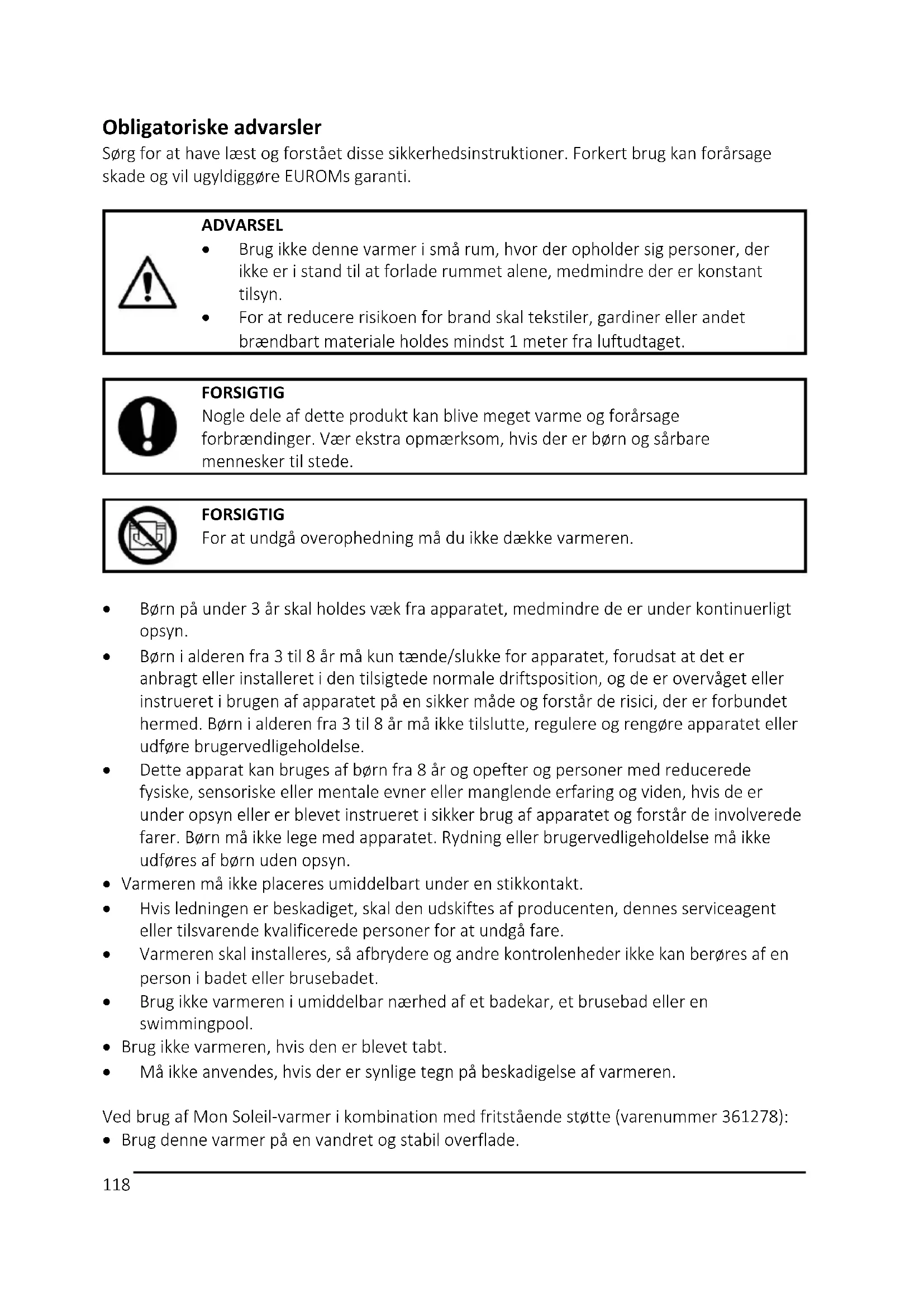 - Må ikke anvendes, hvis der er synlige tegn på beskadigelse af varmeren. Ved brug af Mon Soleil-varmer i kombination med fritstående støtte (varenummer 361278):