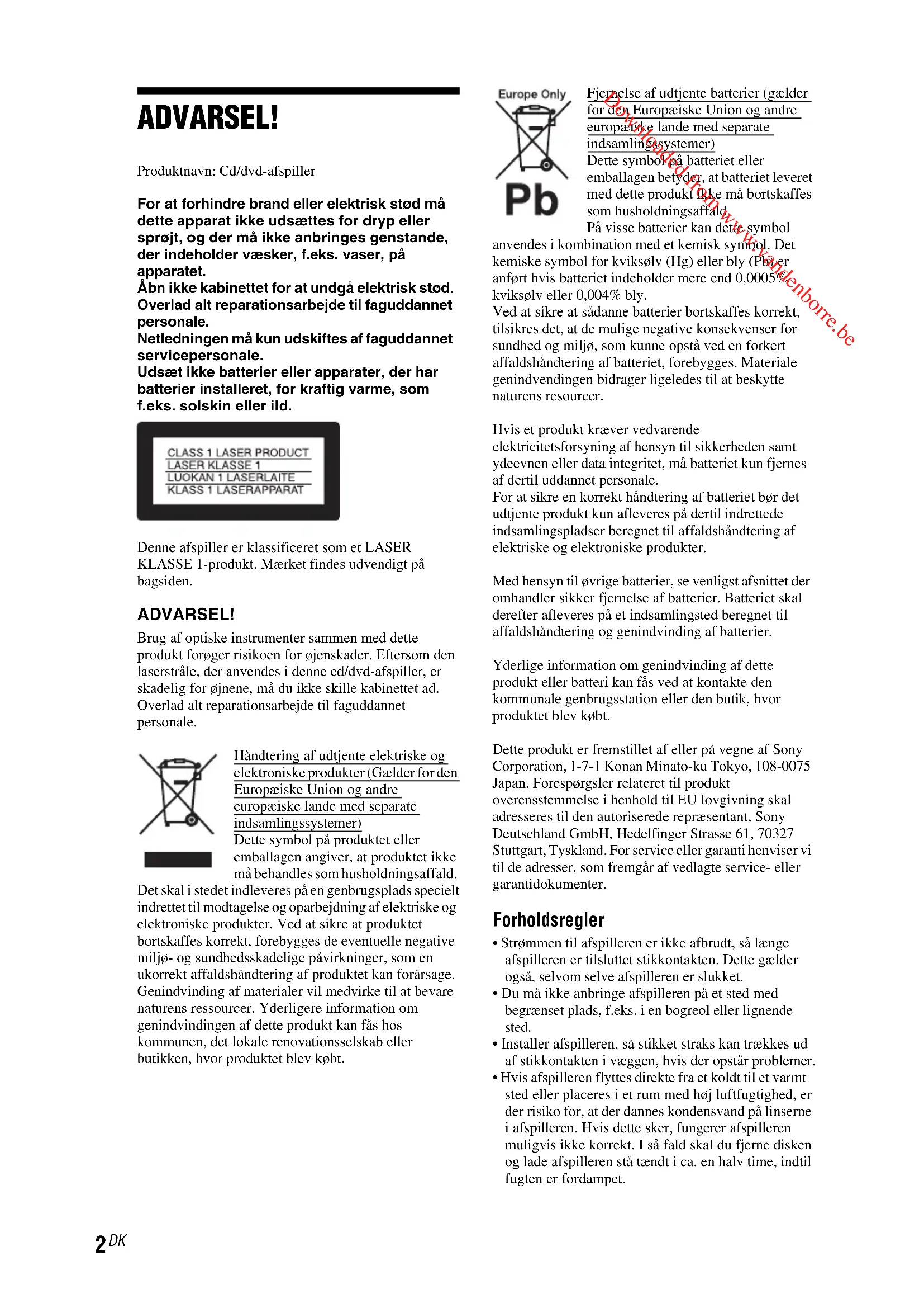 ADVARSEL! Produktnavn: Cd/dvd-afspillerFor at forhindre brand eller elektrisk stød må dette apparat ikke udsættes for dryp eller sprøjt, og der må ikke anbringes genstande, der indeholder væsker, f.eks. vaser, på apparatet.Åbn ikke kabinettet for at undgå elektrisk stød. Overlad alt reparationsarbejde til faguddannet personale.Netledningen må kun udskiftes af faguddannet servicepersonale.Udsæt ikke batterier eller apparater, der har batterier installeret, for kraftig varme, som f.eks. solskin eller ild.Denne afspiller er klassificeret som et LASER KLASSE 1-produkt. Mærket findes udvendigt på bagsiden. ADVARSEL! Brug af optiske instrumenter sammen med dette produkt forøger risikoen for øjenskader. Eftersom den laserstråle, der anvendes i denne cd/dvd-afspiller, er skadelig for øjnene, må du ikke skille kabinettet ad.Overlad alt reparationsarbejde til faguddannet personale.Håndtering af udtjente elektriske og elektroniske produkter (Gælder for den Europæiske Union og andre europæiske lande med separate indsamlingssystemer)Dette symbol på produktet eller emballagen angiver, at produktet ikke må behandles som husholdningsaffald. Det skal i stedet indleveres på en genbrugsplads specielt indrettet til modtagelse og oparbejdning af elektriske og elektroniske produkter. Ved at sikre at produktet bortskaffes korrekt, forebygges de eventuelle negative miljø- og sundhedsskadelige påvirkninger, som en ukorrekt affaldshåndtering af produktet kan forårsage. Genindvinding af materialer vil medvirke til at bevare naturens ressourcer. Yderligere information om genindvindingen af dette produkt kan fås hos kommunen, det lokale renovationsselskab eller butikken, hvor produktet blev købt.Fjernelse af udtjente batterier (gælder for den Europæiske Union og andre europæiske lande med separate indsamlingssystemer)Dette symbol på batteriet eller emballagen betyder, at batteriet leveret med dette produkt ikke må bortskaffes som husholdningsaffald.På visse batterier kan dette symbol anvendes i kombination med et kemisk symbol. Det kemiske symbol for kviksølv (Hg) eller bly (Pb) er anført hvis batteriet indeholder mere end 0,0005% kviksølv eller 0,004% bly.Ved at sikre at sådanne batterier bortskaffes korrekt, tilsikres det, at de mulige negative konsekvenser for sundhed og miljø, som kunne opstå ved en forkert affaldshåndtering af batteriet, forebygges. Materiale genindvendingen bidrager ligeledes til at beskytte naturens resourcer.Hvis et produkt kræver vedvarende elektricitetsforsyning af hensyn til sikkerheden samt ydeevnen eller data integritet, må batteriet kun fjernes af dertil uddannet personale.For at sikre en korrekt håndtering af batteriet bør det udtjente produkt kun afleveres på dertil indrettede indsamlingspladser beregnet til affaldshåndtering af elektriske og elektroniske produkter.Med hensyn til øvrige batterier, se venligst afsnittet der omhandler sikker fjernelse af batterier. Batteriet skal derefter afleveres på et indsamlingsted beregnet til affaldshåndtering og genindvinding af batterier.Yderlige information om genindvinding af dette produkt eller batteri kan fås ved at kontakte den kommunale genbrugsstation eller den butik, hvor produktet blev købt.Dette produkt er fremstillet af eller på vegne af Sony Corporation, 1-7-1 Konan Minato-ku Tokyo, 108-0075 Japan. Forespørgsler relateret til produkt overensstemmelse i henhold til EU lovgivning skal adresseres til den autoriserede repræsentant, Sony Deutschland GmbH, Hedelfinger Strasse 61, 70327 Stuttgart, Tyskland. For service eller garanti henviser vi til de adresser, som fremgår af vedlagte service- eller garantidokumenter. Forholdsregler
