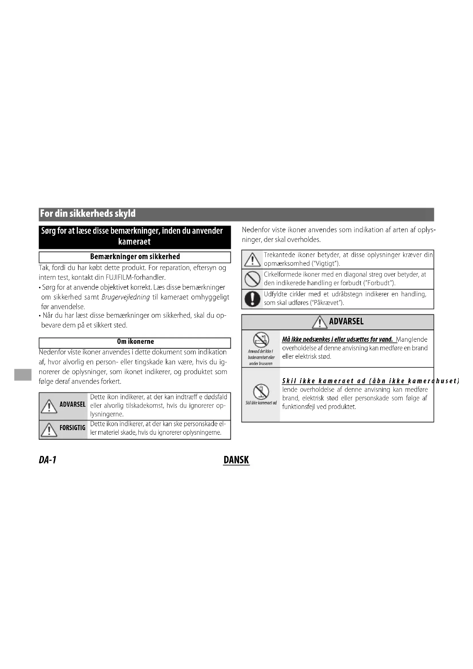 - Når du har læst disse bemærkninger om sikkerhed, skal du op- bevare dem på et sikkert sted. Om ikonerne Nedenfor viste ikoner anvendes i dette dokument som indikation af, hvor alvorlig en person- eller tingskade kan være, hvis du ig- norerer de oplysninger, som ikonet indikerer, og produktet som følge deraf anvendes forkert. ADVARSEL Dette ikon indikerer, at der kan indtræff e dødsfald eller alvorlig tilskadekomst, hvis du ignorerer op- lysningerne. FORSIGTIG Dette ikon indikerer, at der kan ske personskade el- ler materiel skade, hvis du ignorerer oplysningerne. Nedenfor viste ikoner anvendes som indikation af arten af oplys- ninger, der skal overholdes. Trekantede ikoner betyder, at disse oplysninger kræver din opmærksomhed (”Vigtigt”). Cirkelformede ikoner med en diagonal streg over betyder, at den indikerede handling er forbudt (”Forbudt”). Udfyldte cirkler med et udråbstegn indikerer en handling, som skal udføres (“Påkrævet”). ADVARSEL ADVARSEL Anvend det ikke i badeværelset eller under bruseren Må ikke nedsænkes i eller udsættes for vand. Manglende overholdelse af denne anvisning kan medføre en brand eller elektrisk stød. Skil ikke kameraet ad Skil ikke kameraet ad (åbn ikke kamerahuset). Mang- lende overholdelse af denne anvisning kan medføre brand, elektrisk stød eller personskade som følge af funktionsfejl ved produktet.DA-2 DANSK ADVARSEL ADVARSEL Rør ikke ved de indvendige dele Hvis kameraet går i stykker som følge af, at du taber det, eller der sker et andet uheld, må du ikke røre ved de dele, der kommer til syne. Manglende overholdelse af denne anvisning kan medføre elektrisk stød eller personskade ved berøring af de beskadigede dele. Tag øjeblikkeligt kameraets batteri ud - pas på, at du ikke kommer til skade eller får elektrisk stød - og indlevér produktet til eftersyn på købsstedet. Må ikke anbringes på ustabile over ader. Produktet kan falde ned og medføre tilskadekomst. Se ikke på solen gennem objektivets eller kameraets søger. Manglende overholdelse af denne anvisning kan med- føre permanent skade på synet. FORSIGTIG FORSIGTIG Må ikke anvendes eller opbevares på steder med damp el- ler røg, eller som er meget fugtige eller ekstremt støvede. Manglende overholdelse af denne anvisning kan med- føre brand eller elektrisk stød. Må ikke efterlades i direkte sollys eller på steder med me- get høje temperaturer, såsom i et lukket køretøj på en solrig dag. Manglende overholdelse af denne anvisning kan medføre brand. FORSIGTIG FORSIGTIG Opbevar kameraet utilgængeligt for små børn. Dette pro- dukt kan medføre personskade, når det er i hænderne på børn. Må ikke håndteres med våde hænder. Manglende over- holdelse af denne anvisning kan medføre elektrisk stød. Hold sollyset væk fra billedet, når du tager billeder af mo- tiver i modlys. Hvis sollyset fokuseres i kameraet, når solen er i eller tæt på billedet kan medføre brand eller forbrændinger. Når produktet ikke anvendes, skal du sætte objektivdæks- le rne på igen og opbevare det på et sted ud en direkte sol lys. Sollys fokuseret af objektivet kan medføre brand eller forbrændinger. Bær ikke kameraet eller objektivet, mens de er monteret på et stativ. Produktet kan falde ned eller ramme andre genstande og medføre tilskadekomst.DA-3 DANSK Bortska else af elektrisk og elektronisk udstyr i private husholdninger Bortska else af elektrisk og elektronisk udstyr i private husholdninger I EU, Norge, Island og Liechtenstein: Dette symbol på produktet eller i brugervejledningen og i garantien og/eller på emballagen bety- der, at dette produkt ikke bør behandles som husholdningsaff ald. Det bør i stedet afl everes på et egnet indsamlingssted for genbrug af elektrisk og elektronisk udstyr. Når du sikrer en korrekt bortskaff else af dette produkt, bidrager du til at fore- bygge potentielle negative konsekvenser for miljø og folkesundhed, som ellers vil kunne opstå ved uhensigtsmæssig aff aldshåndtering af dette produkt. Genbrug af materialet bidrager til at bevare naturens ressourcer. For mere detaljerede oplysninger om genbrug af dette produkt, bedes du kontakte de lokale myndigheder, dit lokale renovationsfi rma eller den forretning, hvor du har købt produktet. I lande uden for EU, Norge, Island og Liechtenstein: Hvis du ønsker at kassere dette produkt, herunder batterier eller akkumulatorer, bedes du kontakte de lokale myndigheder og få anvist den korrekte bortskaff elsesprocedure.DA-4 DANSK Før anvendelse af dette produkt Visse objektivfunktioner er ikke tilgængelige med ældre versioner af kameraets rmware. Sørg for at opdatere kameraets rmware til den nyeste version. Du kan nde instruktioner i visning af kameraets rmwareversion samt opdatering af kameraets rmware på følgende hjemmeside: http://www.fujifilm.com/support/digital_cameras/ software/#firmware Hvis du ikke har adgang til en computer, kan du få support hos den lokale forhandler opstillet i materialet ”FUJIFILM verdensomspændende net- værk”, der følger med dit kamera. Produktvedligeholdelse