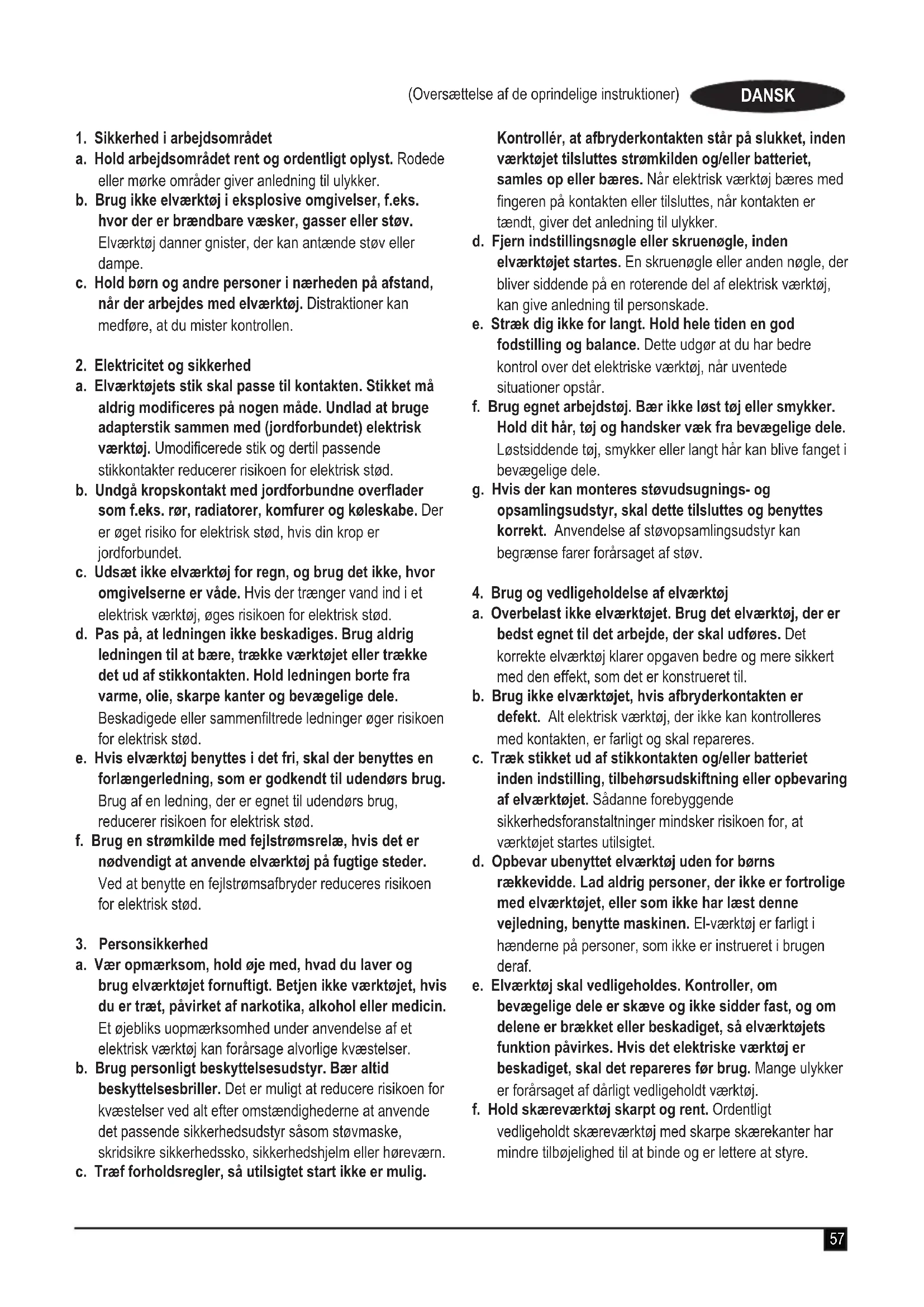 Advarsel! Læs alle sikkerhedsadvarsler og alle instruktioner. Hvis efterfølgende advarsler og instruktioner ikke følges, er der risiko for elektrisk stød, brand og alvorlige kvæstelser. Gem alle advarsler og instruktioner til fremtidig reference. Begrebet "elværktøj", der benyttes i nedenstående advarsler, henviser til netdrevet elværktøj (med netledning) eller bat- teridrevet elværktøj (uden netledning).57 (Oversættelse af de oprindelige instruktioner) DANSK