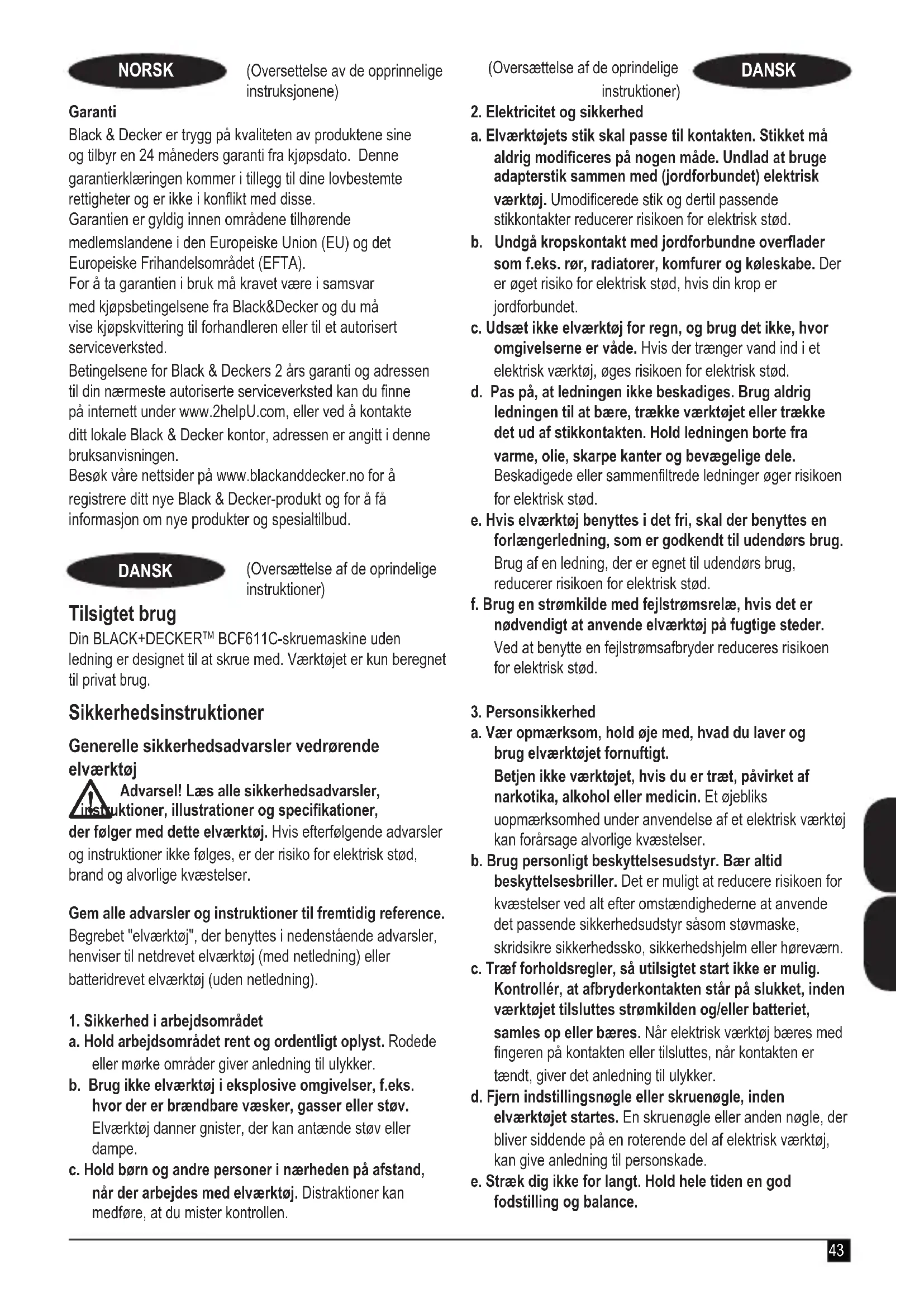 EU-overensstemmelseserklæring MASKINDIREKTIV %47 (Oversættelse af de oprindelige instruktioner) DANSK (Alkuperäisten ohjeiden käännös) SUOMI BCF611C Skruetrækker Black & Decker erklærer, at produkterne beskrevet under "Tekniske data" er i overensstemmelse med: 2006/42/EC, EN62841-1:2015, EN62841-2-2:2014. Disse produkter er endvidere i overensstemmelse med direktiv 2014/30/EU og 2011/65/EU. Kontakt Black & Decker på nedenstående adresse eller se vejledningens bagside for at få yderligere oplysninger. Undertegnede er ansvarlig for kompilering af den tekniske l og udsteder denne erklæring på vegne af Black & Decker. A.P. Smith Teknisk direktør Black & Decker Europe, 210 Bath Road, Slough, Berkshire, SL1 3YD Storbritannien 04/03/2019 Garanti Black & Decker er overbevist om den gode kvalitet af sine produkter og giver forbrugerne en garanti på 24 måneder fra købsdatoen. Garantien er et tillæg til forbrugerens lovmæssige rettigheder og påvirker ikke disse. Garantien er gyldig inden for medlemsstaterne af Den Europæiske Union og Det Europæiske Frihandelsområde. Når du gør krav på garantien, skal kravet være i overensstemmelse med Black & Decker vilkår og betingelser, og du skal indsende dokumentation for købet til sælgeren eller til en autoriseret reparatør. Vilkår og betingelser for Black & Decker 2 års garanti og placeringen af dit nærmeste autoriserede serviceværksted kan fås på internettet på www.2helpU.com, eller ved at kontakte dit lokale Black & Decker kontor på den adresse, der er angivet i denne vejledning. Besøg venligst vores websted www.blackanddecker.co.uk for at registrere dit nye Black & Decker produkt og modtage opdateringer om nye produkter og specielle tilbud. (Alkuperäisten ohjeiden käännös) SUOMI Käyttötarkoitus BLACK+DECKER