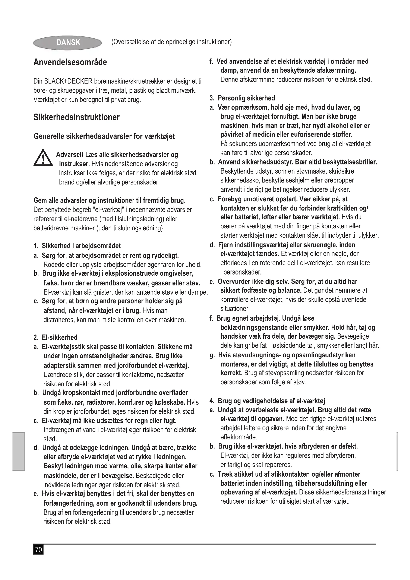 g. Brug el-værktoj, tilbehør, indsatsværktoj osv. i overensstemmelse med disse instrukser, og saban som det kræves for dette specielle værktogjstype. Tag hensyn til arbejdsoforholdene og det arbejde, der skal udfores. I tilfæle de af anvendelse af el-værktogetil formal, som ligger utden for det fastsatte anvendelsesomrade, kan der opsta farlige situationer.