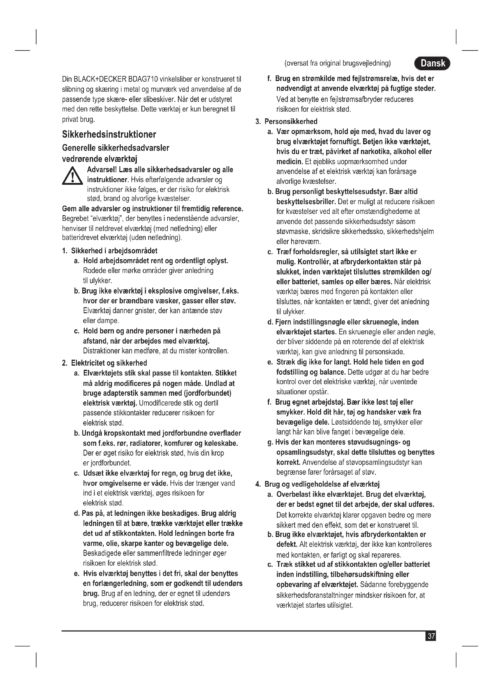 (oversat fra original brugsvejledning) Dansk (oversat fra original brugsvejledning) Din BLACK+DECKER BDAG710 vinkelsliber er konstrueret til slibning og skæring i metal og murværk ved anvendelse af de passende type skære- eller slibeskiver. Når det er udstyret med den rette beskyttelse. Dette værktøj er kun beregnet til privat brug. Sikkerhedsinstruktioner Generelle sikkerhedsadvarsler vedrørende elværktøj