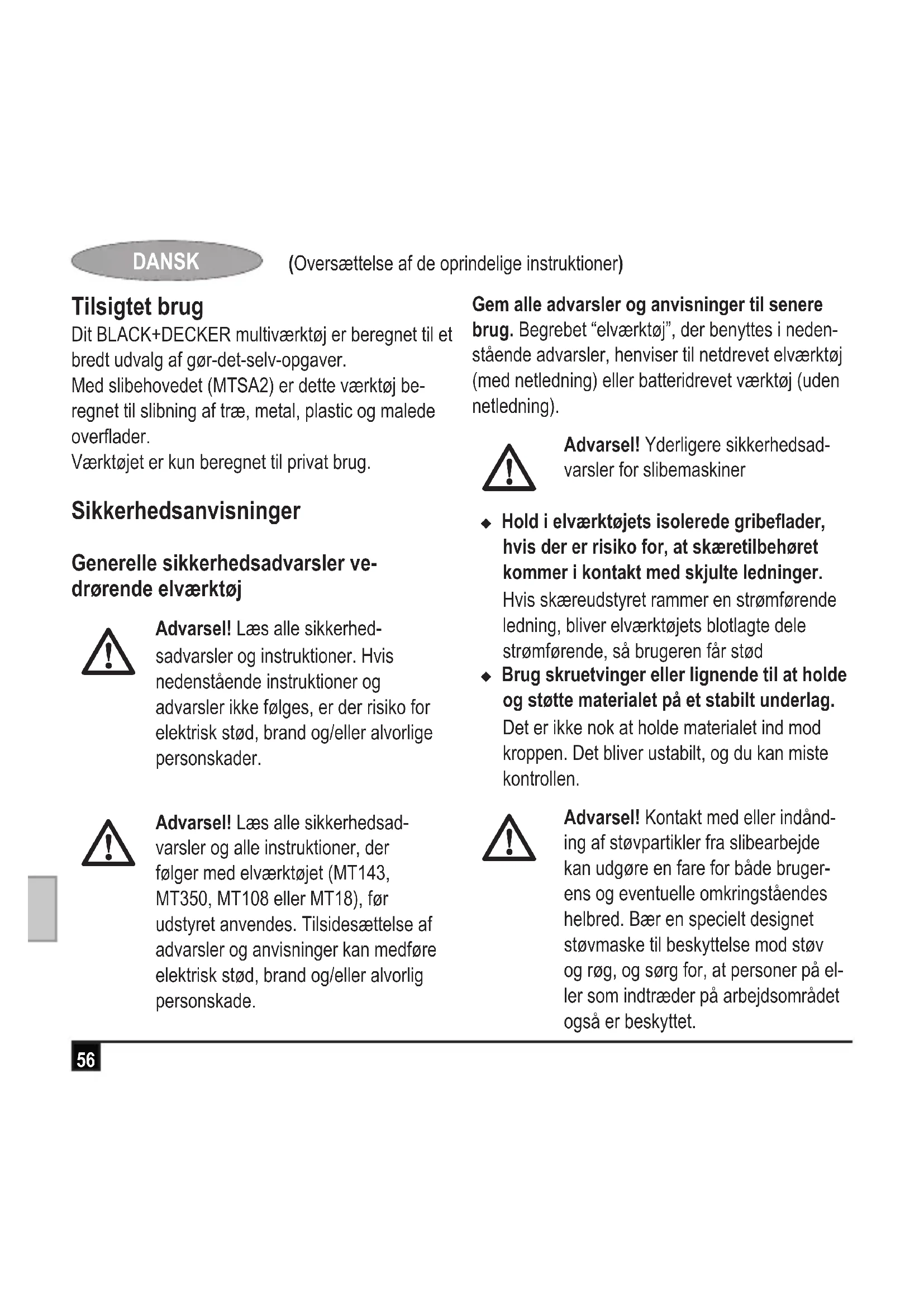 MTSA2 Black & Decker erklærer at disse produktene som er beskrevet under “Tekniske data”, er i samsvar med: 2006/42/EF, EN60745-1, EN60745-2-4 Disse produktene er også i samsvar med direktiv 2014/30/EU og 2011/65/EU. Hvis du ønsker mer informasjon, kontakt Black & Decker på følgende adresse, eller se på baksiden av håndboken. Undertegnede er ansvarlig for utarbeidelsen av den tekniske dokumentasjonen og gir denne erklæringen på vegne av Black & Decker. R. Laverick Engineering Manager Black & Decker Europe, 210 Bath Road, Slough, Berkshire, SL1 3YD Storbritannia 15/09/201456 (Oversættelse af de oprindelige instruktioner) DANSK Tilsigtet brug Dit BLACK+DECKER multiværktøj er beregnet til et bredt udvalg af gør-det-selv-opgaver. Med slibehovedet (MTSA2) er dette værktøj be- regnet til slibning af træ, metal, plastic og malede overader. Værktøjet er kun beregnet til privat brug. Sikkerhedsanvisninger Generelle sikkerhedsadvarsler ve- drørende elværktøj