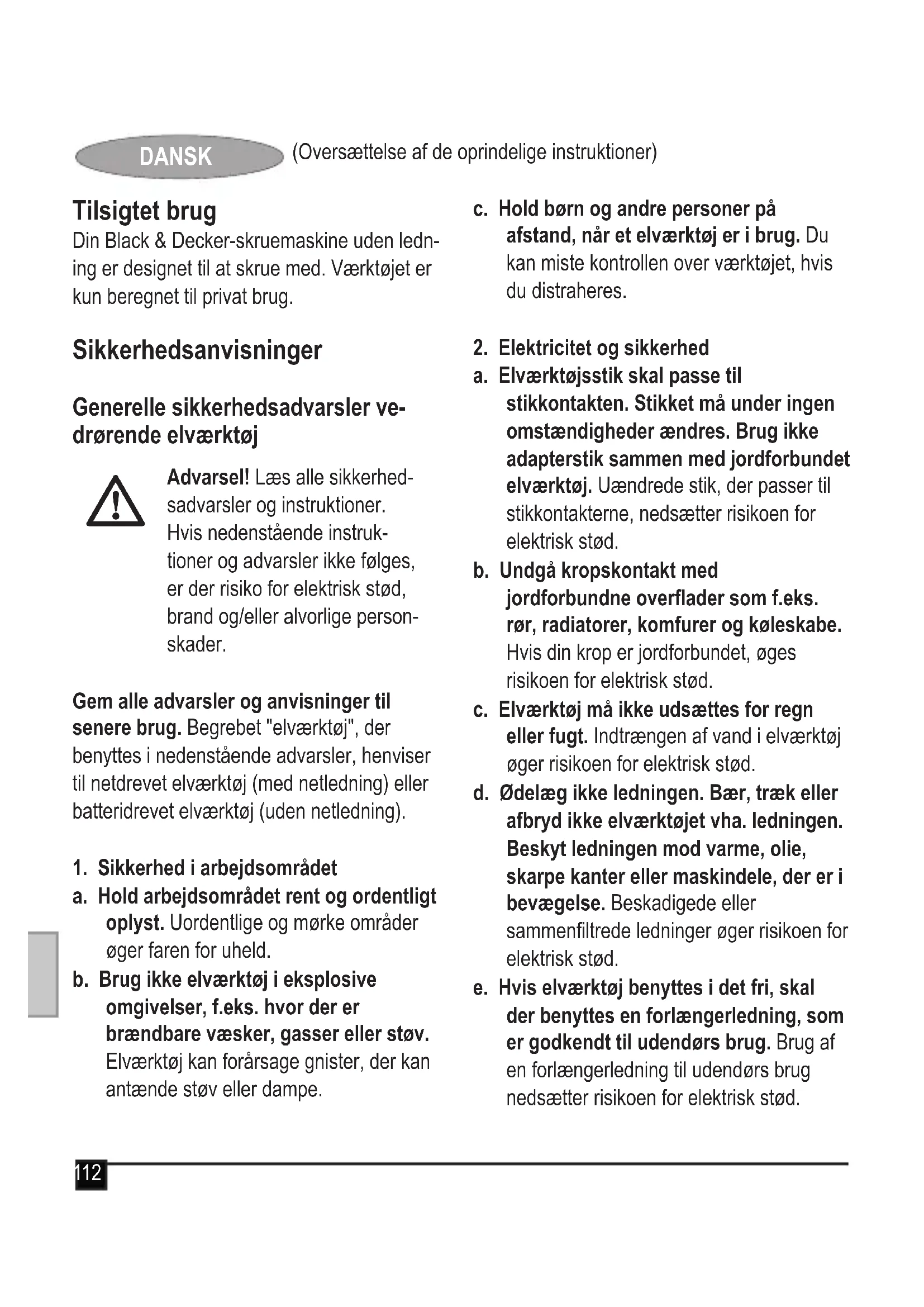 Kevin Hewitt Vice-President Global Engineering Black & Decker Europe, 210 Bath Road, Slough, Berkshire, SL1 3YD Storbritannien 28/05/2013122 (Oversættelse af de oprindelige instruktioner) DANSK Garanti Black & Decker garanterer, at produktet er fri for skader og fejl og tilbyder en fremragende garanti. Garantien er et tillæg til forbrugerens lovsikrede rettigheder og påvirker ikke disse. Garantien gælder inden for medlemsstaterne af den Europæiske Union og i det Europæiske Frihandelsområde. Hvis et Black & Decker-produkt går i stykker på grund af materiel skade og/eller fabrika- tionsfejl eller på anden måde ikke fungerer i overensstemmelse med specikationen inden for 24 måneder fra købsdatoen, påtager Black & Decker sig at reparere eller ombytte produk- tet med mindst mulig ulempe for kunden. Garantien gælder ikke for fejl og mangler, der er sket i forbindelse med: u Produktet har været anvendt erhvervs- mæssigt eller til udlejning. u Produktet har været anvendt forkert eller er ikke vedligeholdt. u Produktet er beskadiget af fremmedlege- mer, substanser eller pga. uheld. u Garantien gælder ikke, hvis reparationer er udført af andre end et autoriseret Black & Decker-værksted. For at udnytte garantien skal produktet og købskvitteringen indleveres til forhandleren eller til et autoriseret værksted. Kontakt det lokale Black & Decker-kontor på den adresse, der er opgivet i denne vejledning, for at få oplysninger om nærmeste autoriserede værk- sted. En liste over alle autoriserede Black & Decker-serviceværksteder samt servicevilkår og kontaktpersoner er tilgængelig på internet- tet på adressen: www.2helpU.com Gå venligst ind på vores website www. blackanddecker.dk for at registrere dit nye produkt og for at blive holdt ajour om nye produkter og specialtilbud. Der ndes yder- ligere oplysninger om mærket Black & Decker og vores produktsortiment på adressen www. blackanddecker.dk123 (Alkuperäisten ohjeiden käännös) SUOMI Käyttötarkoitus Black & Deckerin ruuvinväännin on suunnitel- tu ruuvaamiseen. Tämä työkalu on tarkoitettu vain yksityiskäyttöön. Turvallisuusohjeet Sähkötyökalujen yleiset turvavar- oitukset