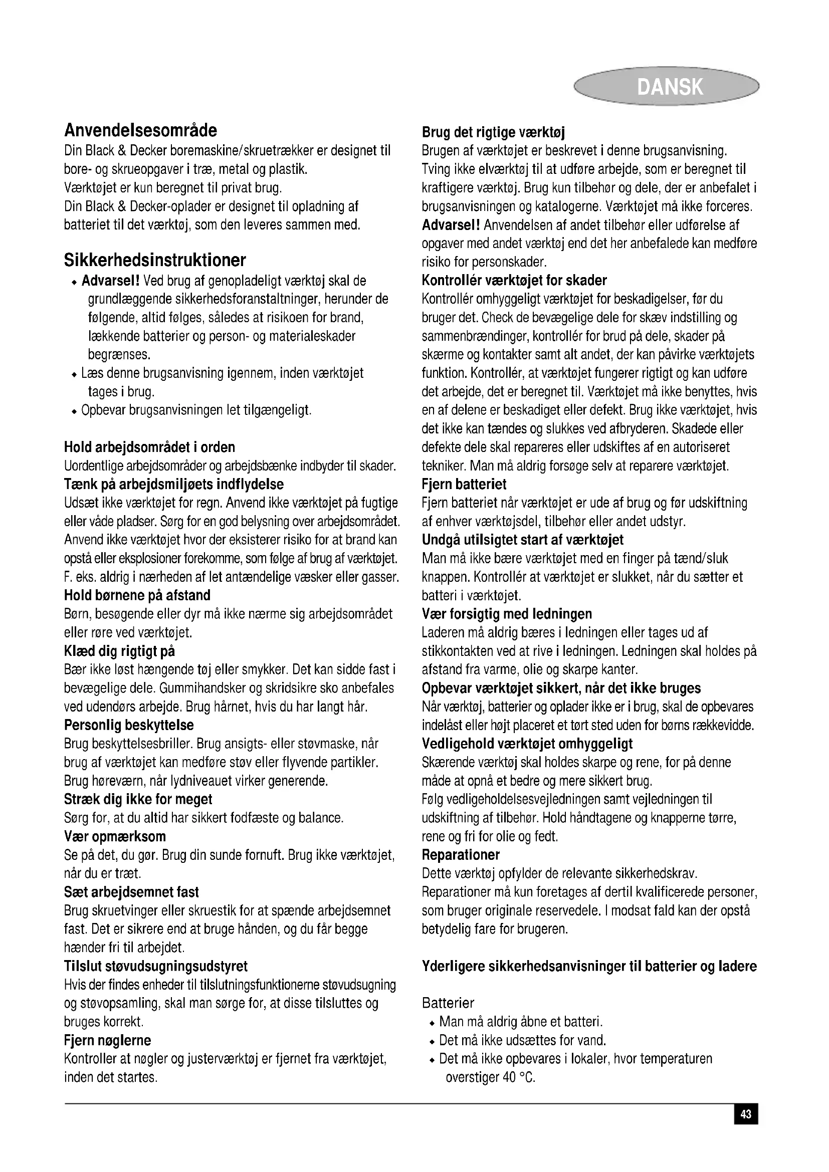 Colin Wills Director of Engineering BDCI, 4/F, 2 Dai Wang Street Tai Po Industrial Estate Tai Po NT, Hong Kong Reservdeler / reparasjoner Reservdeler kan kjøpes hos autoriserte Black & Decker serviceverksteder, som også gir kostnadsoverslag og reparerer våre produkter. Oversikt over våre autoriserte serviceverksteder finnes på Internet, vår hjemmeside www.blackdecker.no samt www.2helpU.com. Garanti Black & Decker garanterer at produktet ikke har material- og/ eller fabrikasjonsfeil ved levering til kunde. Garantien er i tillegg til kundens lovlige rettigheter og påvirker ikke disse. Garantien gjelder innen medlemsstatene i den Europeiske Unionen og i det Europeiske Frihandelsområdet. Hvis et Black & Decker produkt går i stykker på grunn av material- og/eller fabrikasjonsfeil eller har mangler i forhold til spesifikasjonene, innen 24 måneder fra kjøpet, påtar Black & Decker seg å reparere eller bytte ut produktet med minst mulig vanskelighet for kunden. Garantien gjelder ikke for feil som kommer av: ◆ normal slittasje◆ feilaktig bruk eller vedlikehold (mislighold)◆ at produktet har blitt skadet av fremmede gjenstander, emner eller ved et uhell Det gjøres oppmerksom på at produktet ikke er beregnet på industriell/profesjonell/yrkesmessig bruk, men til hus- og hjemmebruk. Garantien gjelder ikke om reparasjoner har blitt utført av noen andre enn et autorisert Black & Decker serviceverksted. For å ta garantien i bruk skal produktet og kjøpekvittering leveres til forhandleren eller til et autorisert serviceverksted senest 2 måneder etter at feilen har blitt oppdaget. For informasjon om nærmeste autoriserte serviceverksted; kontakt det lokale Black & Decker kontoret på den adressen som er angitt i bruksanvisningen. En oversikt over alle autoriserte serviceverksteder samt servicevilkår finnes også tilgjengelig på Internet, adresse: www.2helpU.com.43 DANSK Anvendelsesområde Din Black & Decker boremaskine/skruetrækker er designet til bore- og skrueopgaver i træ, metal og plastik. Værktøjet er kun beregnet til privat brug. Din Black & Decker-oplader er designet til opladning af batteriet til det værktøj, som den leveres sammen med. Sikkerhedsinstruktioner ◆ Advarsel! Ved brug af genopladeligt værktøj skal de grundlæggende sikkerhedsforanstaltninger, herunder de følgende, altid følges, således at risikoen for brand, lækkende batterier og person- og materialeskader begrænses. ◆ Læs denne brugsanvisning igennem, inden værktøjet tages i brug. ◆ Opbevar brugsanvisningen let tilgængeligt. Hold arbejdsområdet i orden Uordentlige arbejdsområder og arbejdsbænke indbyder til skader. Tænk på arbejdsmiljøets indflydelse Udsæt ikke værktøjet for regn. Anvend ikke værktøjet på fugtige eller våde pladser. Sørg for en god belysning over arbejdsområdet. Anvend ikke værktøjet hvor der eksisterer risiko for at brand kan opstå eller eksplosioner forekomme, som følge af brug af værktøjet. F. eks. aldrig i nærheden af let antændelige væsker eller gasser. Hold børnene på afstand Børn, besøgende eller dyr må ikke nærme sig arbejdsområdet eller røre ved værktøjet. Klæd dig rigtigt på Bær ikke løst hængende tøj eller smykker. Det kan sidde fast i bevægelige dele. Gummihandsker og skridsikre sko anbefales ved udendørs arbejde. Brug hårnet, hvis du har langt hår. Personlig beskyttelse Brug beskyttelsesbriller. Brug ansigts- eller støvmaske, når brug af værktøjet kan medføre støv eller flyvende partikler. Brug høreværn, når lydniveauet virker generende. Stræk dig ikke for meget Sørg for, at du altid har sikkert fodfæste og balance. Vær opmærksom Se på det, du gør. Brug din sunde fornuft. Brug ikke værktøjet, når du er træt. Sæt arbejdsemnet fast Brug skruetvinger eller skruestik for at spænde arbejdsemnet fast. Det er sikrere end at bruge hånden, og du får begge hænder fri til arbejdet. Tilslut støvudsugningsudstyret Hvis der findes enheder til tilslutningsfunktionerne støvudsugning og støvopsamling, skal man sørge for, at disse tilsluttes og bruges korrekt. Fjern nøglerne Kontroller at nøgler og justerværktøj er fjernet fra værktøjet, inden det startes. Brug det rigtige værktøj Brugen af værktøjet er beskrevet i denne brugsanvisning. Tving ikke elværktøj til at udføre arbejde, som er beregnet til kraftigere værktøj. Brug kun tilbehør og dele, der er anbefalet i brugsanvisningen og katalogerne. Værktøjet må ikke forceres. Advarsel! Anvendelsen af andet tilbehør eller udførelse af opgaver med andet værktøj end det her anbefalede kan medføre risiko for personskader. Kontrollér værktøjet for skader Kontrollér omhyggeligt værktøjet for beskadigelser, før du bruger det. Check de bevægelige dele for skæv indstilling og sammenbrændinger, kontrollér for brud på dele, skader på skærme og kontakter samt alt andet, der kan påvirke værktøjets funktion. Kontrollér, at værktøjet fungerer rigtigt og kan udføre det arbejde, det er beregnet til. Værktøjet må ikke benyttes, hvis en af delene er beskadiget eller defekt. Brug ikke værktøjet, hvis det ikke kan tændes og slukkes ved afbryderen. Skadede eller defekte dele skal repareres eller udskiftes af en autoriseret tekniker. Man må aldrig forsøge selv at reparere værktøjet. Fjern batteriet Fjern batteriet når værktøjet er ude af brug og før udskiftning af enhver værktøjsdel, tilbehør eller andet udstyr. Undgå utilsigtet start af værktøjet Man må ikke bære værktøjet med en finger på tænd/sluk knappen. Kontrollér at værktøjet er slukket, når du sætter et batteri i værktøjet. Vær forsigtig med ledningen Laderen må aldrig bæres i ledningen eller tages ud af stikkontakten ved at rive i ledningen. Ledningen skal holdes på afstand fra varme, olie og skarpe kanter. Opbevar værktøjet sikkert, når det ikke bruges Når værktøj, batterier og oplader ikke er i brug, skal de opbevares indelåst 