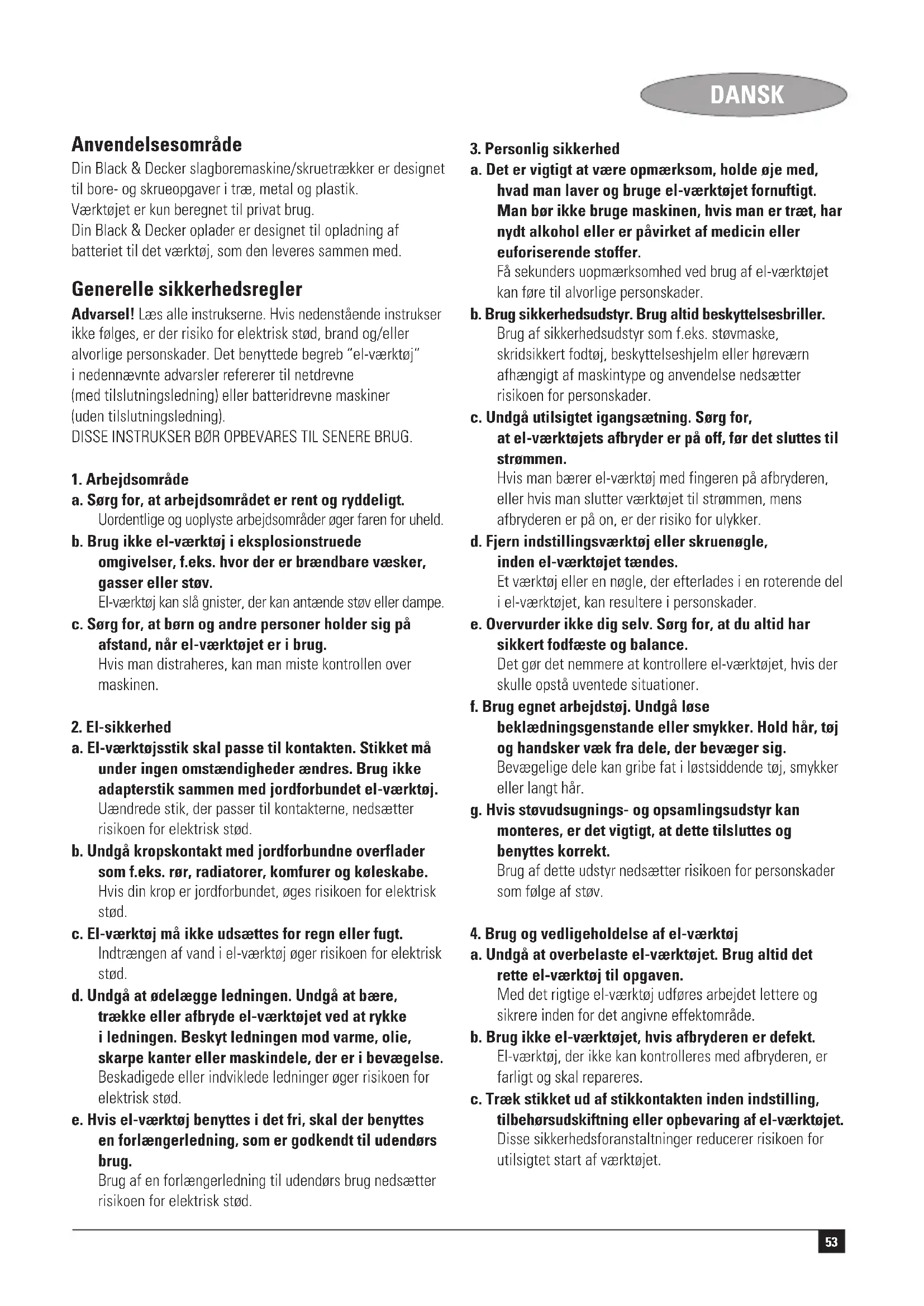 a. Sørg for, at el-værktøjet kun repareres af kvalificerede fagfolk, og at der kun benyttes originale reservedele. Dermed opretholdes el-værktøjets sikkerhed. Yderligere sikkerhedsanvisninger til slagbor ◆ Brug høreværn, når du bruger slagbor. Udsættelse for støj kan forårsage tab af hørelse. ◆ Brug de hjælpehåndtag, der følger med maskinen. Tab af kontrol kan forårsage lemlæstelser. Yderligere sikkerhedsvejledninger til kombineret boremaskine/skruetrækker ◆ Hold fast på maskinen på de isolerede håndtagsflader, når der skal udføres noget, hvor der er risiko for, at skæreværktøjet kan komme i kontakt med skjulte strømførende ledninger eller apparatets eget kabel. Ved kontakt med strømførende ledninger vil metaldelene på maskinen være under spænding og give elektrisk stød. ◆ Brug spænder eller en anden praktisk måde at sikre og støtte arbejdsemnet til en stabil flade. Hvis det holdes i hånden eller mod kroppen, er det ustabilt og kan føre til tab af kontrol. ◆ Før der bores i vægge, gulve eller lofter checkes ledningers og rørs placering. ◆ Man skal undgå at røre borespidsen lige efter, at man har boret, idet den kan være varm. Yderligere sikkerhedsanvisninger til batterier og opladere Batterier ◆ Man må aldrig forsøge at åbne et batteri. ◆ Udsæt ikke batteriet for vand. ◆ Det må ikke opbevares i et lokale, hvor temperaturen overstiger 40 °C. ◆ Det må kun oplades ved omgivelsestemperaturer mellem 10 °C og 40 °C. ◆ Oplad kun med den vedlagte oplader. ◆ Ved kassering af batterier, skal man følge vejledningen i afsnittet “Miljøbeskyttelse”. Opladere ◆ Din Black & Decker lader må kun benyttes til Black & Decker batterier af samme slags som dem, der fulgte med værktøjet. Andre batterier kan eksplodere og derved forårsage personskader og skader på ting. ◆ Man må aldrig forsøge at genoplade ikke-opladelige batterier. ◆ Defekte ledninger skal straks udskiftes. ◆ Udsæt ikke opladeren for vand.55 DANSK ◆ Opladeren må ikke åbnes. ◆ Opladeren må ikke manipuleres. Opladeren er kun beregnet til indendørs brug. Læs brugsanvisningen, før du tager værktøjet i brug. Fejlsikker isolerende transformer. Strømforsyningen er elektrisk adskilt fra transformerens udgang. Opladeren afbrydes automatisk, hvis den omgivende temperatur bliver for høj. Som følge heraf kan opladeren ikke længere fungere. Denne enhed skal afbrydes fra strømforsyningen og bringes til reparation på autoriseret serviceværksted. Elektrisk sikkerhed Laderen er dobbelt isoleret; jordledning er derfor ikke påkrævet. Kontroller, om laderens spænding svarer til lysnettets spænding. Forsøg aldrig at udskifte laderenheden med et almindeligt netstik. ◆ Dette apparat er ikke beregnet til at blive betjent af unge eller uerfarne personer uden opsyn. Der skal være opsyn med børn for at sikre, at de ikke leger med maskinen. ◆ Hvis el-ledningen er skadet, skal den udskiftes af producenten eller et autoriseret Black & Decker servicecenter for at undgå ulykker. Oversigt