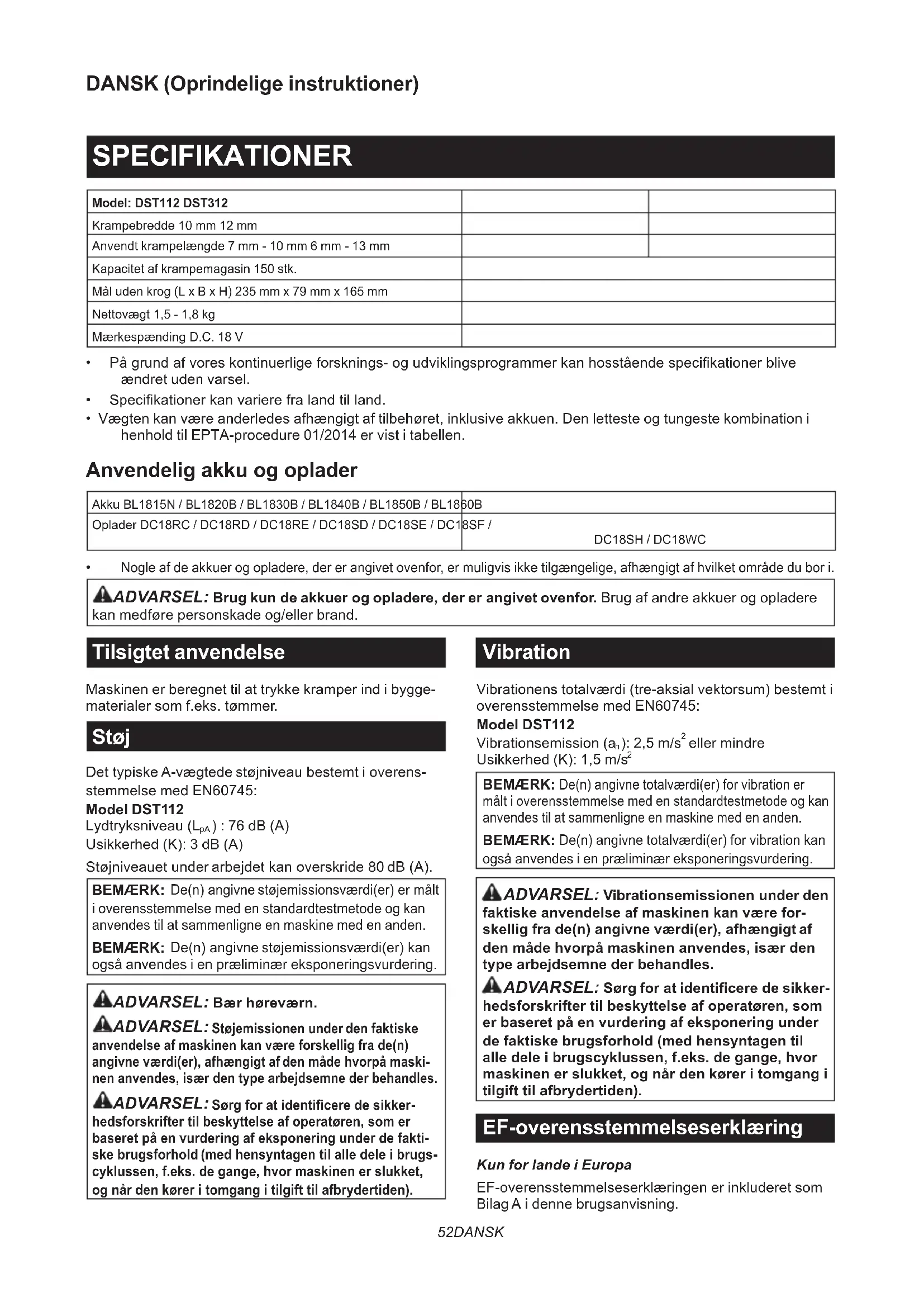Nogle af de akkuer og opladere, der er angivet ovenfor, er muligvis ikke tilgængelige, afhængigt af hvilket område du bor i. ADVARSEL: Brug kun de akkuer og opladere, der er angivet ovenfor. Brug af andre akkuer og opladere kan medføre personskade og/eller brand. Tilsigtet anvendelse Maskinen er beregnet til at trykke kramper ind i bygge- materialer som f.eks. tømmer. Støj DettypiskeA-vægtedestøjniveaubestemtioverens- stemmelse med EN60745: Model DST112 Lydtryksniveau (L