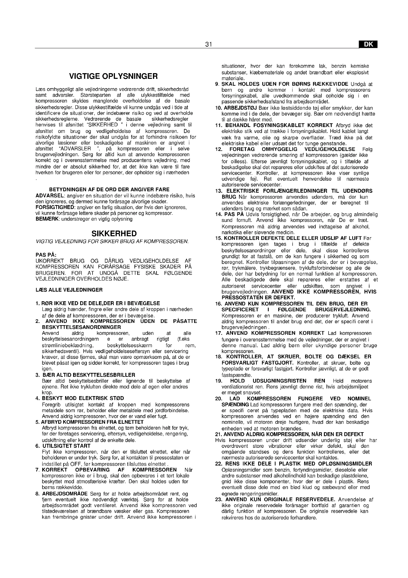 VIGTIGE OPLYSNINGER Læs omhyggeligt alle vejledningerne vedrørende drift, sikkerhedsråd samt advarsler. Størsteparten af alle ulykkestilfælde med kompressoren skyldes manglende overholdelse af de basale sikkerhedsregler. Disse ulykkestilfælde vil kunne undgås ved i tide at identificere de situationer, der indebærer risiko og ved at overholde sikkerhedsreglerne. Vedrørende de basale sikkerhedsregler henvises til afsnittet “SIKKERHED ” i denne vejledning samt til afsnittet om brug og vedligeholdelse af kompressoren. De risikofyldte situationer der skal undgås for at forhindre risikoen for alvorlige læsioner eller beskadigelse af maskinen er angivet i afsnittet “ADVARSLER ”, på kompressoren eller i selve brugervejledningen. Sørg for altid kun at anvende kompressoren korrekt og i overensstemmelse med producentens vejledning, med mindre der er absolut sikkerhed for, at det ikke kan være til fare hverken for brugeren eller for personer, der opholder sig i nærheden