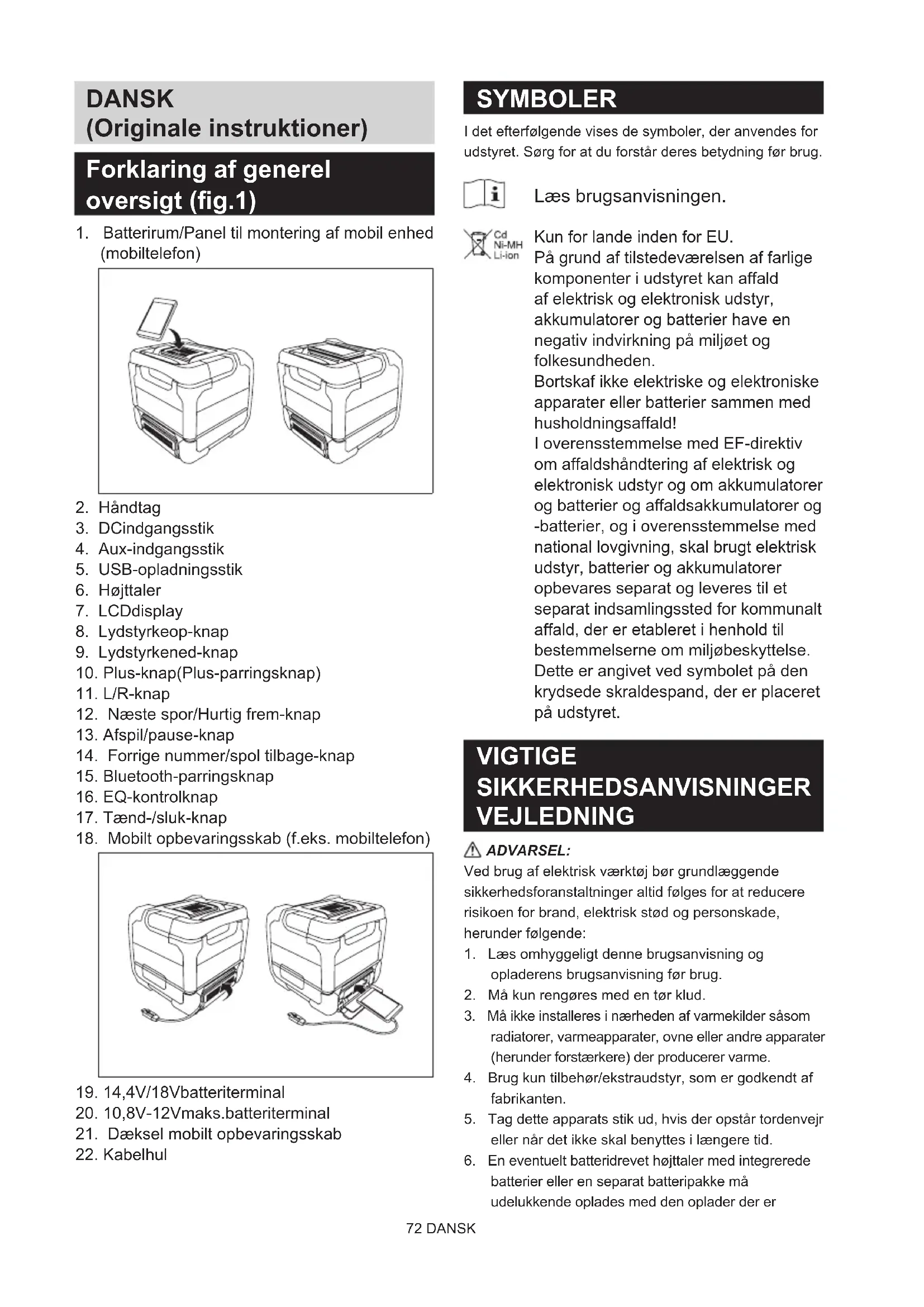 instruktioner og advarselsmarkeringer på (1) batterioplader, (2) batteri og (3) produktet, som batteri skal bruges i.