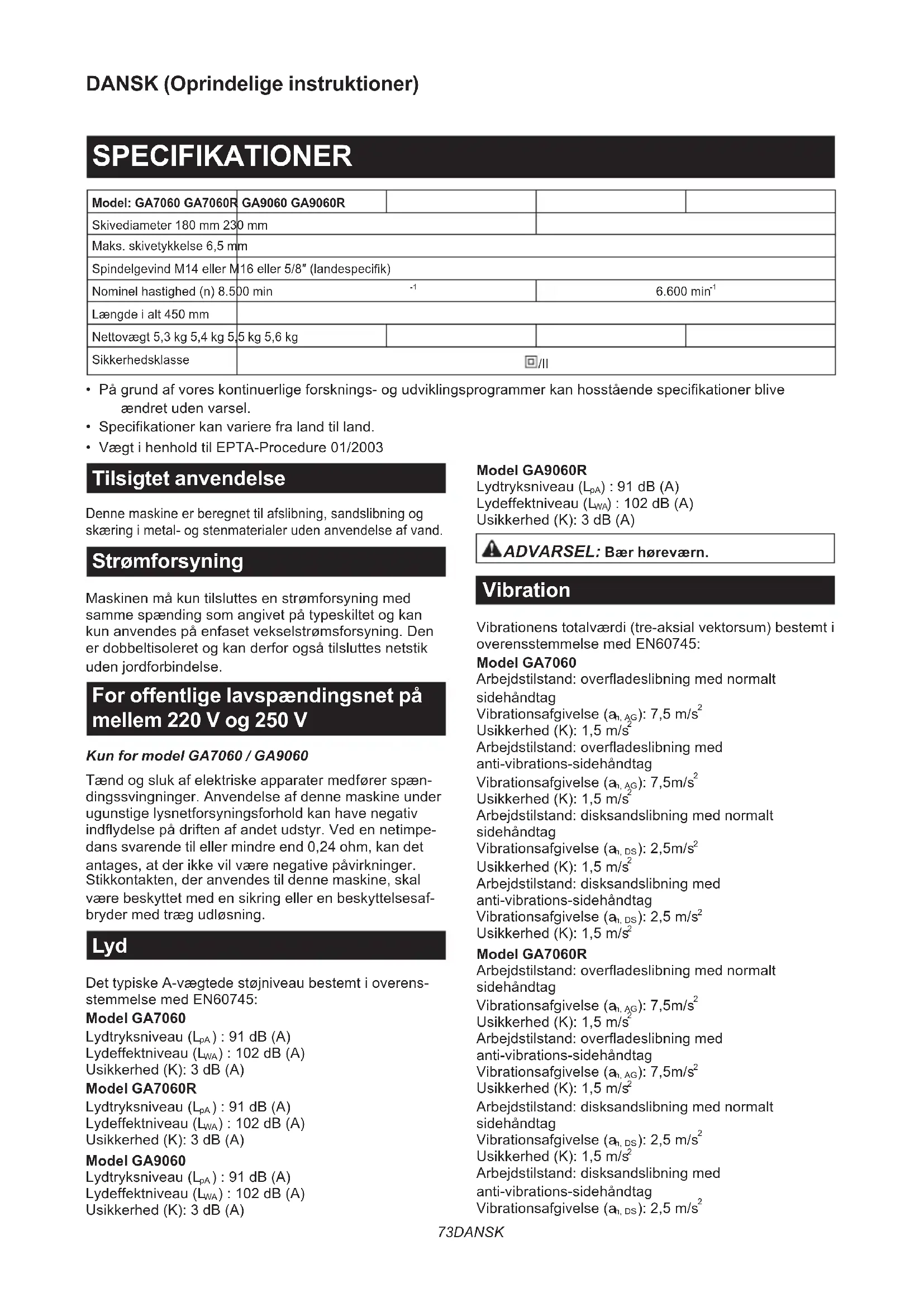 - Vægt i henhold til EPTA-Procedure 01/2003 Tilsigtet anvendelse Denne maskine er beregnet til afslibning, sandslibning og skæring i metal- og stenmaterialer uden anvendelse af vand. Strømforsyning Maskinen må kun tilsluttes en strømforsyning med samme spænding som angivet på typeskiltet og kan kun anvendes på enfaset vekselstrømsforsyning. Den er dobbeltisoleret og kan derfor også tilsluttes netstik uden jordforbindelse. For offentlige lavspændingsnet på mellem 220 V og 250 V Kun for model GA7060 / GA9060 Tænd og sluk af elektriske apparater medfører spæn- dingssvingninger. Anvendelse af denne maskine under ugunstige lysnetforsyningsforhold kan have negativ indydelse på driften af andet udstyr. Ved en netimpe- dans svarende til eller mindre end 0,24 ohm, kan det antages, at der ikke vil være negative påvirkninger. Stikkontakten, der anvendes til denne maskine, skal være beskyttet med en sikring eller en beskyttelsesaf- bryder med træg udløsning. Lyd Det typiske A-vægtede støjniveau bestemt i overens- stemmelse med EN60745: Model GA7060 Lydtryksniveau (L