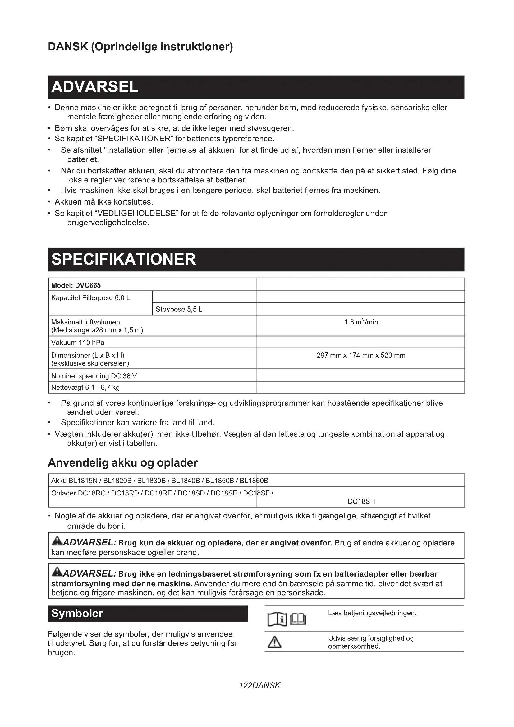 - Nogle af de akkuer og opladere, der er angivet ovenfor, er muligvis ikke tilgængelige, afhængigt af hvilket område du bor i. ADVARSEL: Brug kun de akkuer og opladere, der er angivet ovenfor. Brug af andre akkuer og opladere kan medføre personskade og/eller brand. ADVARSEL: Brug ikke en ledningsbaseret strømforsyning som fx en batteriadapter eller bærbar strømforsyning med denne maskine. Anvender du mere end én bæresele på samme tid, bliver det svært at betjeneogfrigøremaskinen,ogdetkanmuligvisforårsageenpersonskade. Symboler Følgende viser de symboler, der muligvis anvendes til udstyret. Sørg for, at du forstår deres betydning før brugen. Læsbetjeningsvejledningen. Udvis særlig forsigtighed og opmærksomhed.123 DANSK Ni-MH Li-ion Kun for lande inden for EU På grund af tilstedeværelsen af farlige komponenteriudstyretkanaaldafelek- trisk og elektronisk udstyr, akkumulatorer og batterier have en negativ indvirkning på miljøetogfolkesundheden. Bortskaf ikke elektriske og elektroniske apparater eller batterier sammen med husholdningsaald! I overensstemmelse med EF-direktiv om aaldshåndteringafelektriskogelektronisk udstyr og om akkumulatorer og batterier ogaaldsakkumulatorerog-batterier,og i overensstemmelse med national lovgiv- ning, skal brugt elektrisk udstyr, batterier og akkumulatorer opbevares separat og leveres til et separat indsamlingssted for kommunaltaald,dereretableretihenhold tilbestemmelserneommiljøbeskyttelse. Dette er angivet ved symbolet på den krydsede skraldespand, der er placeret på udstyret. Tilsigtet anvendelse Apparatet er beregnet til opsugning af tørt støv. Apparatet er egnet til kommerciel brug, for eksempel i hoteller, skoler, hospitaler, fabrikker, butikker, kontorer ogudlejningsvirksomheder. Støj DettypiskeA-vægtedestøjniveaubestemtioverens- stemmelse med IEC60335-2-69, IEC60704-2-1: Lydtryksniveau (L