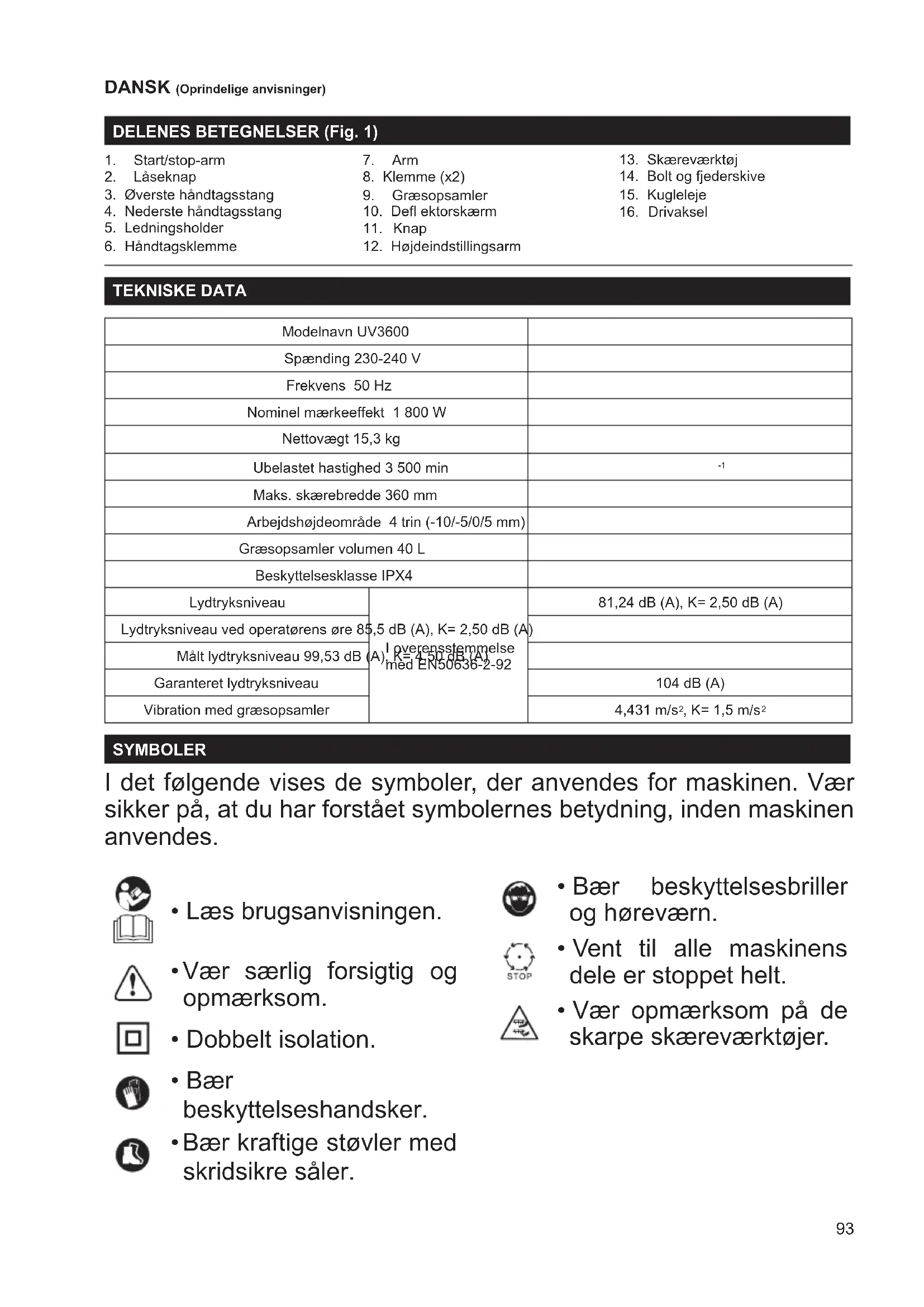 Maks. skærebredde 360 mm Arbejdshøjdeområde 4 trin (-10/-5/0/5 mm) Græsopsamler volumen 40 L Beskyttelsesklasse IPX4 Lydtryksniveau I overensstemmelse med EN50636-2-92 81,24 dB (A), K= 2,50 dB (A) Lydtryksniveau ved operatørens øre 85,5 dB (A), K= 2,50 dB (A) Målt lydtryksniveau 99,53 dB (A), K= 4,50 dB (A) Garanteret lydtryksniveau 104 dB (A) Vibration med græsopsamler 4,431 m/s