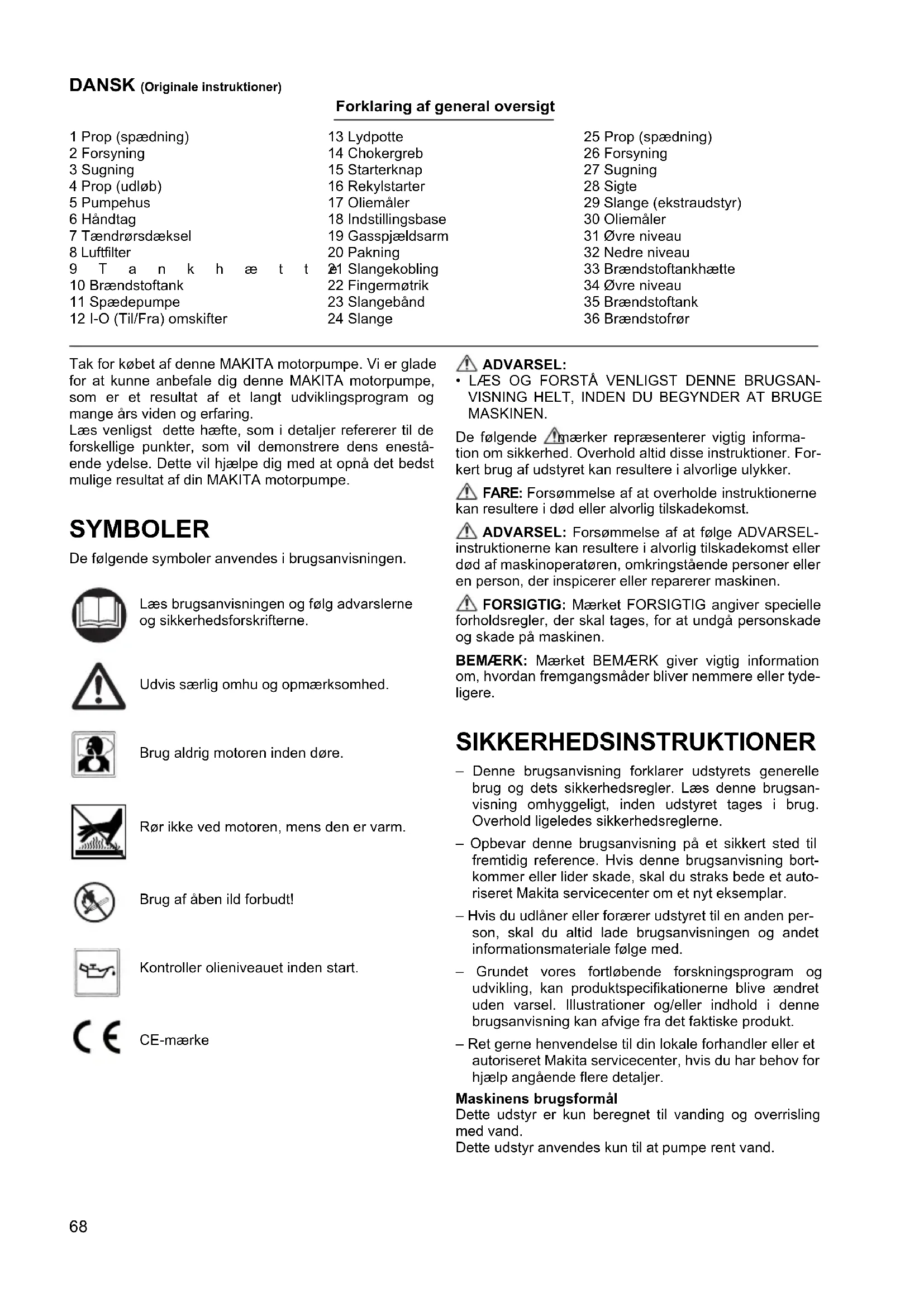 - LÆS OG FORSTÅ VENLIGST DENNE BRUGSAN- VISNING HELT, INDEN DU BEGYNDER AT BRUGE MASKINEN. De følgende mærker repræsenterer vigtig informa- tion om sikkerhed. Overhold altid disse instruktioner. For- kert brug af udstyret kan resultere i alvorlige ulykker. FARE: Forsømmelse af at overholde instruktionerne kan resultere i død eller alvorlig tilskadekomst. ADVARSEL: Forsømmelse af at følge ADVARSEL- instruktionerne kan resultere i alvorlig tilskadekomst eller død af maskinoperatøren, omkringstående personer eller en person, der inspicerer eller reparerer maskinen. FORSIGTIG: Mærket FORSIGTIG angiver specielle forholdsregler, der skal tages, for at undgå personskade og skade på maskinen. BEMÆRK: Mærket BEMÆRK giver vigtig information om, hvordan fremgangsmåder bliver nemmere eller tyde- ligere. SIKKERHEDSINSTRUKTIONER – Denne brugsanvisning forklarer udstyrets generelle brug og dets sikkerhedsregler. Læs denne brugsan- visning omhyggeligt, inden udstyret tages i brug. Overhold ligeledes sikkerhedsreglerne. – Opbevar denne brugsanvisning på et sikkert sted til fremtidig reference. Hvis denne brugsanvisning bort- kommer eller lider skade, skal du straks bede et auto- riseret Makita servicecenter om et nyt eksemplar. – Hvis du udlåner eller forærer udstyret til en anden per- son, skal du altid lade brugsanvisningen og andet informationsmateriale følge med. – Grundet vores fortløbende forskningsprogram og udvikling, kan produktspecifikationerne blive ændret uden varsel. Illustrationer og/eller indhold i denne brugsanvisning kan afvige fra det faktiske produkt. – Ret gerne henvendelse til din lokale forhandler eller et autoriseret Makita servicecenter, hvis du har behov for hjælp angående flere detaljer. Maskinens brugsformål Dette udstyr er kun beregnet til vanding og overrisling med vand. Dette udstyr anvendes kun til at pumpe rent vand. Læs brugsanvisningen og følg advarslerne og sikkerhedsforskrifterne. Udvis særlig omhu og opmærksomhed. Brug aldrig motoren inden døre. Rør ikke ved motoren, mens den er varm. Brug af åben ild forbudt! Kontroller olieniveauet inden start. CE-mærke69 FARE: