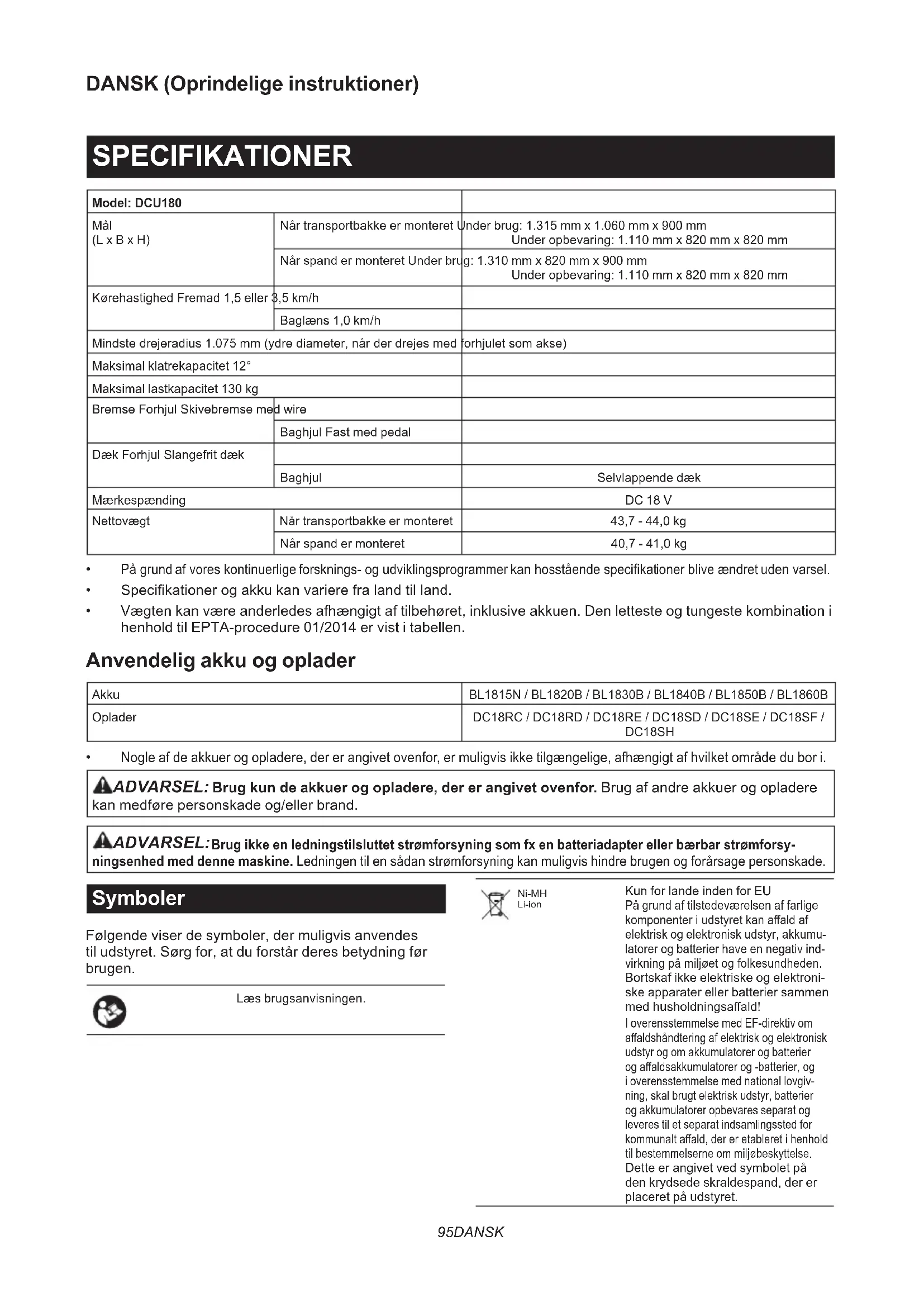 Nogle af de akkuer og opladere, der er angivet ovenfor, er muligvis ikke tilgængelige, afhængigt af hvilket område du bor i. ADVARSEL: Brug kun de akkuer og opladere, der er angivet ovenfor. Brug af andre akkuer og opladere kan medføre personskade og/eller brand. ADVARSEL: Brug ikke en ledningstilsluttet strømforsyning som fx en batteriadapter eller bærbar strømforsy- ningsenhed med denne maskine. Ledningen til en sådan strømforsyning kan muligvis hindre brugen og forårsage personskade. Symboler Følgende viser de symboler, der muligvis anvendes til udstyret. Sørg for, at du forstår deres betydning før brugen. Læs brugsanvisningen. Ni-MH Li-ion Kun for lande inden for EU På grund af tilstedeværelsen af farlige komponenter i udstyret kan aald af elektrisk og elektronisk udstyr, akkumu- latorer og batterier have en negativ ind- virkning på miljøet og folkesundheden. Bortskaf ikke elektriske og elektroni- ske apparater eller batterier sammen med husholdningsaald! I overensstemmelse med EF-direktiv om aaldshåndtering af elektrisk og elektronisk udstyr og om akkumulatorer og batterier og aaldsakkumulatorer og -batterier, og i overensstemmelse med national lovgiv- ning, skal brugt elektrisk udstyr, batterier og akkumulatorer opbevares separat og leveres til et separat indsamlingssted for kommunalt aald, der er etableret i henhold til bestemmelserne om miljøbeskyttelse. Dette er angivet ved symbolet på den krydsede skraldespand, der er placeret på udstyret.96 DANSK Træk armen helt ned, og kontroller, at transportbakken eller spanden er låst fast.Skift ikke retning på stejle skrænter.Læs og aæs genstande på ad grund.Fordel genstande jævnt i transport-bakken eller spanden.Denne maskine må ikke benyttes på oentlig vej.Brug ikke til at transportere personer.Udsæt ikke for regn.For at annullere biplyden skal du slippe afbryderknappen og trække bremsearmen.Undlad at se ind i strålen.Garanteret lydeektniveau i henhold til EU-direktivet om maskiner til udendørs brug.Lydeektniveau i henhold til Australiens NSW forordning om støjemission Tilsigtet anvendelse Denne maskine er beregnet til at læsse og transportere genstande med batteridrevet hjælp. Støj Det typiske A-vægtede støjniveau bestemt i overens- stemmelse med EN62841-1: Lydtryksniveau (L