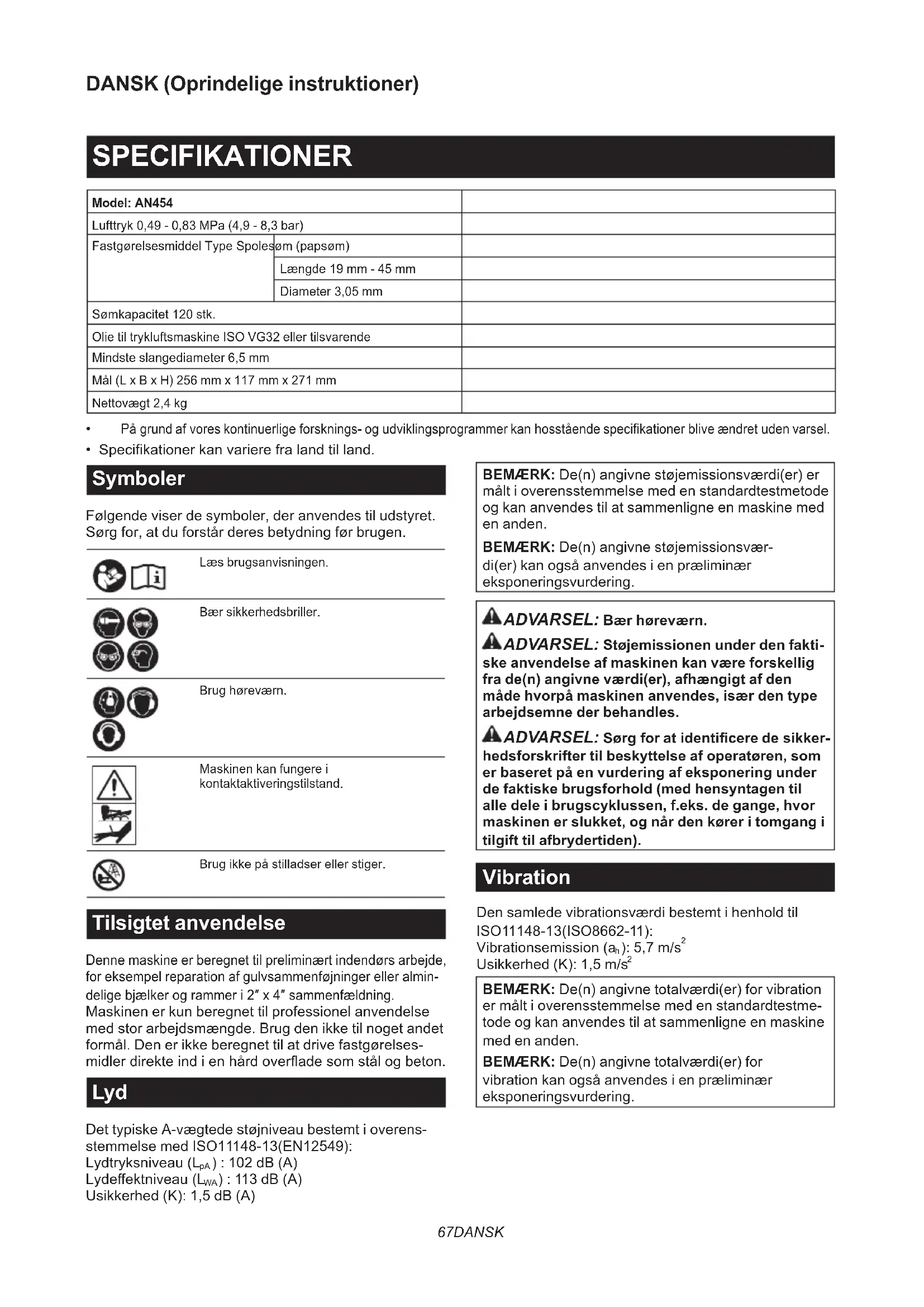 BEMÆRK: De(n) angivne totalværdi(er) for vibration er målt i overensstemmelse med en standardtestme- tode og kan anvendes til at sammenligne en maskine med en anden. BEMÆRK: De(n) angivne totalværdi(er) for vibration kan også anvendes i en præliminær eksponeringsvurdering.68 DANSK ADVARSEL: Vibrationsemissionen under den faktiske anvendelse af maskinen kan være for- skellig fra de(n) angivne værdi(er), afhængigt af den måde hvorpå maskinen anvendes, især den type arbejdsemne der behandles. ADVARSEL: Sørg for at identicere de sikker- hedsforskrifter til beskyttelse af operatøren, som er baseret på en vurdering af eksponering under de faktiske brugsforhold (med hensyntagen til alle dele i brugscyklussen, f.eks. de gange, hvor maskinen er slukket, og når den kører i tomgang i tilgift til afbrydertiden). EU-overensstemmelseserklæring Kun for lande i Europa EU-overensstemmelseserklæringen er inkluderet som Bilag A i denne brugsanvisning. SIKKERHEDSADVARSLER Sikkerhedsadvarsler for tryklufts sømpistol/krampemaskine ADVARSEL: Læs alle sikkerhedsadvarsler og alle instruktioner. Hvis De ikke følger advarslerne og instruktionerne, kan det medføre alvorlig person- skade, elektrisk stød og/eller brand. Gem alle advarsler og instruktio- ner til fremtidig reference. Af hensyn til Deres personlige sikkerhed samt for kor- rekt betjening og vedligeholdelse af maskinen skal De læse denne brugsanvisning, før De bruger maskinen. Generel sikkerhed
