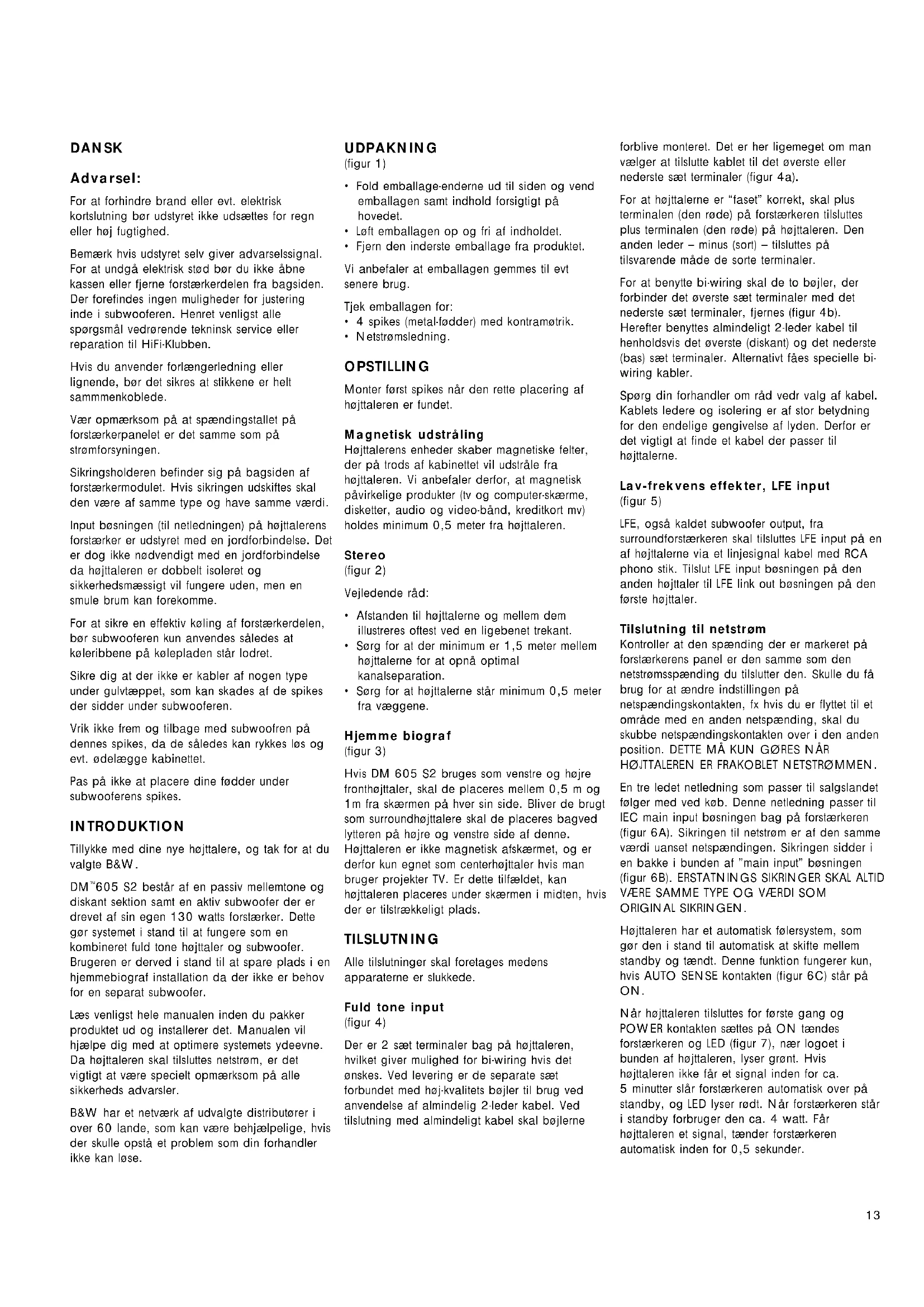 - Sørg for at højttalerne står minimum 0,5 meter fra væggene. Hjemme biograf (figur 3) Hvis DM 605 S2 bruges som venstre og højre fronthøjttaler, skal de placeres mellem 0,5 m og 1m fra skærmen på hver sin side. Bliver de brugt som surroundhøjttalere skal de placeres bagved lytteren på højre og venstre side af denne. Højttaleren er ikke magnetisk afskærmet, og er derfor kun egnet som centerhøjttaler hvis man bruger projekter TV. Er dette tilfældet, kan højttaleren placeres under skærmen i midten, hvis der er tilstrækkeligt plads. TILSLUTNING Alle tilslutninger skal foretages medens apparaterne er slukkede. Fuld tone input (figur 4) Der er 2 sæt terminaler bag på højttaleren, hvilket giver mulighed for bi-wiring hvis det ønskes. Ved levering er de separate sæt forbundet med høj-kvalitets bøjler til brug ved anvendelse af almindelig 2-leder kabel. Ved tilslutning med almindeligt kabel skal bøjlerne forblive monteret. Det er her ligemeget om man vælger at tilslutte kablet til det øverste eller nederste sæt terminaler (figur 4a). For at højttalerne er “faset” korrekt, skal plus terminalen (den røde) på forstærkeren tilsluttes plus terminalen (den røde) på højttaleren. Den anden leder – minus (sort) – tilsluttes på tilsvarende måde de sorte terminaler. For at benytte bi-wiring skal de to bøjler, der forbinder det øverste sæt terminaler med det nederste sæt terminaler, fjernes (figur 4b). Herefter benyttes almindeligt 2-leder kabel til henholdsvis det øverste (diskant) og det nederste (bas) sæt terminaler. Alternativt fåes specielle bi- wiring kabler. Spørg din forhandler om råd vedr valg af kabel. Kablets ledere og isolering er af stor betydning for den endelige gengivelse af lyden. Derfor er det vigtigt at finde et kabel der passer til højttalerne. Lav-frekvens effekter, LFE input (figur 5) LFE, også kaldet subwoofer output, fra surroundforstærkeren skal tilsluttes LFE input på en af højttalerne via et linjesignal kabel med RCA phono stik. Tilslut LFE input bøsningen på den anden højttaler til LFE link out bøsningen på den første højttaler. Tilslutning til netstrøm Kontroller at den spænding der er markeret på forstærkerens panel er den samme som den netstrømsspænding du tilslutter den. Skulle du få brug for at ændre indstillingen på netspændingskontakten, fx hvis du er flyttet til et område med en anden netspænding, skal du skubbe netspændingskontakten over i den anden position. DETTE MÅ KUN GØRES NÅR HØJTTALEREN ER FRAKOBLET NETSTRØMMEN. En tre ledet netledning som passer til salgslandet følger med ved køb. Denne netledning passer til IEC main input bøsningen bag på forstærkeren (figur 6A). Sikringen til netstrøm er af den samme værdi uanset netspændingen. Sikringen sidder i en bakke i bunden af ”main input” bøsningen (figur 6B). ERSTATNINGS SIKRINGER SKAL ALTID VÆRE SAMME TYPE OG VÆRDI SOM ORIGINAL SIKRINGEN. Højttaleren har et automatisk følersystem, som gør den i stand til automatisk at skifte mellem standby og tændt. Denne funktion fungerer kun, hvis AUTO SENSE kontakten (figur 6C) står på ON. Når højttaleren tilsluttes for første gang og POWER kontakten sættes på ON tændes forstærkeren og LED (figur 7), nær logoet i bunden af højttaleren, lyser grønt. Hvis højttaleren ikke får et signal inden for ca. 5 minutter slår forstærkeren automatisk over på standby, og LED lyser rødt. Når forstærkeren står i standby forbruger den ca. 4 watt. Får højttaleren et signal, tænder forstærkeren automatisk inden for 0,5 sekunder. 13FIN-INDSTILLING Før du begynder på fin-indstillingen er det en god ide at tjekke alle tilslutninger endnu engang. Højttaleres basgengivelse fremhæves, hvis de placeres tæt ved vægge, i hjørner, under loftet eller på gulvet. De to højttalere skal placeres ens i forhold til gulv og vægge – ellers vil de spille forskelligt. Desuden skal de stå på et stabilt underlag. Hvis bassen lyder meget upræcis, skyldes det oftest resonanser i lytte-rummet. Selv små ændringer af højttalernes placering eller lyttepositionen kan have indvirkning på, hvordan disse resonanser påvirker lyden. Har du problemer med resonanser, kan du evt prøve at ændre på opstillingen af højttalerne – eller, hvis det er muligt, at ommøblere store møbler i rummet. Hvis stereoperspektivet lider under, at der opstår et “hul” mellem de to højttalere, kan det forsøges at rykke højttalerne tættere sammen eller at vinkle dem en smule mod lyttepositionen for at kompensere for afstanden mellem dem (figur 8). Hvis lyden bærer præg af at være “hård” i klangen, kan det være en god ide at få flere bløde møbler ind i lytterummet (fx tæpper, gardiner, stofsofa mv). Er lyden derimod “mørk, ulden og livløs”, kan det være en god ide at undgå bløde møbler. Hvis lyden er meget “rungende” (meget ekko når der fx klappes i rummet), er det en god ide at bryde store ensartede flader (fx vægge) ved hjælp af bogreoler og andre store møbler. Sørg for at højttalerne står solidt på gulvet. Hvis det er muligt, anbefales det at benytte de medfølgende spikes. De er designede til, at stikke hul i et eventuelt gulvtæppe og få kontakt med gulvet derunder, og skal først monteres når den rette placering af højttaleren er fundet.Start med at skrue kontramøtrikken helt på spiken, hvorefter spiken skrues helt op i gevindet i bunden af højttaleren (støt kabinettet således at spiken ikke belastes skævt). Hvis kabinettet står og vipper efter montering af alle fire spikes, justeres den enkelte spike til kabinettet står solidt, hvorefter kontramøtrikken strammes. Hvis du ønsker at hæve eller sænke basniveauet i forhold til mellemtone- og diskantniveauet skal du ændre indstillingen på LEVEL kontrollen (figur 6D) på forstærker panelet. Kontrollen er kalibreret i dB i forhold til ‘0’ positionen, så denne svarer til en flad respons i frit 