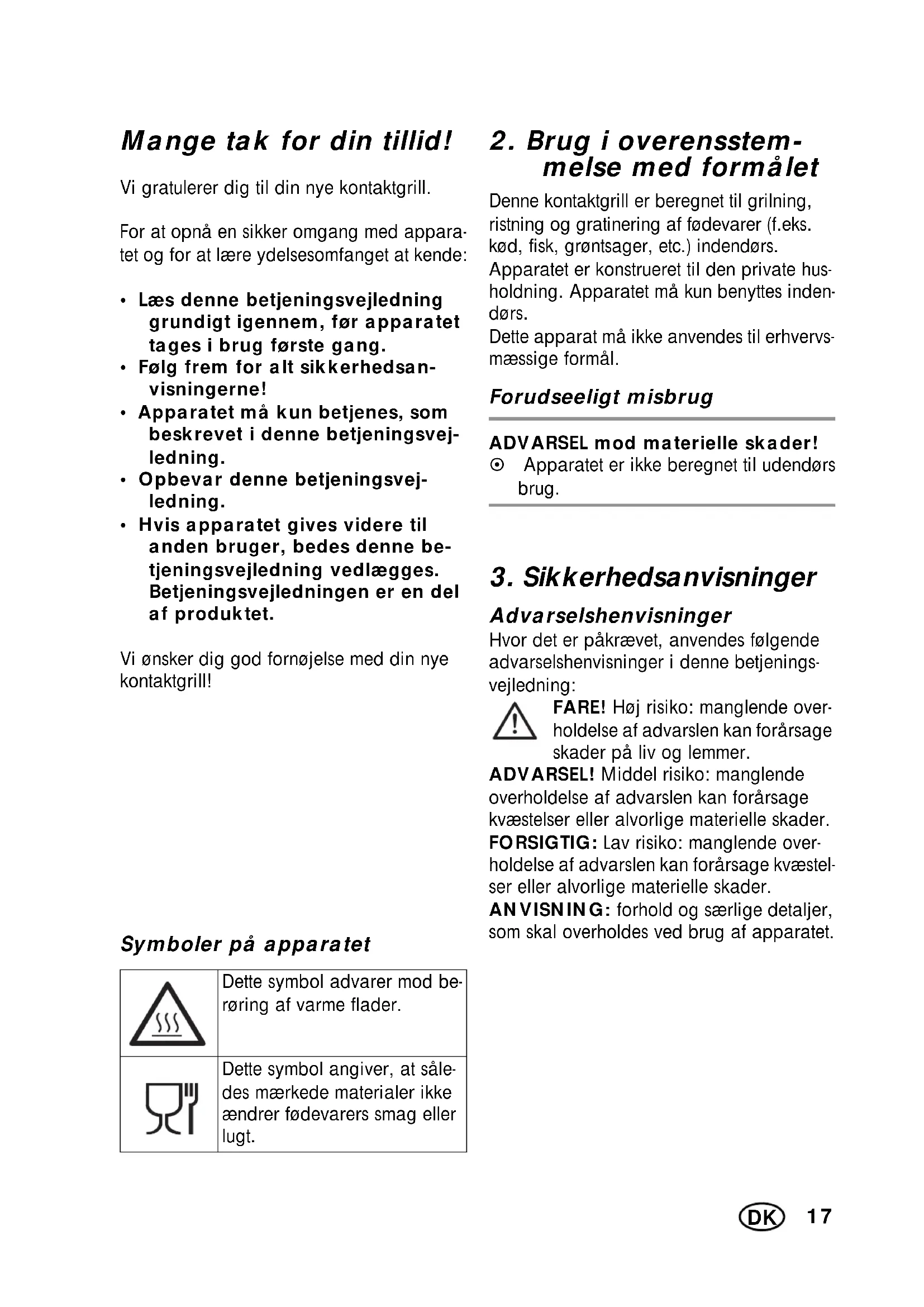 melse med formålet Denne kontaktgrill er beregnet til grilning, ristning og gratinering af fødevarer (f.eks. kød, fisk, grøntsager, etc.) indendørs. Apparatet er konstrueret til den private hus- holdning. Apparatet må kun benyttes inden- dørs. Dette apparat må ikke anvendes til erhvervs- mæssige formål. Forudseeligt misbrug ADVARSEL mod materielle skader! ~ Apparatet er ikke beregnet til udendørs brug.