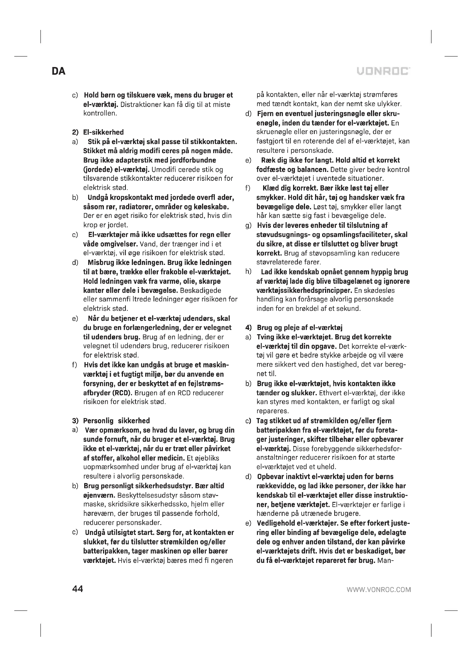 Før rengøring og vedligeholdelse skal du altid slukke for maskinen og trække netstikket ud af kontakten. Rengør maskinbeklædningerne regelmæssigt med en blød klud, helst efter hver anvendelse. Sørg for, at der ikke er støv eller snavs i ventilationsåbnin- gerne. Fjern snavs, der sidder meget godt fast, med en blød klud, der er fugtet i sæbevand. Brug ikke opløsningsmidler, som f.eks. benzin, sprit, ammoniak osv. Kemikalier som disse beskadiger de syntetiske komponenter. MILJØ Defekte og/eller bortskaffede elektriske og elektroniske apparater skal afl everes på en passende genbrugsstation. Kun for lande i EU Maskinværktøj må ikke bortskaffes sammen med husholdningsaffald. Ifølge EC-direktiv 2012/19/ EU om affald af elektrisk og elektronisk udstyr og dets gennemførelse i den nationale lovgivning skal maskinværktøjer, der ikke længere anvendes, afl everes separat og bortskaffes på en miljøvenlig måde. GARANTI VONROC-produkter er udviklet til de højeste kva- litetsstandarder og er garanteret fri for defekter i både materialer og udførelse i den periode, der er retsligt angivet fra datoen for det originale køb. Hvis produktet skulle udvikle fejl i denne periode på grund af defekt materiale og/eller udførelse, bedes du kontakte VONROC direkte. Følgende omstændigheder er udelukket fra denne garanti: