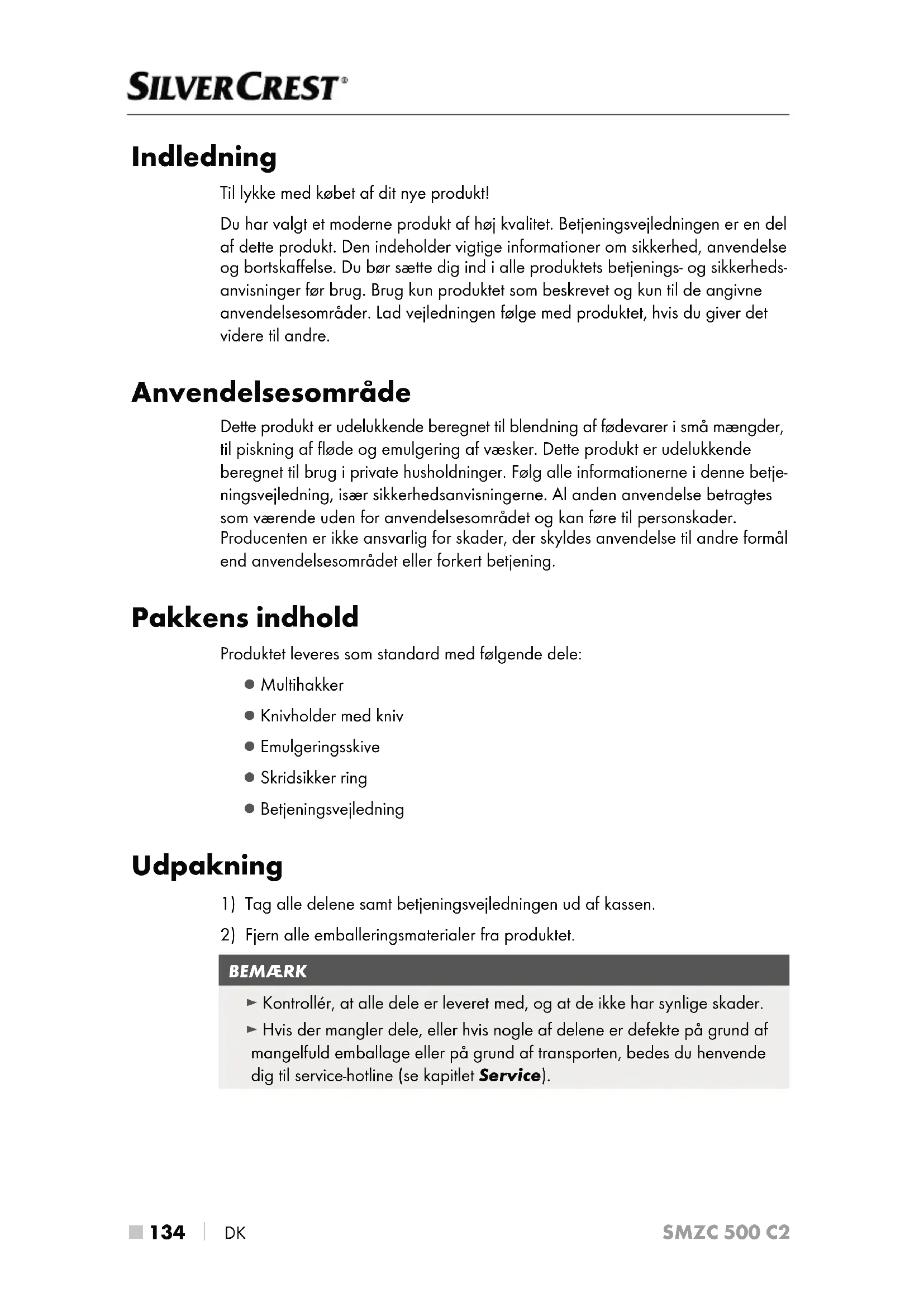 DK Indledning Til lykke med købet af dit nye produkt! Du har valgt et moderne produkt af høj kvalitet. Betjeningsvejledningen er en del af dette produkt. Den indeholder vigtige informationer om sikkerhed, anvendelse og bortskaffelse. Du bør sætte dig ind i alle produktets betjenings- og sikkerheds- anvisninger før brug. Brug kun produktet som beskrevet og kun til de angivne anvendelsesområder. Lad vejledningen følge med produktet, hvis du giver det videre til andre. Anvendelsesområde Dette produkt er udelukkende beregnet til blendning af fødevarer i små mængder, til piskning af fløde og emulgering af væsker. Dette produkt er udelukkende beregnet til brug i private husholdninger. Følg alle informationerne i denne betje- ningsvejledning, især sikkerhedsanvisningerne. Al anden anvendelse betragtes som værende uden for anvendelsesområdet og kan føre til personskader. Producenten er ikke ansvarlig for skader, der skyldes anvendelse til andre formål end anvendelsesområdet eller forkert betjening. Pakkens indhold Produktet leveres som standard med følgende dele: ▯ Multihakker ▯ Knivholder med kniv ▯ Emulgeringsskive ▯ Skridsikker ring ▯ Betjeningsvejledning Udpakning
